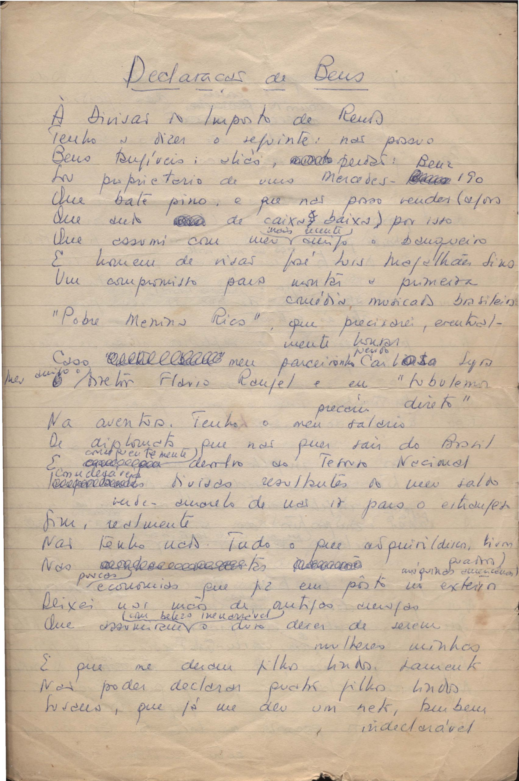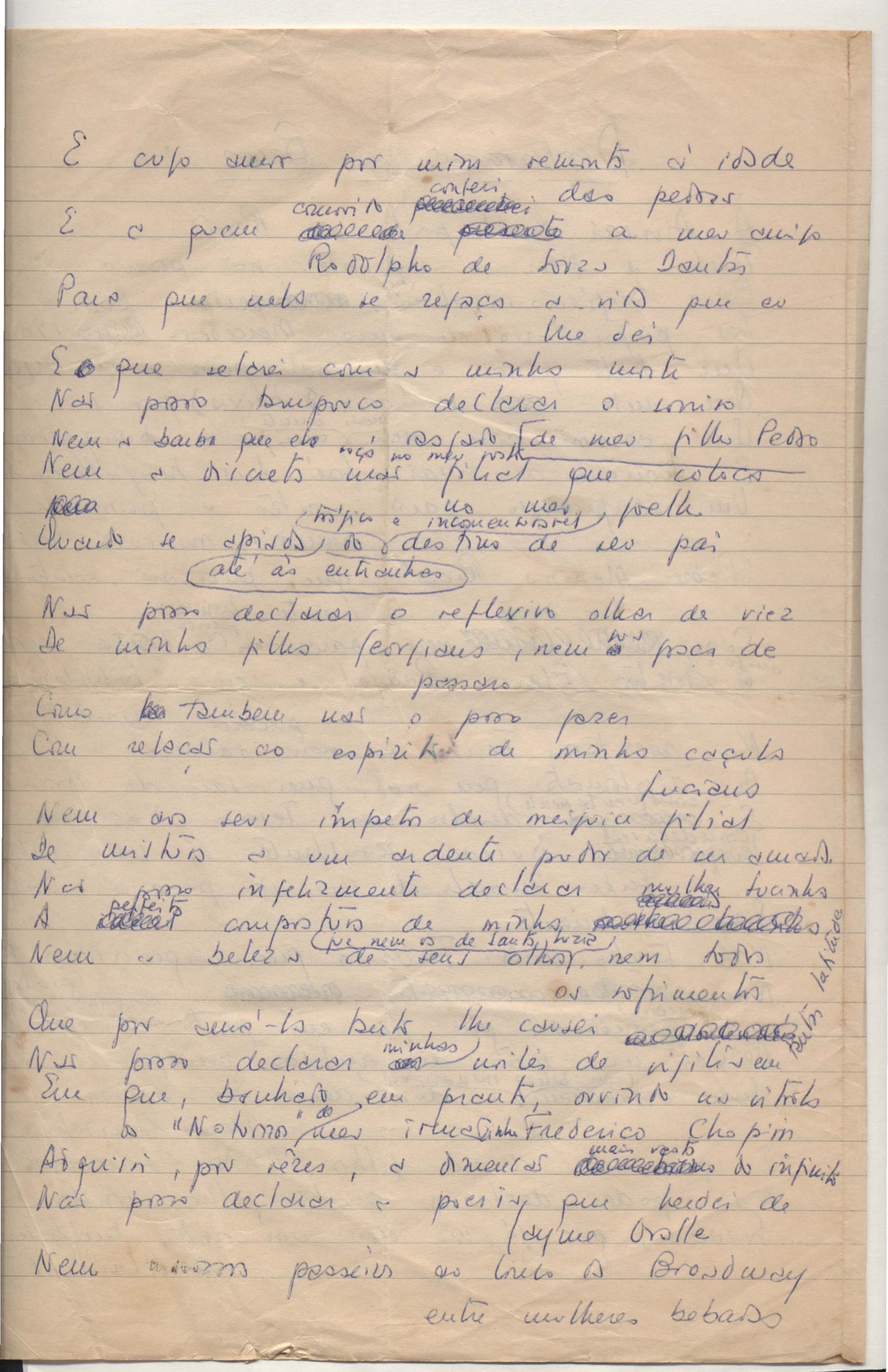 Poema. Há, no dossiê, vários rascunhos e poemas esparsos e inéditos. Alguns poemas do dossiê são encontrados também na primeira leva de documentos doados, e que faz parte do primeiro inventário. Na mesma página do poema "Quisera tanto" há o poema "Namorada". Há nota nos poemas: "Cada vez que eu penso nela", "O dia de Oxalá", "Menina, não banha nua" e "A morte sem pedágio".