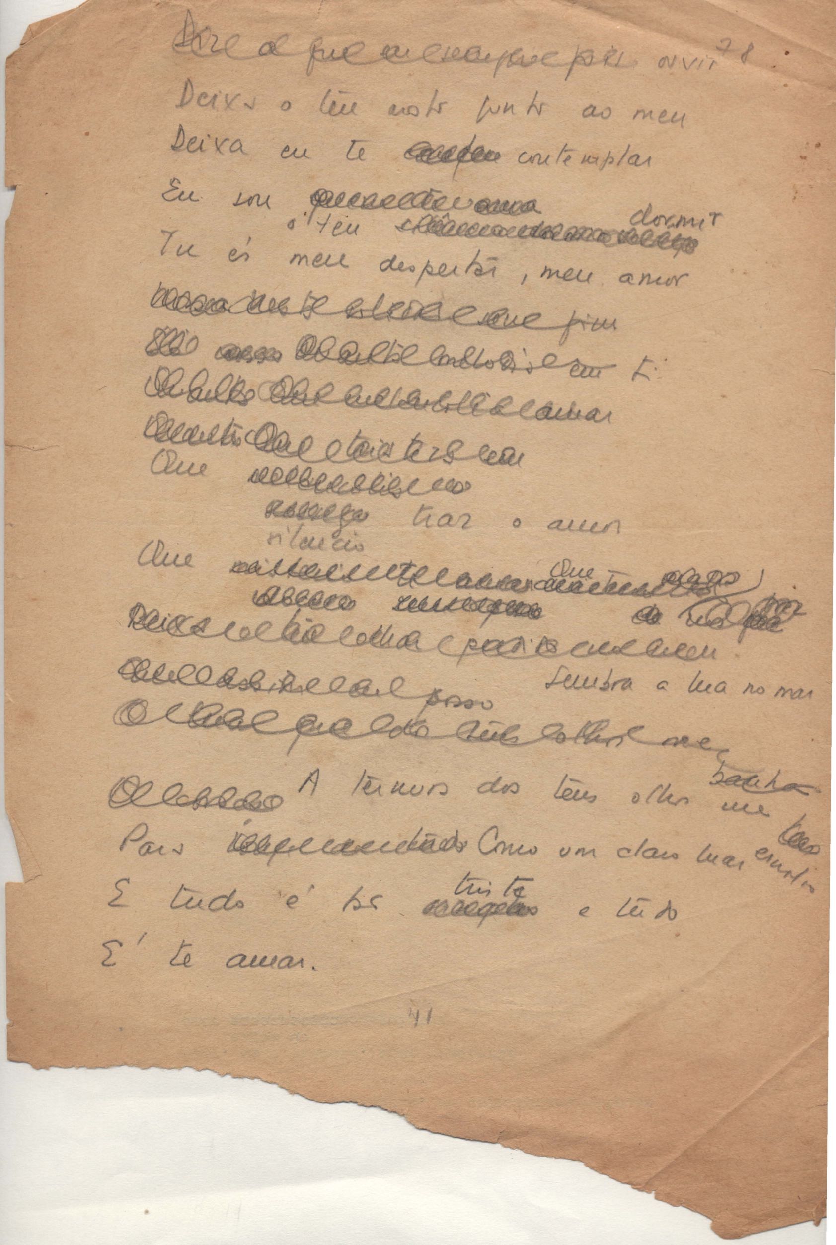 Poema. Há, no dossiê, vários rascunhos e poemas esparsos e inéditos. Alguns poemas do dossiê são encontrados também na primeira leva de documentos doados, e que faz parte do primeiro inventário. Na mesma página do poema "Quisera tanto" há o poema "Namorada". Há nota nos poemas: "Cada vez que eu penso nela", "O dia de Oxalá", "Menina, não banha nua" e "A morte sem pedágio".