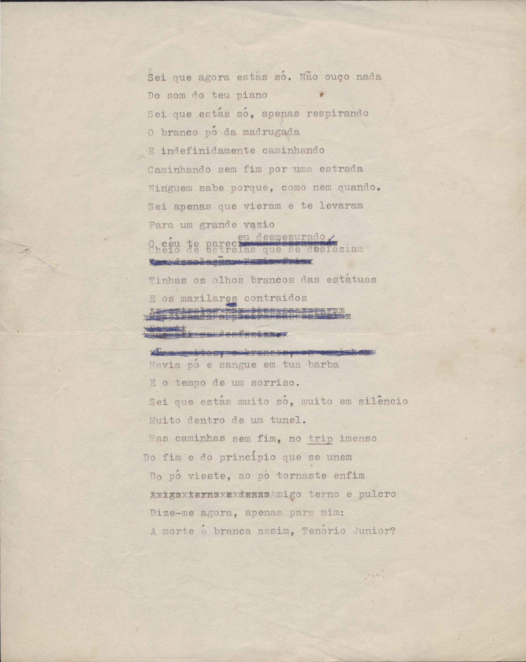 Poema. Há, no dossiê, vários rascunhos e poemas esparsos e inéditos. Alguns poemas do dossiê são encontrados também na primeira leva de documentos doados, e que faz parte do primeiro inventário. Na mesma página do poema "Quisera tanto" há o poema "Namorada". Há nota nos poemas: "Cada vez que eu penso nela", "O dia de Oxalá", "Menina, não banha nua" e "A morte sem pedágio".