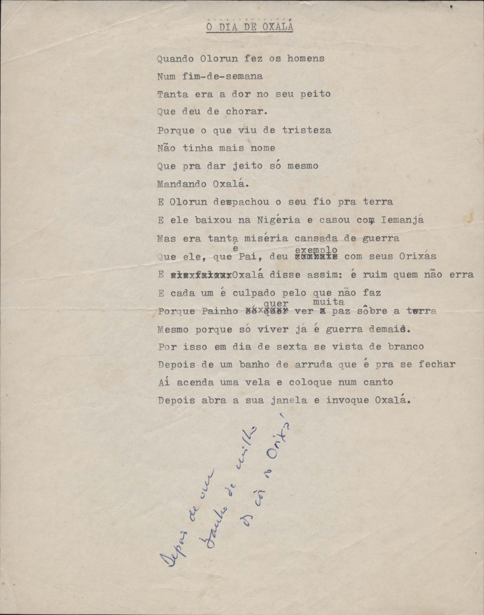 Poema. Há, no dossiê, vários rascunhos e poemas esparsos e inéditos. Alguns poemas do dossiê são encontrados também na primeira leva de documentos doados, e que faz parte do primeiro inventário. Na mesma página do poema "Quisera tanto" há o poema "Namorada". Há nota nos poemas: "Cada vez que eu penso nela", "O dia de Oxalá", "Menina, não banha nua" e "A morte sem pedágio".