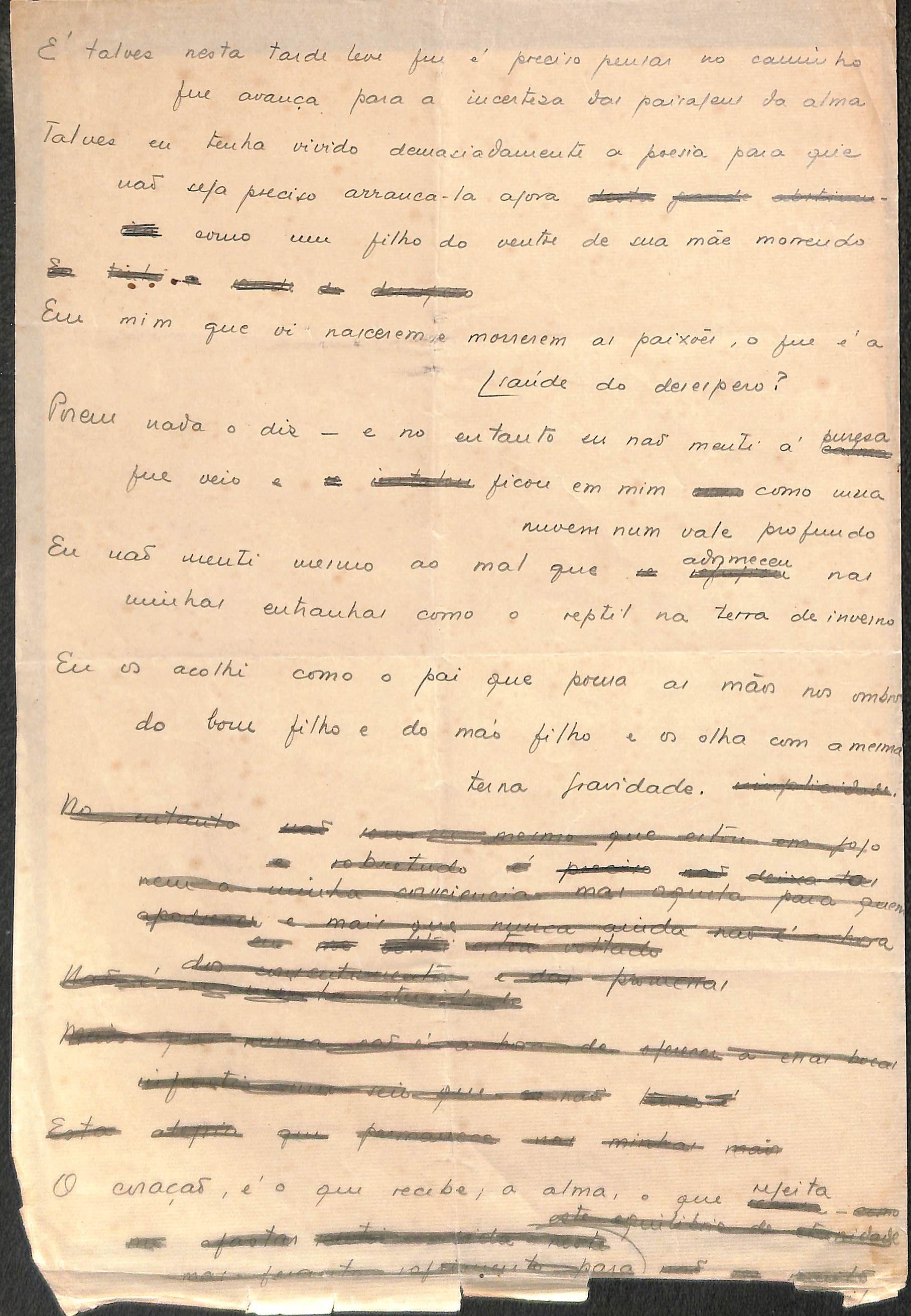 Poema. Há, no dossiê, vários rascunhos e poemas esparsos e inéditos. Alguns poemas do dossiê são encontrados também na primeira leva de documentos doados, e que faz parte do primeiro inventário. Na mesma página do poema "Quisera tanto" há o poema "Namorada". Há nota nos poemas: "Cada vez que eu penso nela", "O dia de Oxalá", "Menina, não banha nua" e "A morte sem pedágio".