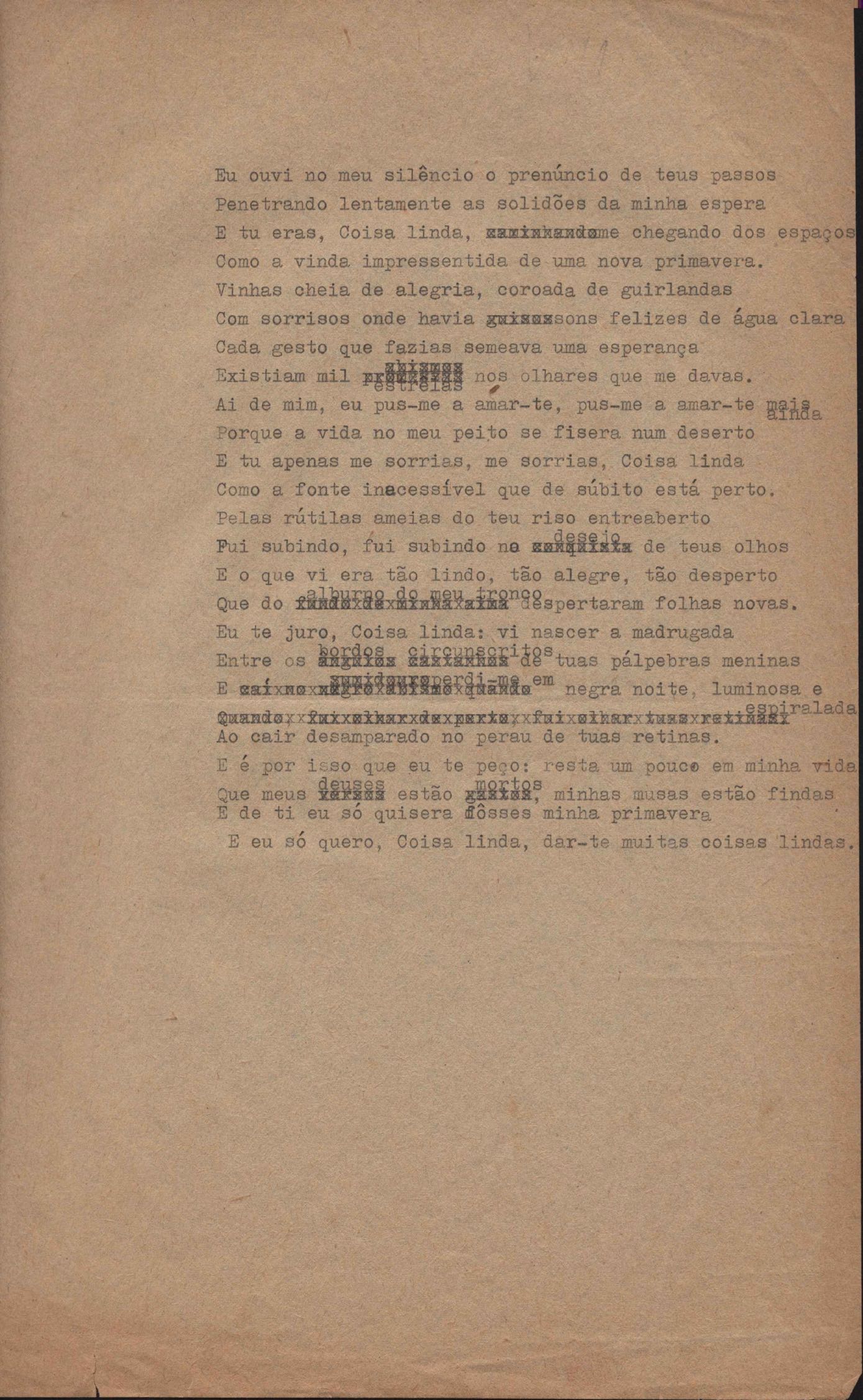 Poema. Há, no dossiê, vários rascunhos e poemas esparsos e inéditos. Alguns poemas do dossiê são encontrados também na primeira leva de documentos doados, e que faz parte do primeiro inventário. Na mesma página do poema "Quisera tanto" há o poema "Namorada". Há nota nos poemas: "Cada vez que eu penso nela", "O dia de Oxalá", "Menina, não banha nua" e "A morte sem pedágio".