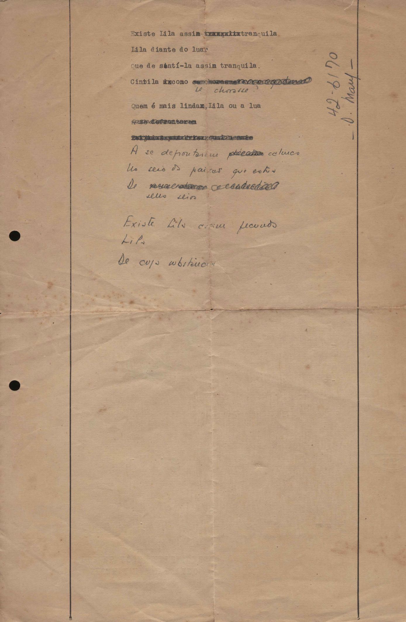 Poema. Há, no dossiê, vários rascunhos e poemas esparsos e inéditos. Alguns poemas do dossiê são encontrados também na primeira leva de documentos doados, e que faz parte do primeiro inventário. Na mesma página do poema "Quisera tanto" há o poema "Namorada". Há nota nos poemas: "Cada vez que eu penso nela", "O dia de Oxalá", "Menina, não banha nua" e "A morte sem pedágio".