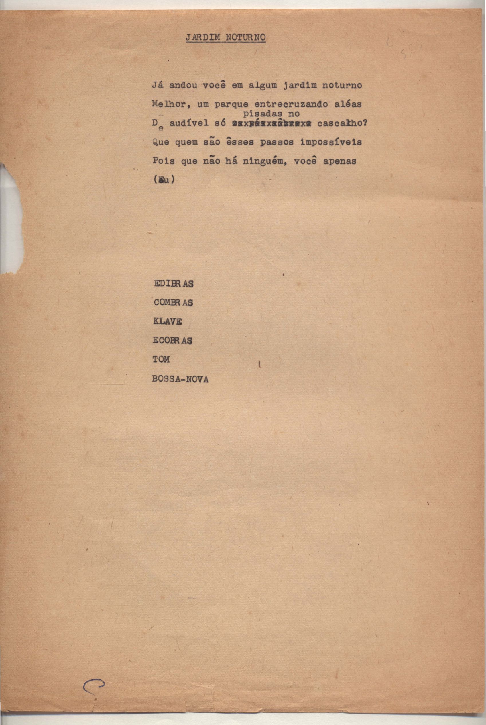 Poema. Há, no dossiê, vários rascunhos e poemas esparsos e inéditos. Alguns poemas do dossiê são encontrados também na primeira leva de documentos doados, e que faz parte do primeiro inventário. Na mesma página do poema "Quisera tanto" há o poema "Namorada". Há nota nos poemas: "Cada vez que eu penso nela", "O dia de Oxalá", "Menina, não banha nua" e "A morte sem pedágio".