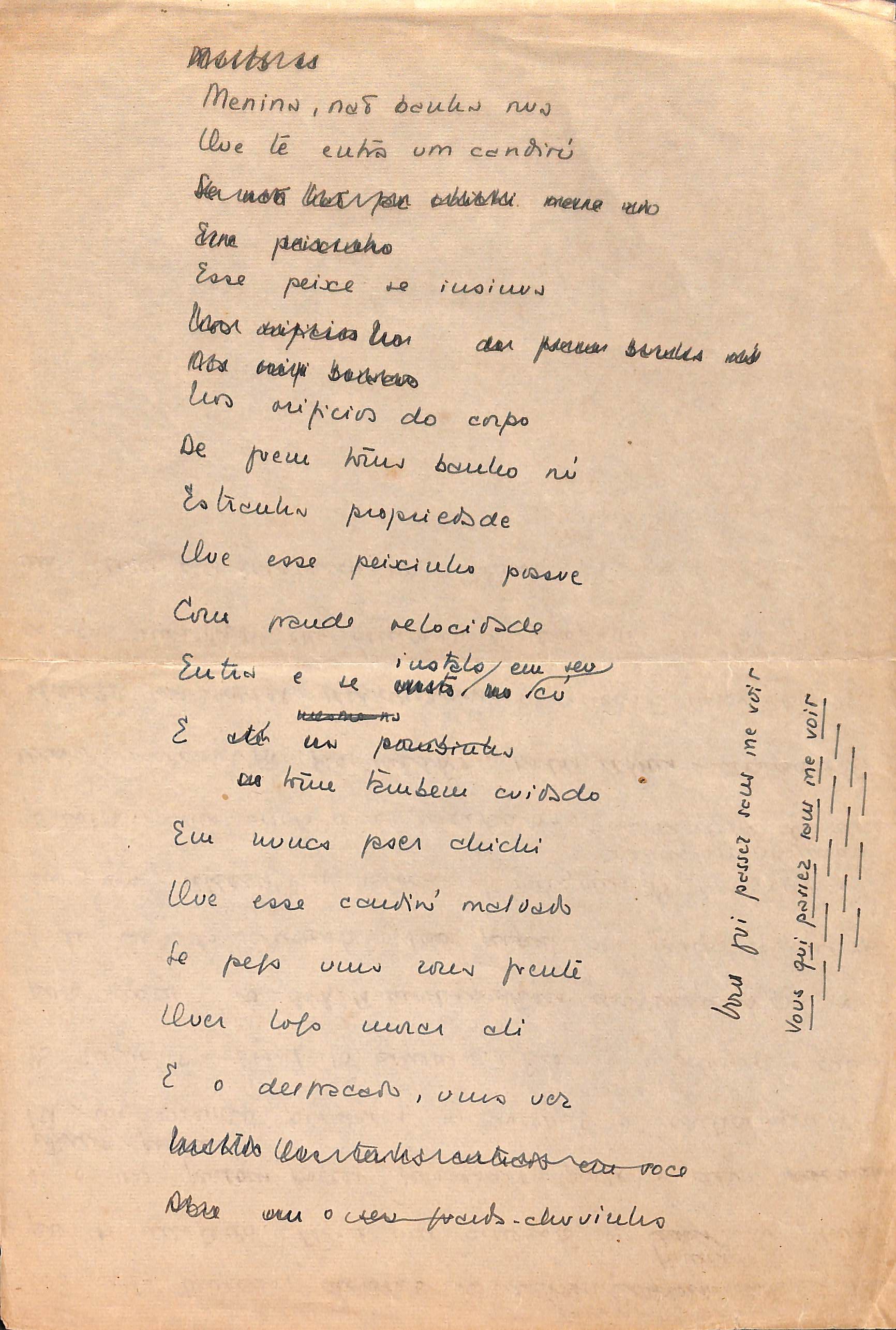 Poema. Há, no dossiê, vários rascunhos e poemas esparsos e inéditos. Alguns poemas do dossiê são encontrados também na primeira leva de documentos doados, e que faz parte do primeiro inventário. Na mesma página do poema "Quisera tanto" há o poema "Namorada". Há nota nos poemas: "Cada vez que eu penso nela", "O dia de Oxalá", "Menina, não banha nua" e "A morte sem pedágio".
