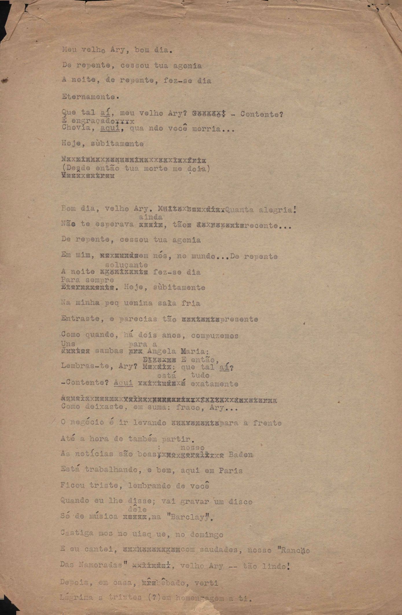Poema. Há, no dossiê, vários rascunhos e poemas esparsos e inéditos. Alguns poemas do dossiê são encontrados também na primeira leva de documentos doados, e que faz parte do primeiro inventário. Na mesma página do poema "Quisera tanto" há o poema "Namorada". Há nota nos poemas: "Cada vez que eu penso nela", "O dia de Oxalá", "Menina, não banha nua" e "A morte sem pedágio".