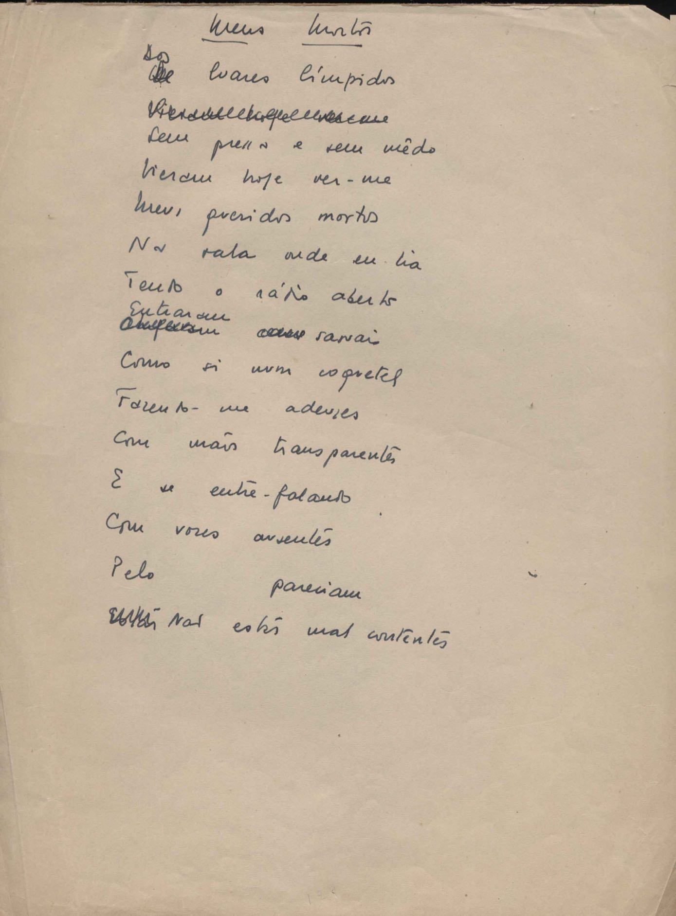 Poema. Há, no dossiê, vários rascunhos e poemas esparsos e inéditos. Alguns poemas do dossiê são encontrados também na primeira leva de documentos doados, e que faz parte do primeiro inventário. Na mesma página do poema "Quisera tanto" há o poema "Namorada". Há nota nos poemas: "Cada vez que eu penso nela", "O dia de Oxalá", "Menina, não banha nua" e "A morte sem pedágio".