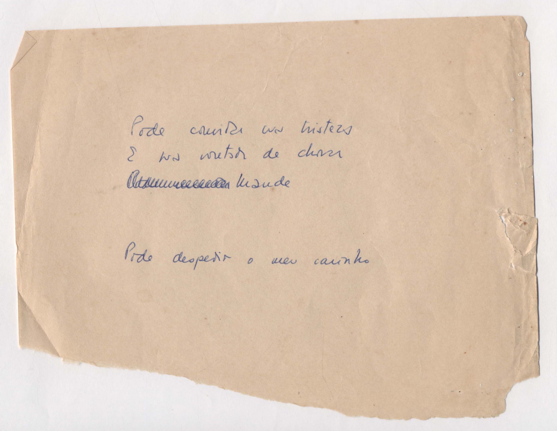 Poema. Há, no dossiê, vários rascunhos e poemas esparsos e inéditos. Alguns poemas do dossiê são encontrados também na primeira leva de documentos doados, e que faz parte do primeiro inventário. Na mesma página do poema "Quisera tanto" há o poema "Namorada". Há nota nos poemas: "Cada vez que eu penso nela", "O dia de Oxalá", "Menina, não banha nua" e "A morte sem pedágio".