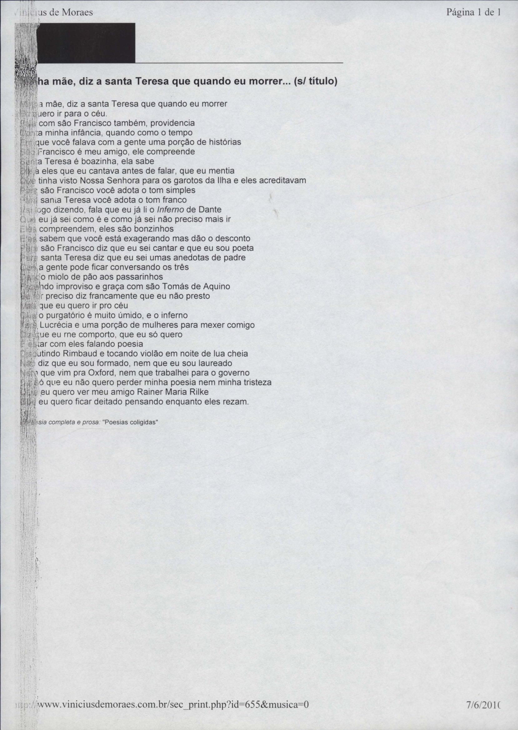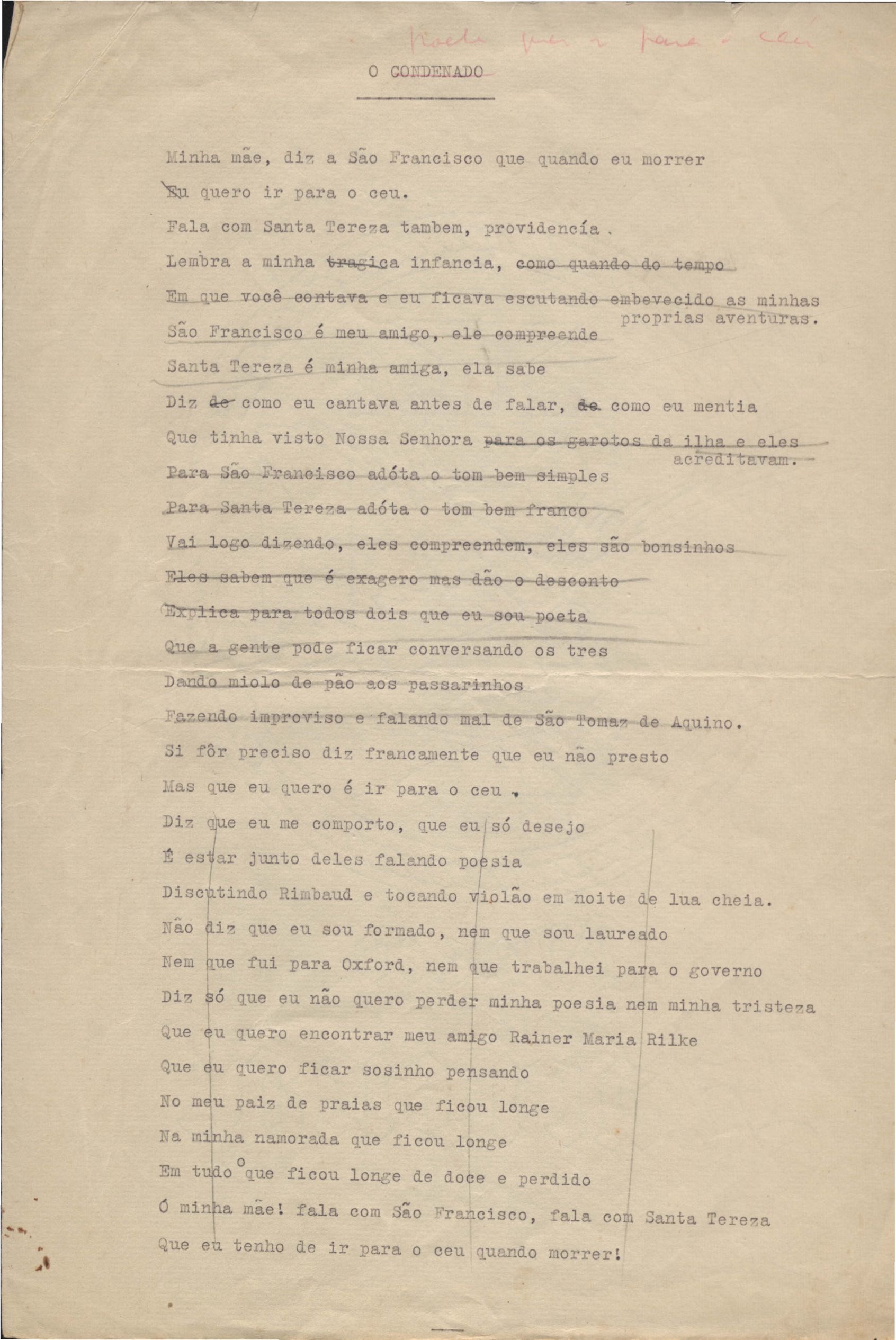 Poema. Há, no dossiê, vários rascunhos e poemas esparsos e inéditos. Alguns poemas do dossiê são encontrados também na primeira leva de documentos doados, e que faz parte do primeiro inventário. Na mesma página do poema "Quisera tanto" há o poema "Namorada". Há nota nos poemas: "Cada vez que eu penso nela", "O dia de Oxalá", "Menina, não banha nua" e "A morte sem pedágio".