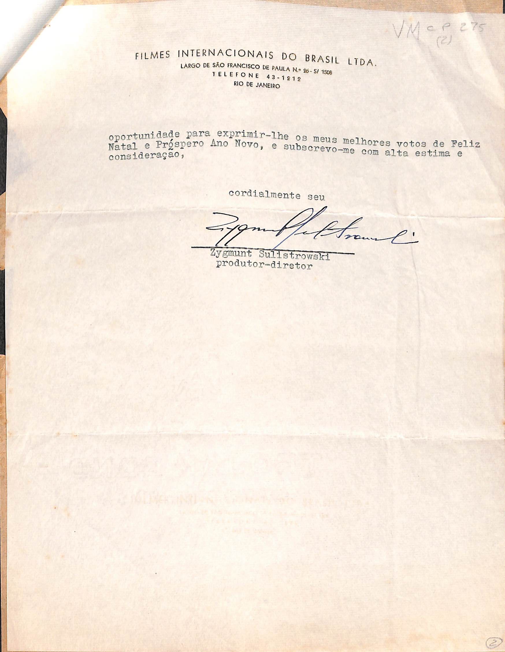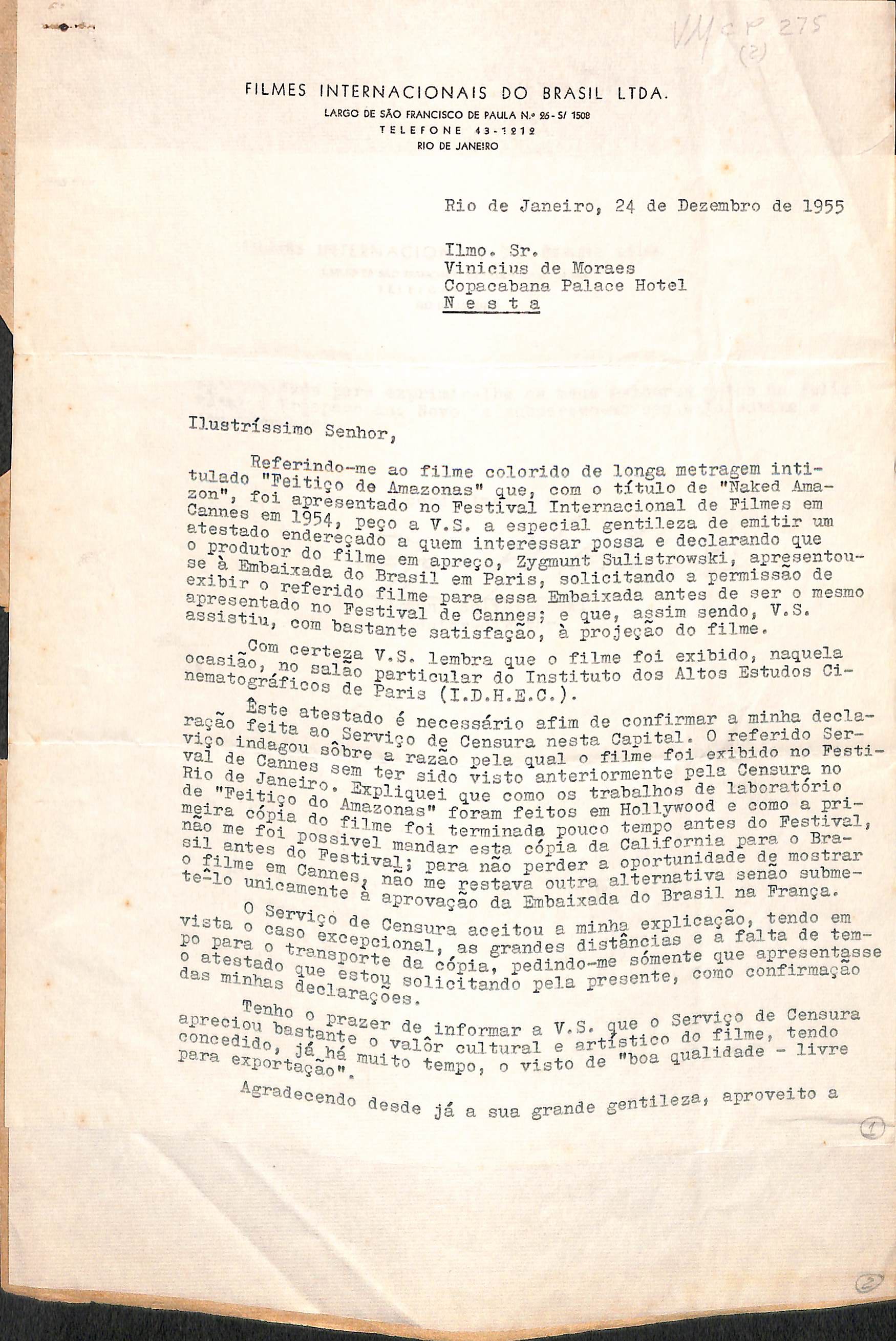 Pedido de atestado de que o filme Feitiço do Amazonas foi exibido na Embaixada do Brasil na França antes de ser enviado para o Festival de Cannes, a fim de ser apresentado ao Serviço de Censura do Brasil.