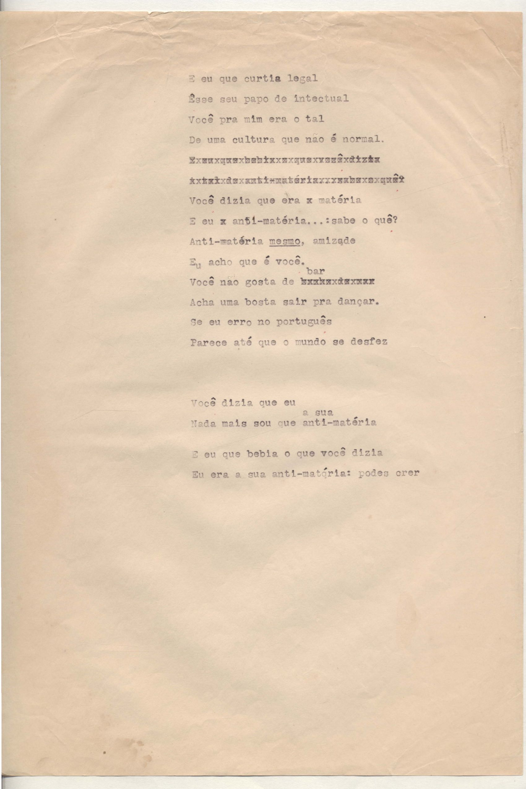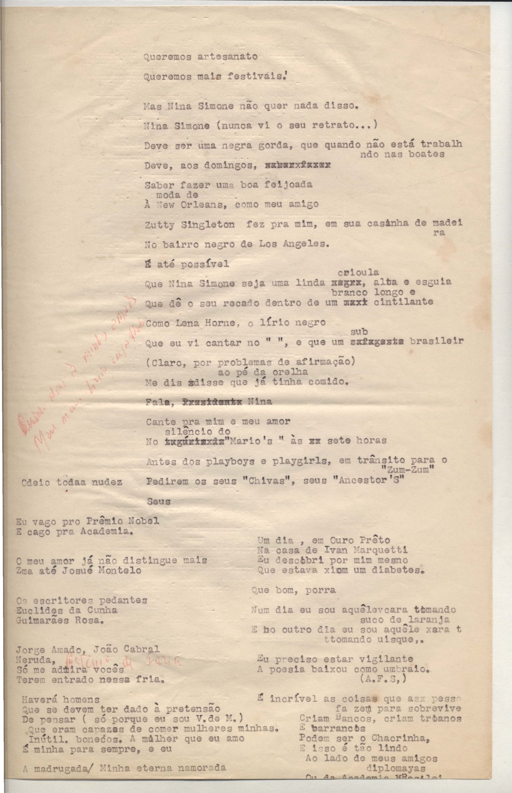 Poema. Há, no dossiê, vários rascunhos e poemas esparsos e inéditos. Alguns poemas do dossiê são encontrados também na primeira leva de documentos doados, e que faz parte do primeiro inventário. Na mesma página do poema "Quisera tanto" há o poema "Namorada". Há nota nos poemas: "Cada vez que eu penso nela", "O dia de Oxalá", "Menina, não banha nua" e "A morte sem pedágio".