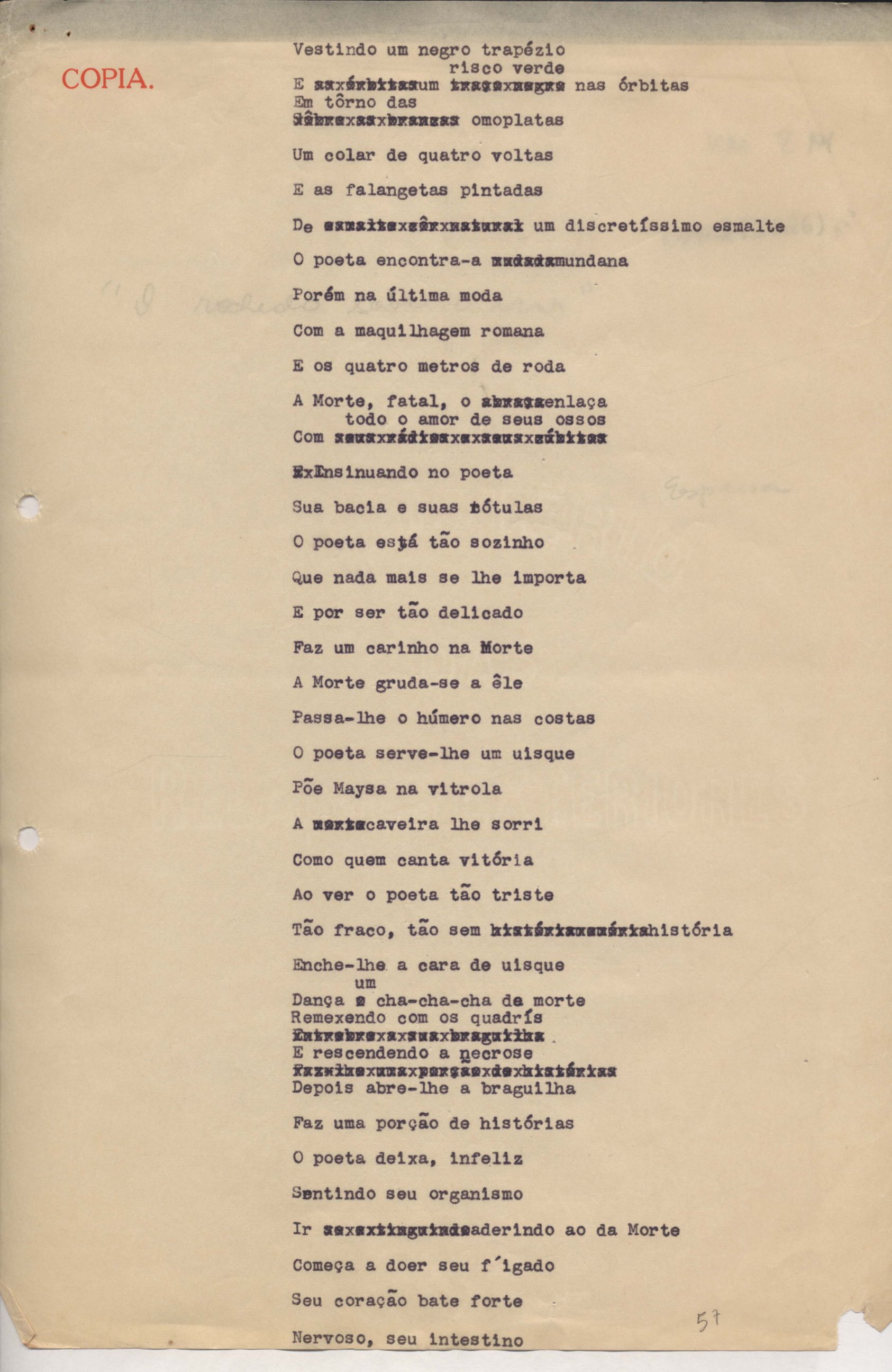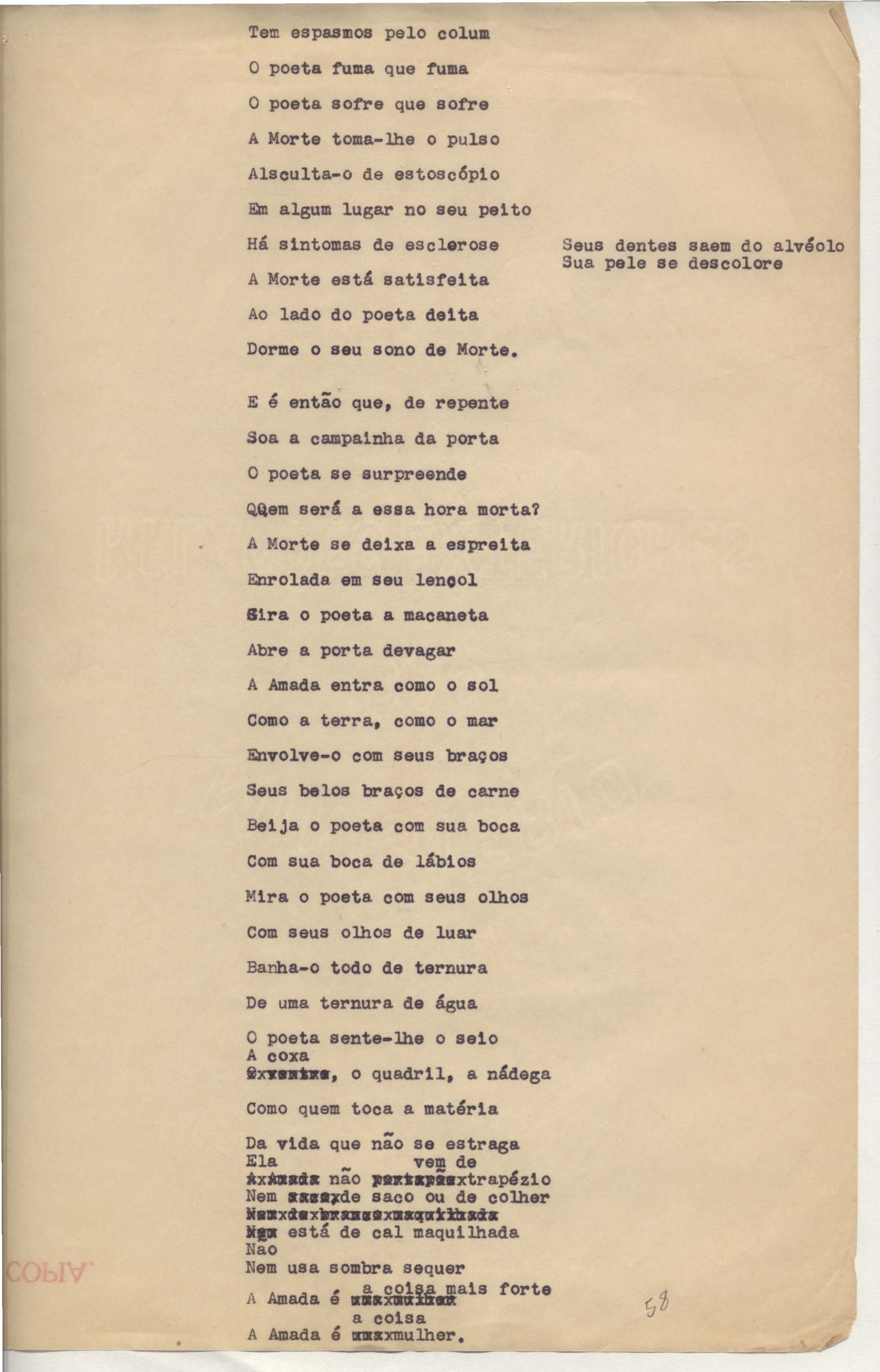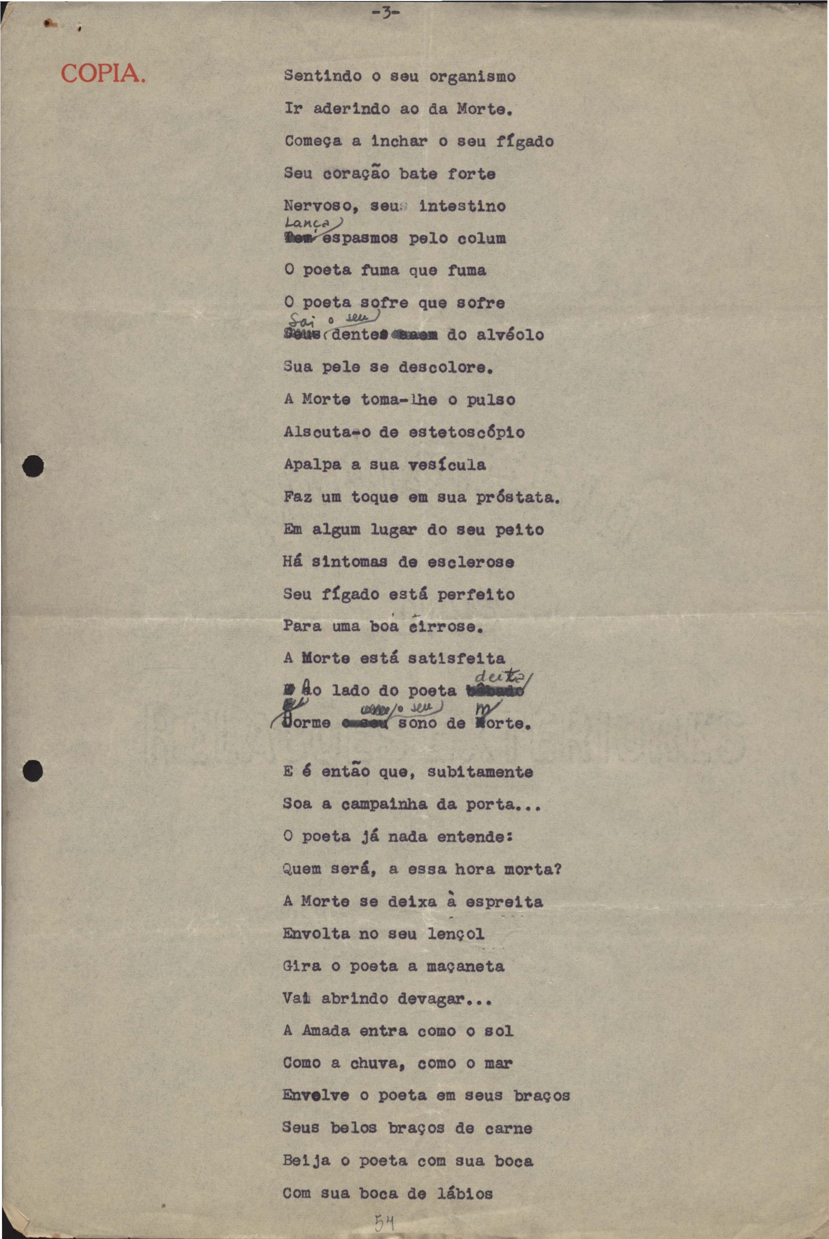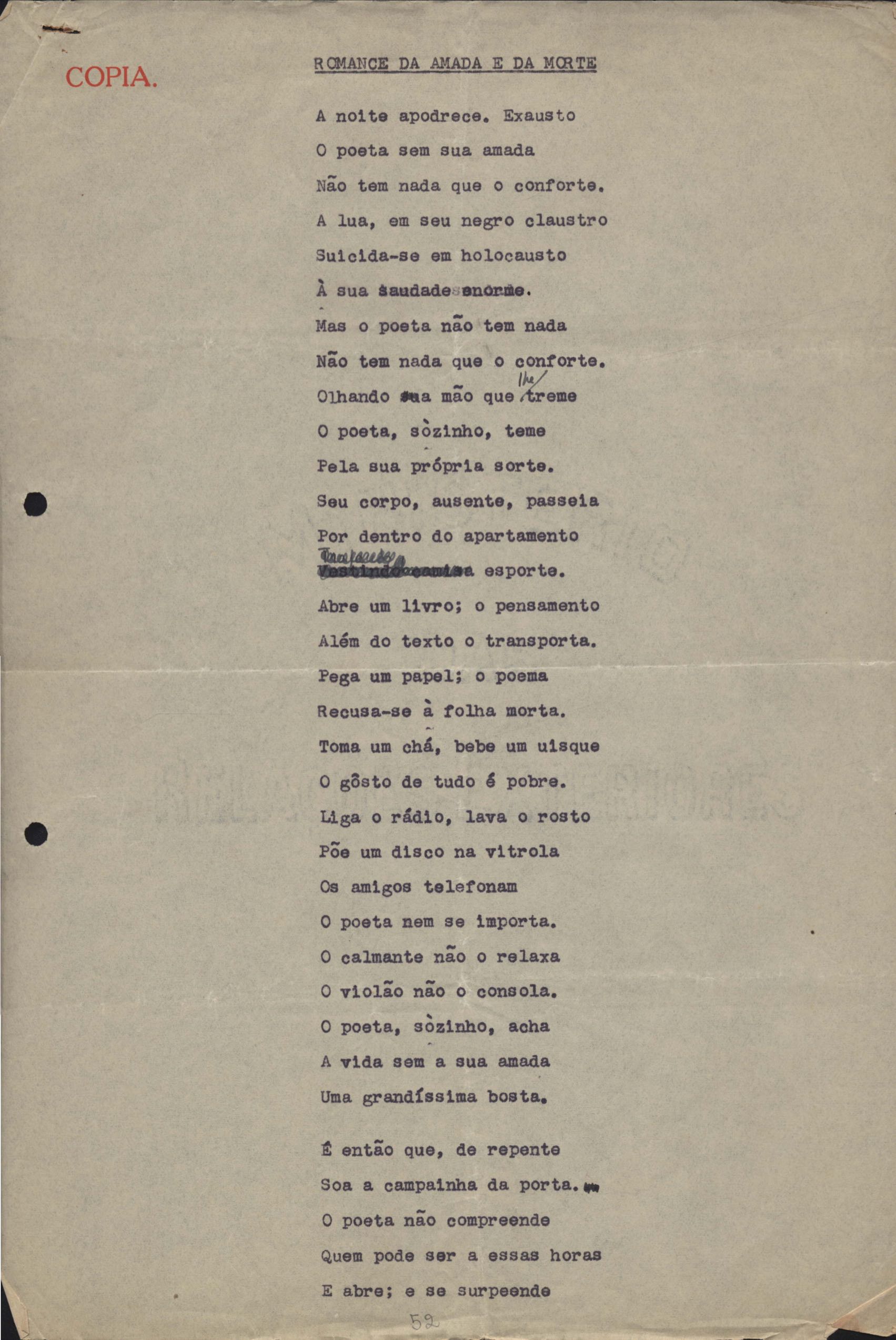 Poema. Há, no dossiê, vários rascunhos e poemas esparsos e inéditos. Alguns poemas do dossiê são encontrados também na primeira leva de documentos doados, e que faz parte do primeiro inventário. Na mesma página do poema "Quisera tanto" há o poema "Namorada". Há nota nos poemas: "Cada vez que eu penso nela", "O dia de Oxalá", "Menina, não banha nua" e "A morte sem pedágio".