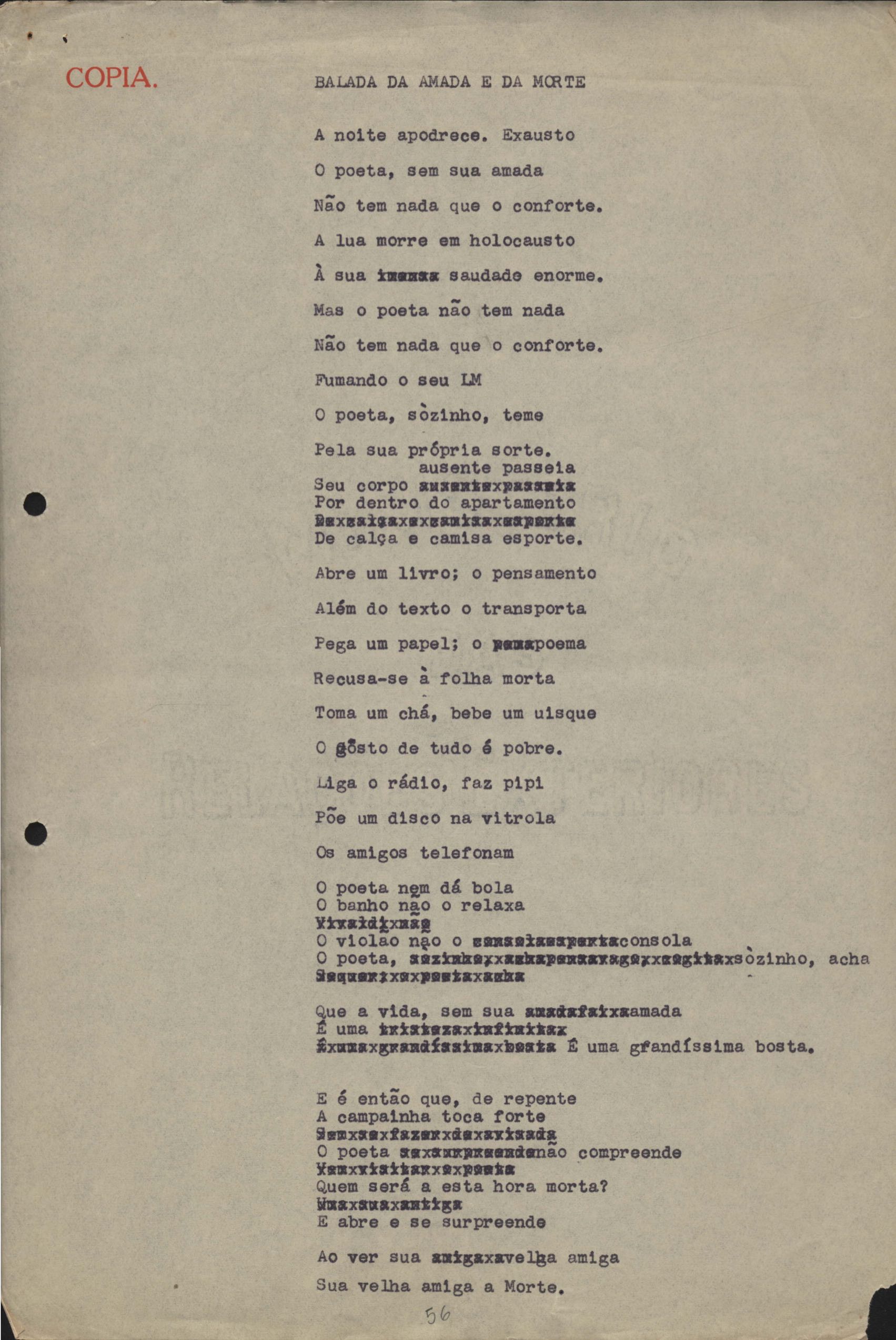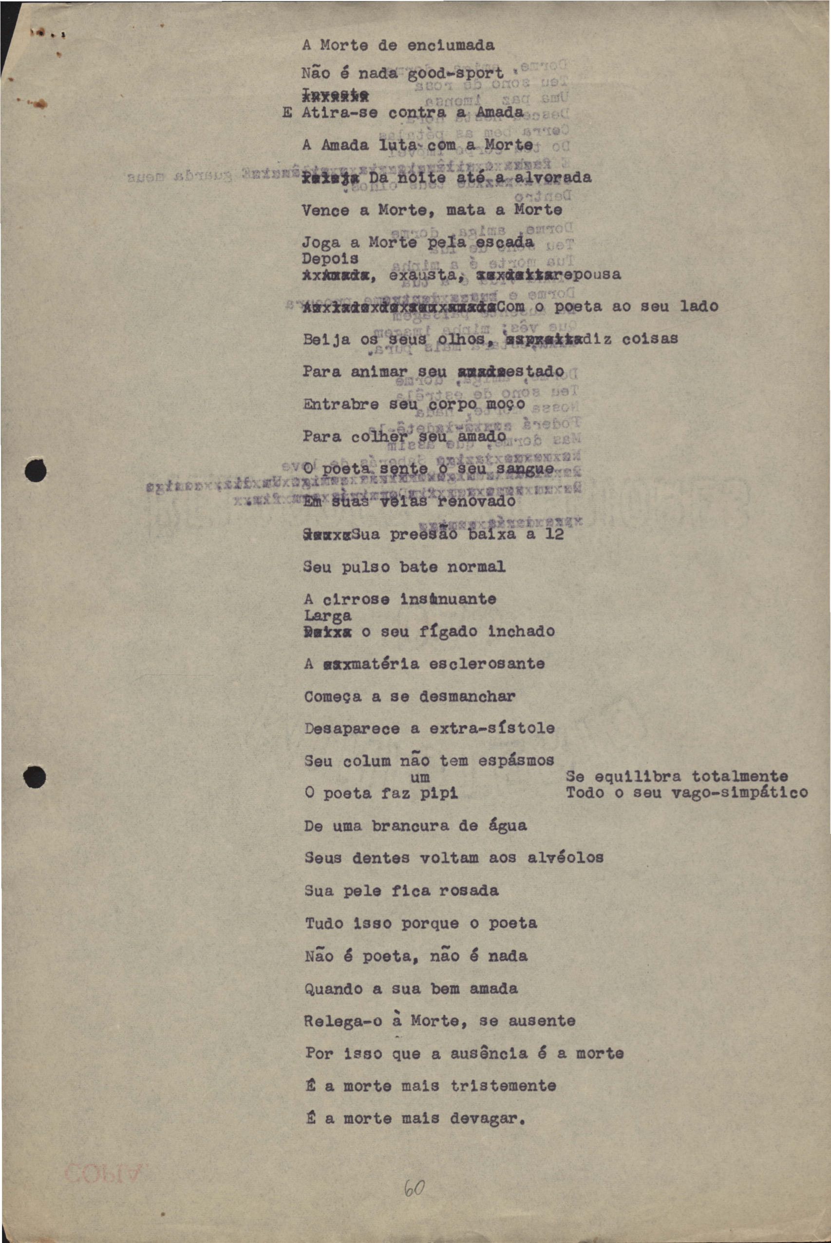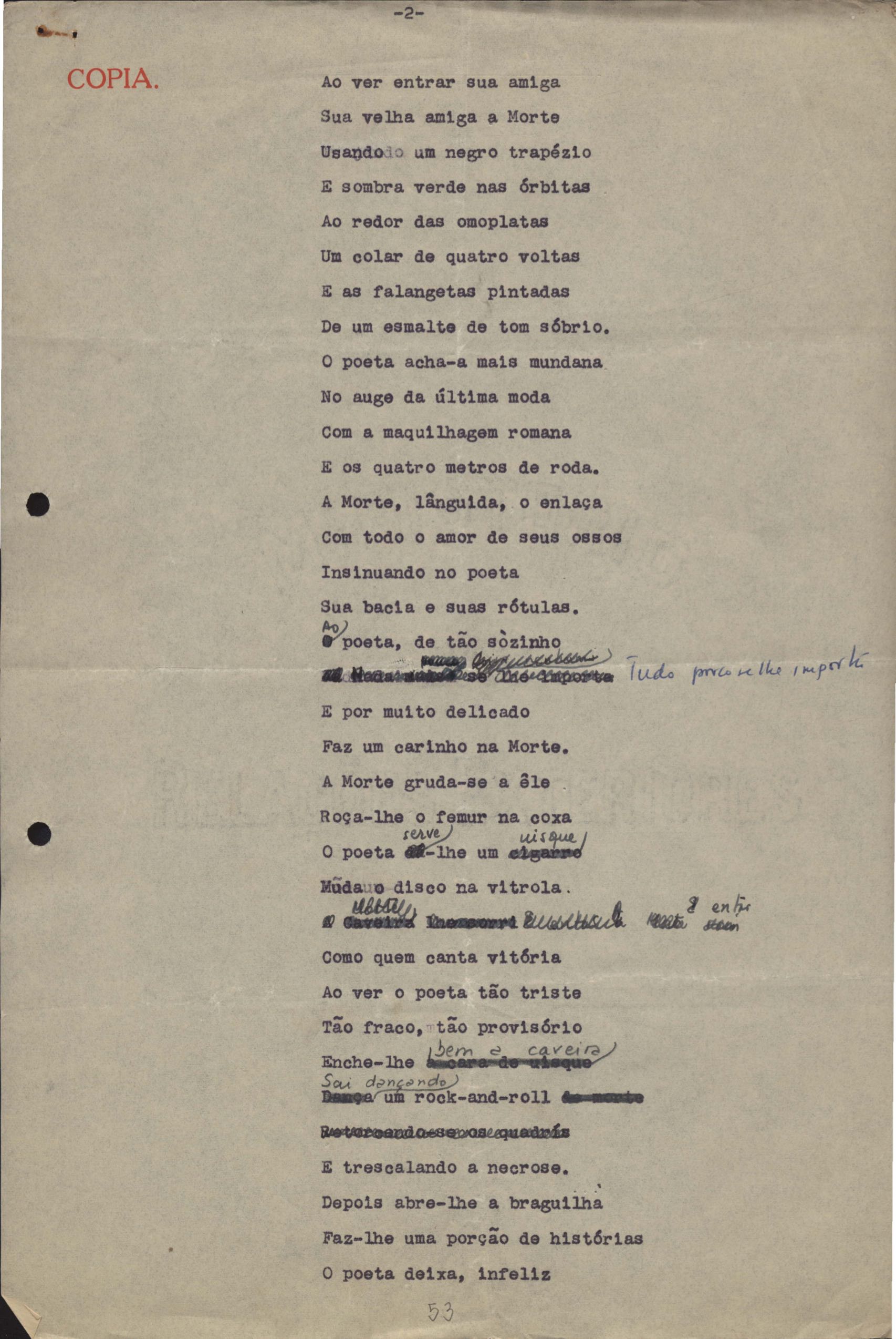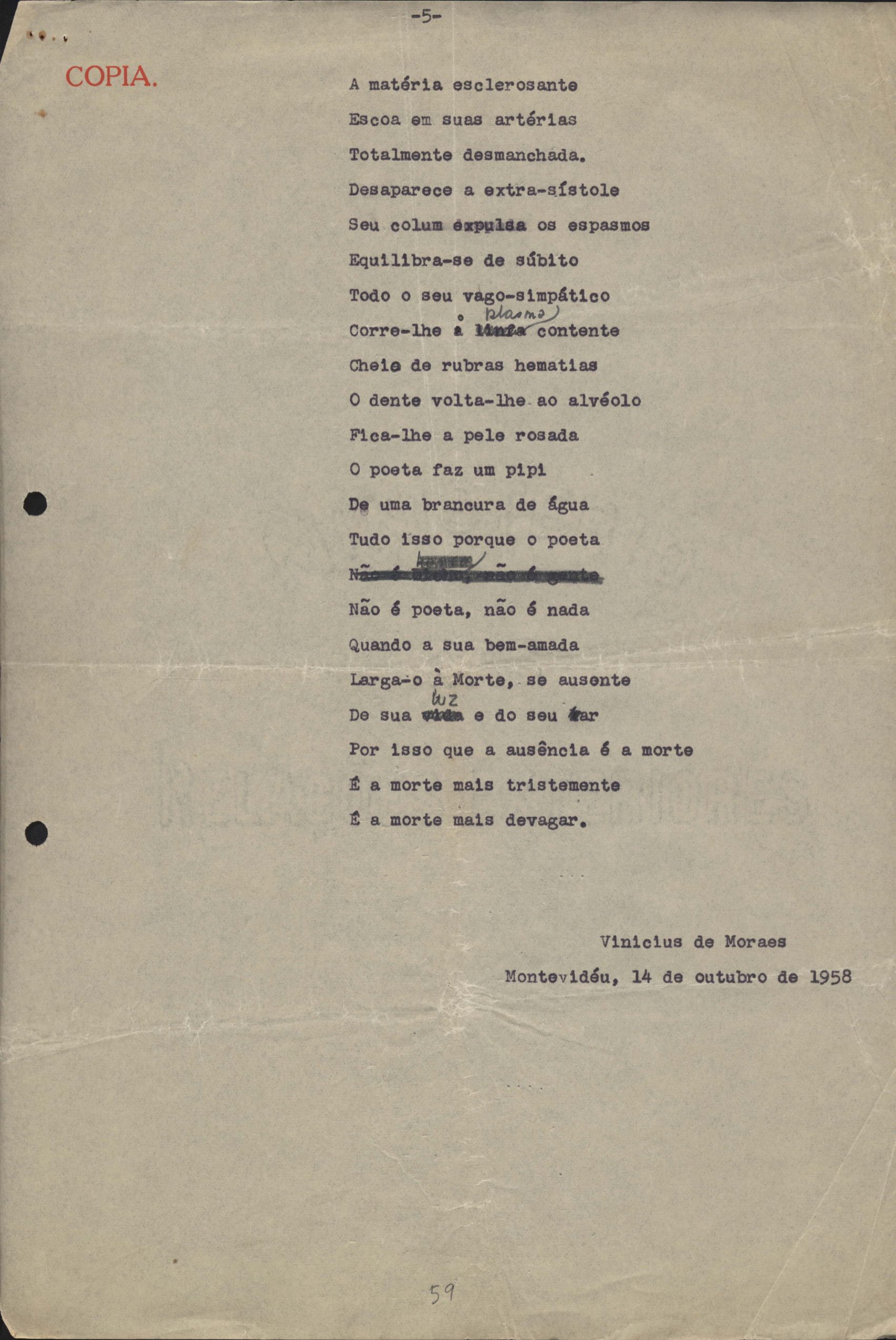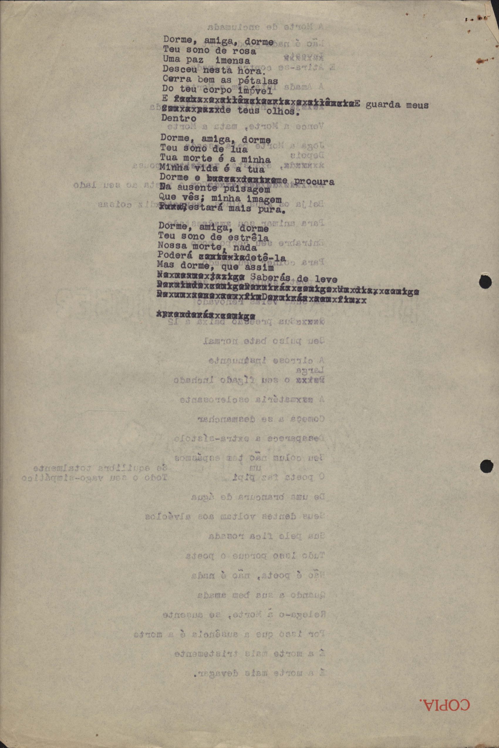 Poema. Há, no dossiê, vários rascunhos e poemas esparsos e inéditos. Alguns poemas do dossiê são encontrados também na primeira leva de documentos doados, e que faz parte do primeiro inventário. Na mesma página do poema "Quisera tanto" há o poema "Namorada". Há nota nos poemas: "Cada vez que eu penso nela", "O dia de Oxalá", "Menina, não banha nua" e "A morte sem pedágio".