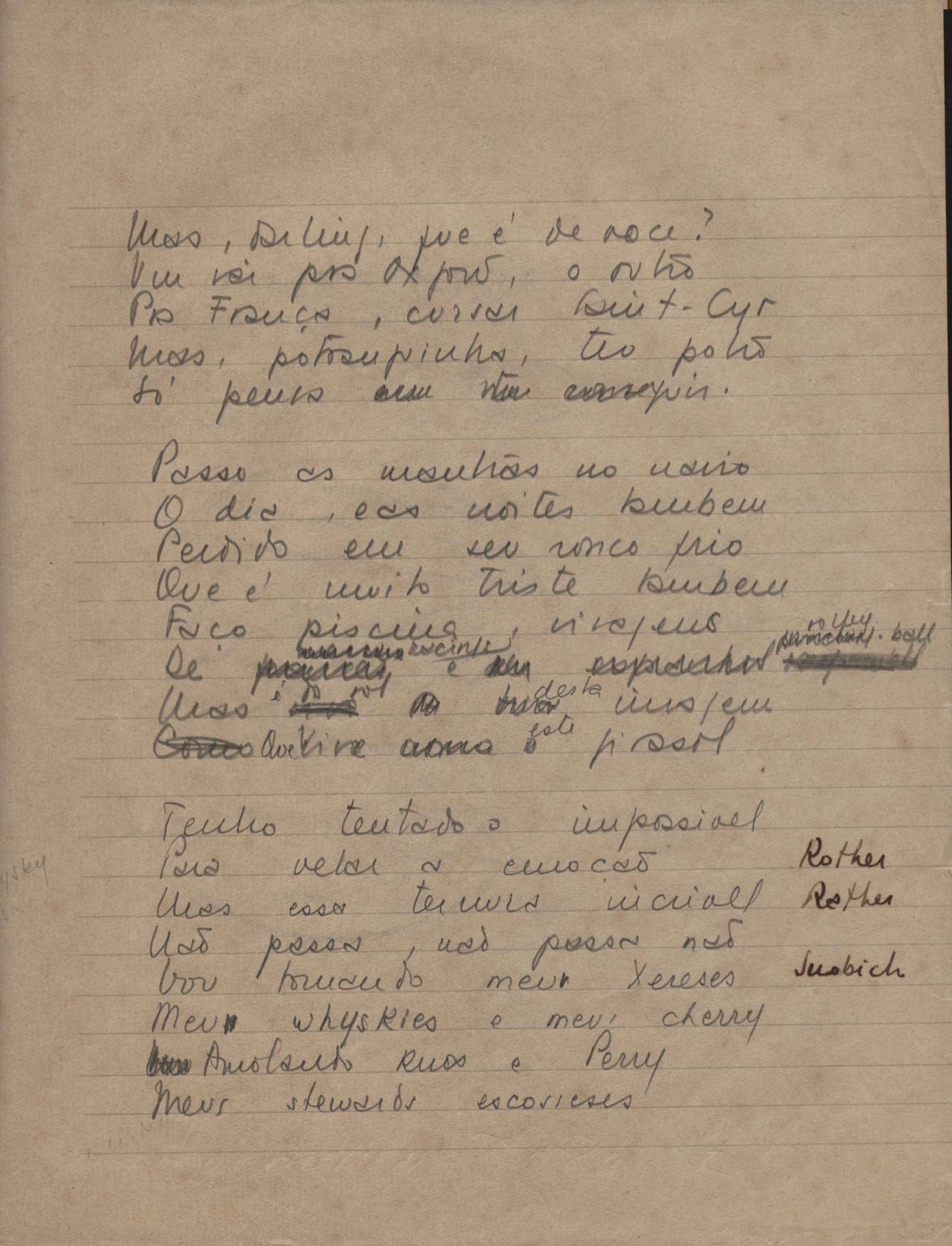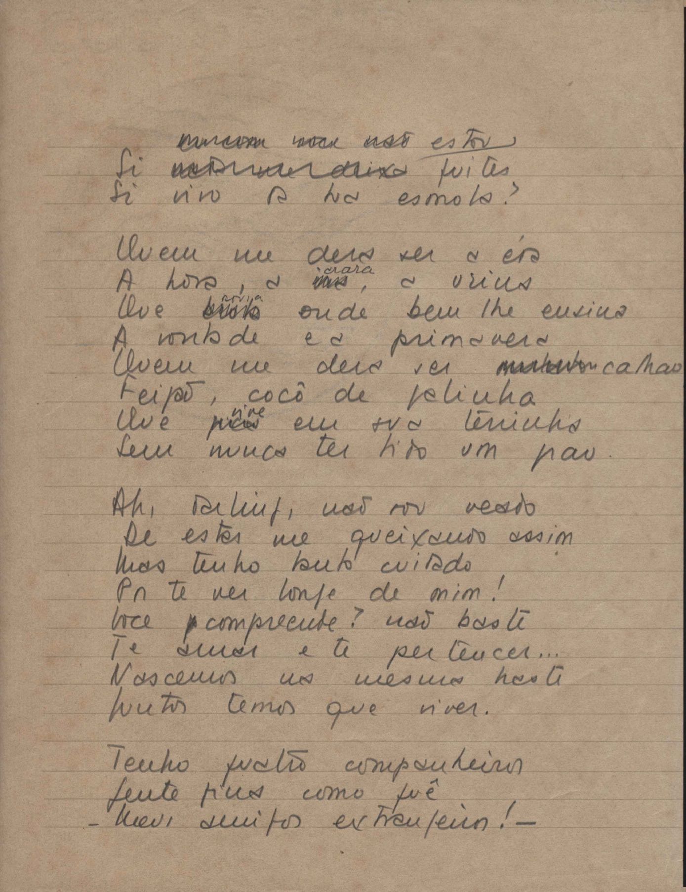 Poema. Há, no dossiê, vários rascunhos e poemas esparsos e inéditos. Alguns poemas do dossiê são encontrados também na primeira leva de documentos doados, e que faz parte do primeiro inventário. Na mesma página do poema "Quisera tanto" há o poema "Namorada". Há nota nos poemas: "Cada vez que eu penso nela", "O dia de Oxalá", "Menina, não banha nua" e "A morte sem pedágio".