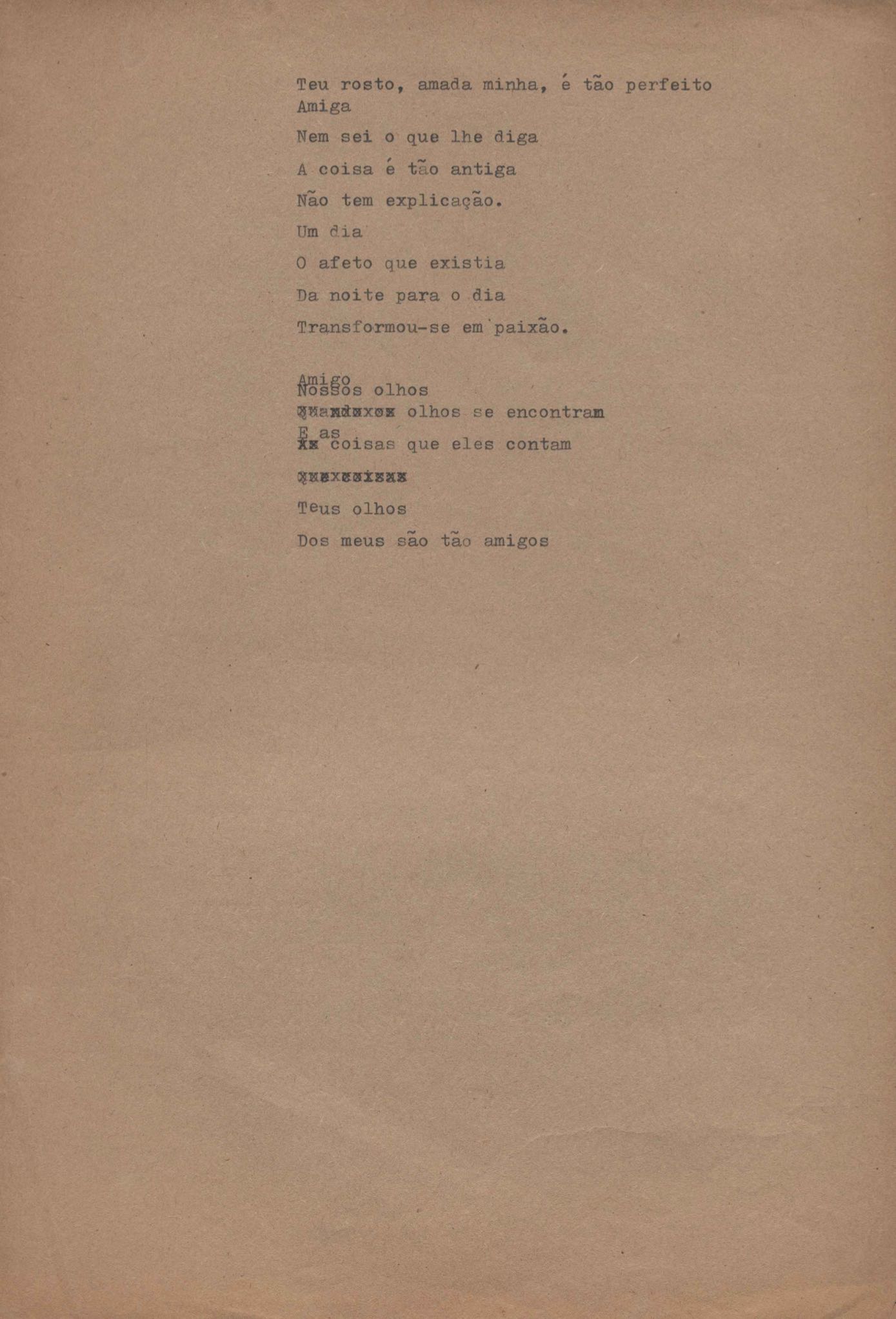 Poema. Há, no dossiê, vários rascunhos e poemas esparsos e inéditos. Alguns poemas do dossiê são encontrados também na primeira leva de documentos doados, e que faz parte do primeiro inventário. Na mesma página do poema "Quisera tanto" há o poema "Namorada". Há nota nos poemas: "Cada vez que eu penso nela", "O dia de Oxalá", "Menina, não banha nua" e "A morte sem pedágio".