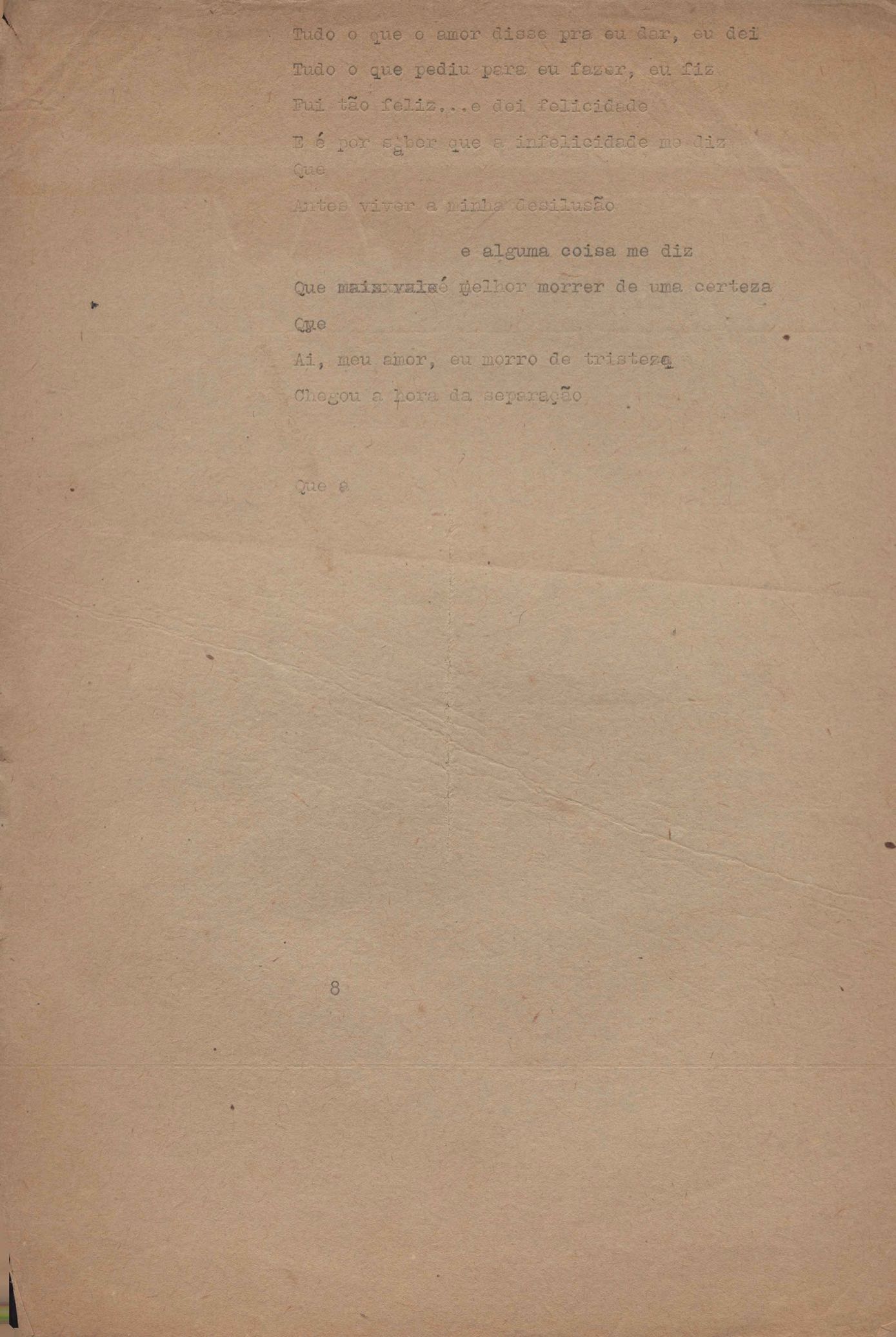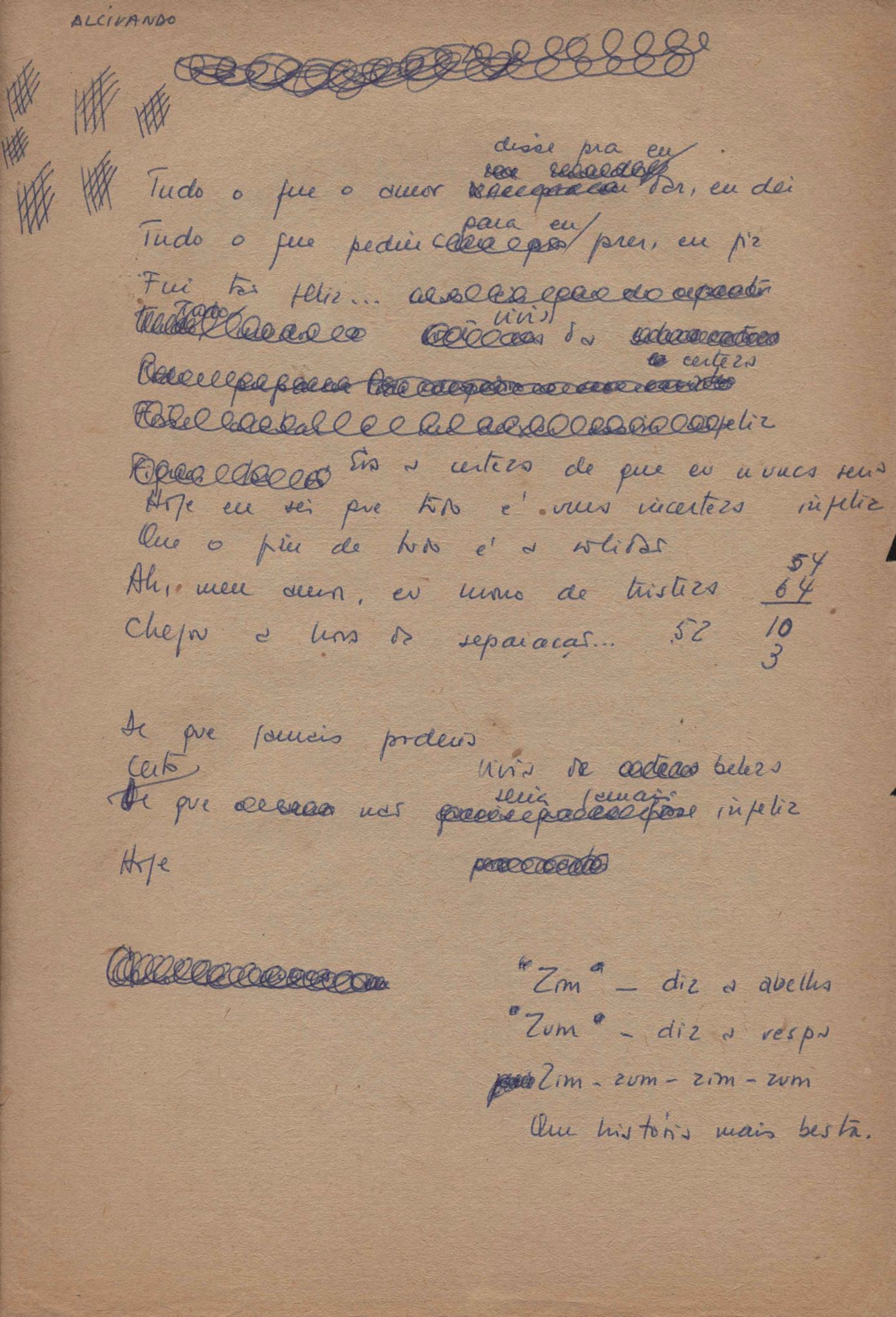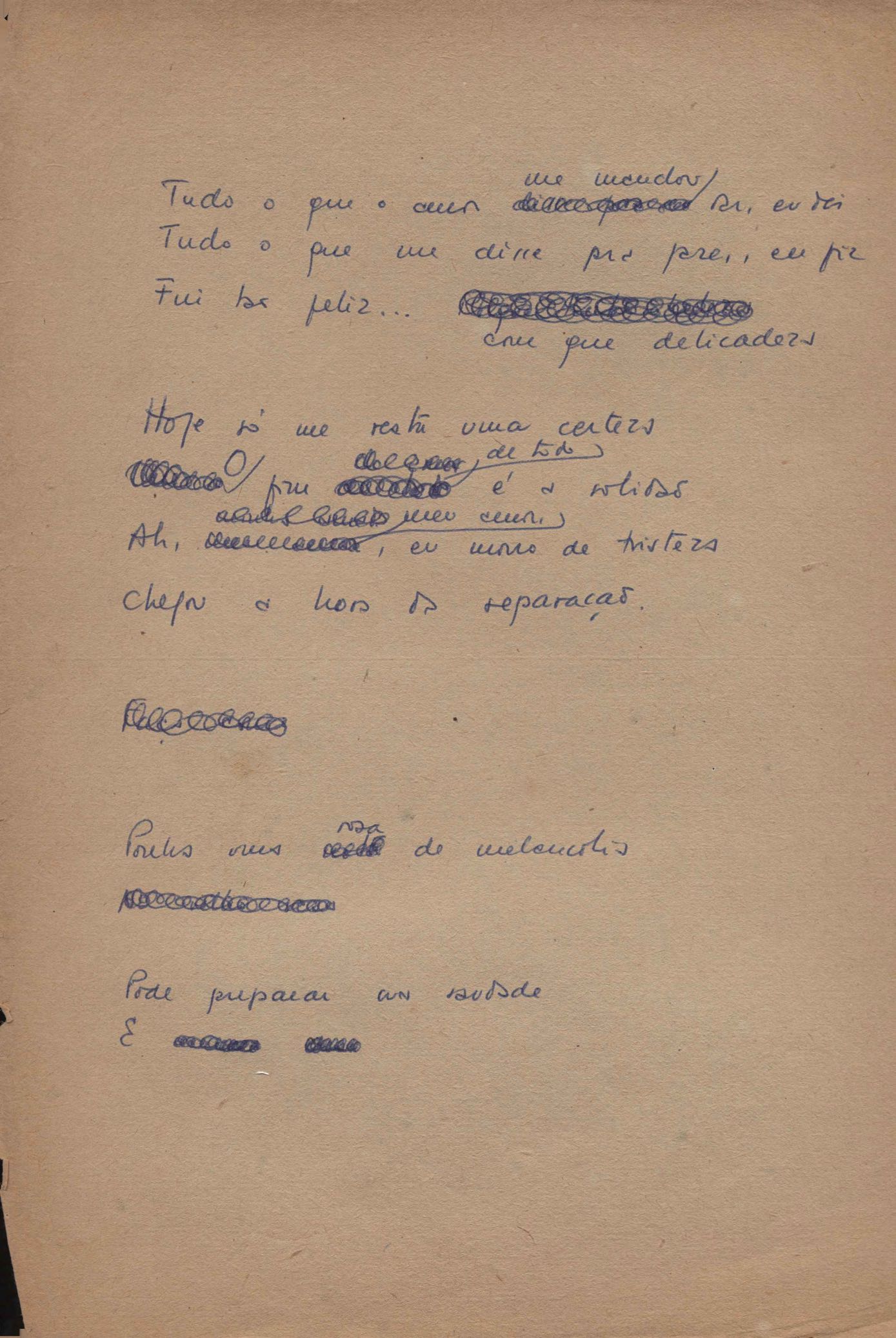 Poema. Há, no dossiê, vários rascunhos e poemas esparsos e inéditos. Alguns poemas do dossiê são encontrados também na primeira leva de documentos doados, e que faz parte do primeiro inventário. Na mesma página do poema "Quisera tanto" há o poema "Namorada". Há nota nos poemas: "Cada vez que eu penso nela", "O dia de Oxalá", "Menina, não banha nua" e "A morte sem pedágio".