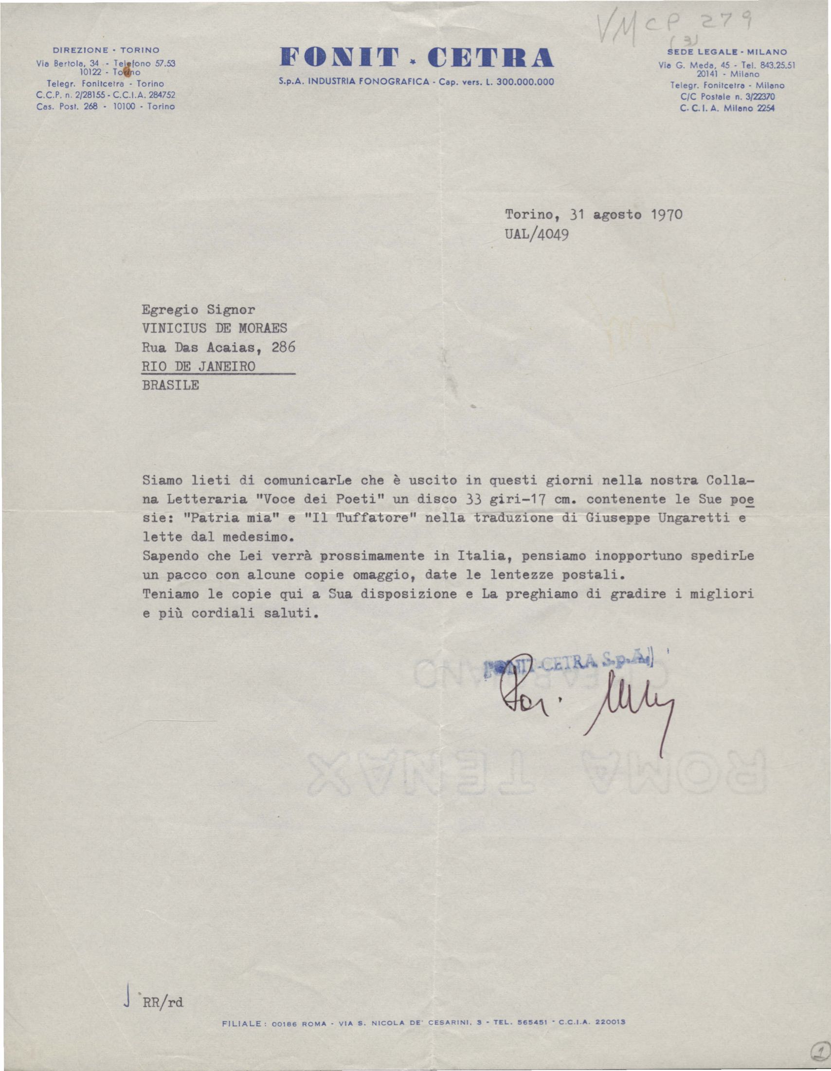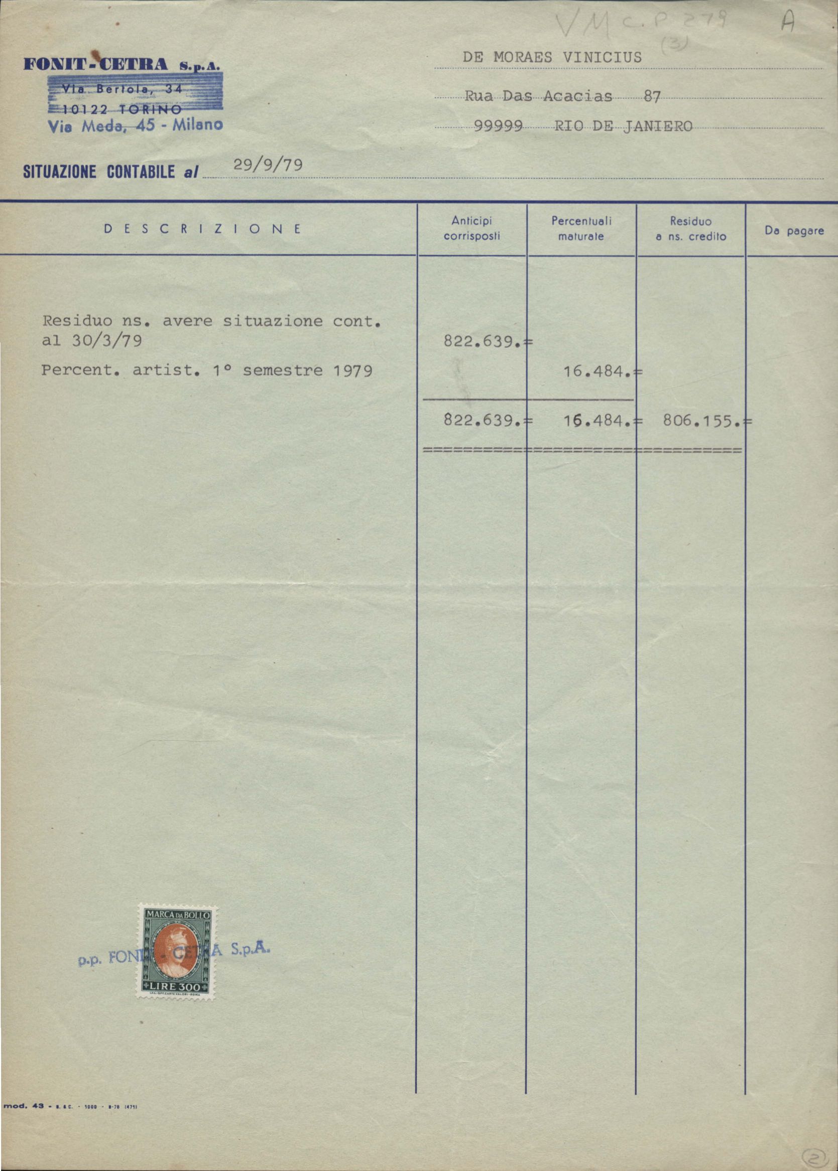 Informações sobre impressão de disco com poesias de VM. Anexo: Recibo de pagamento de direitos autorais.