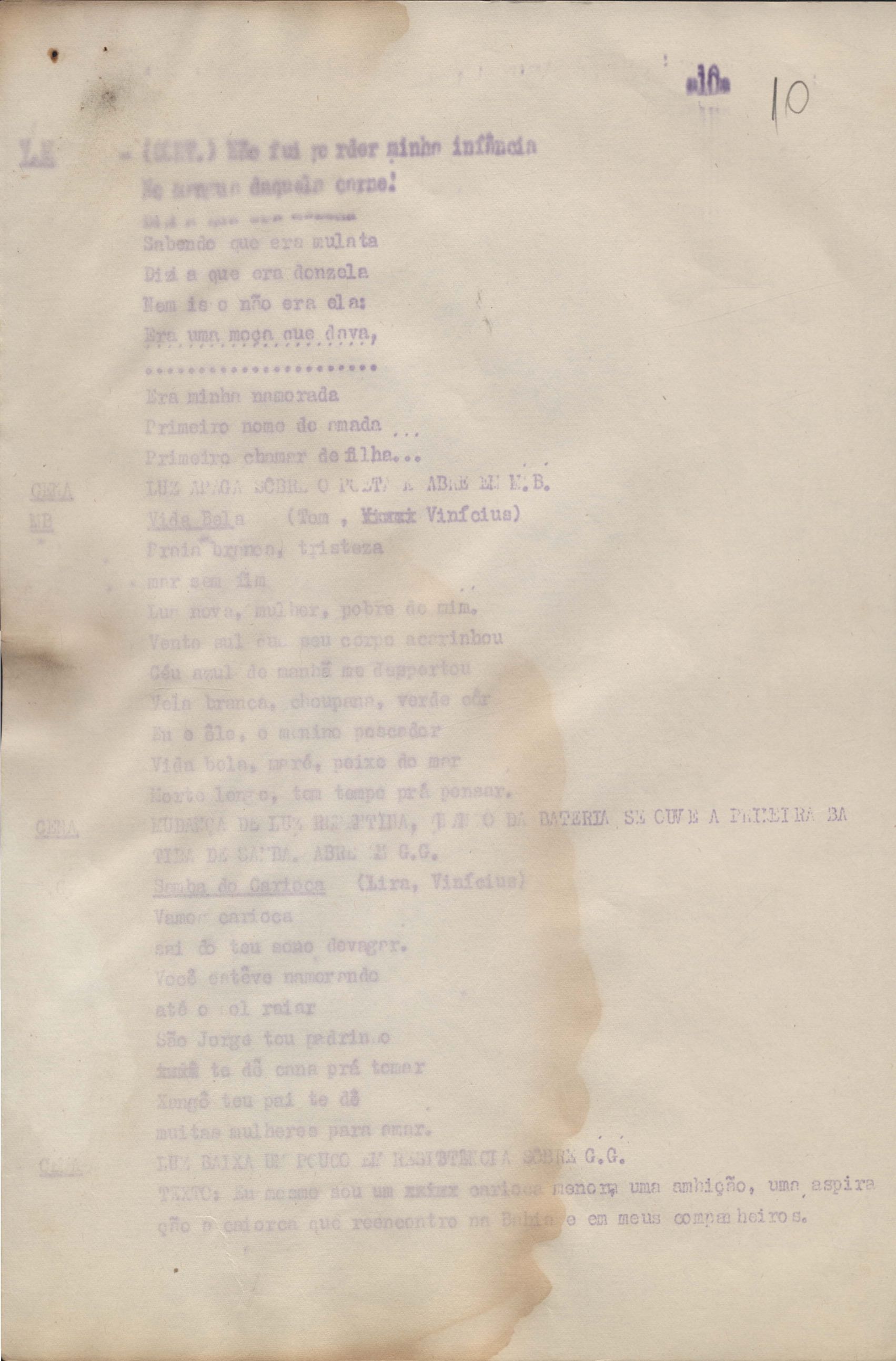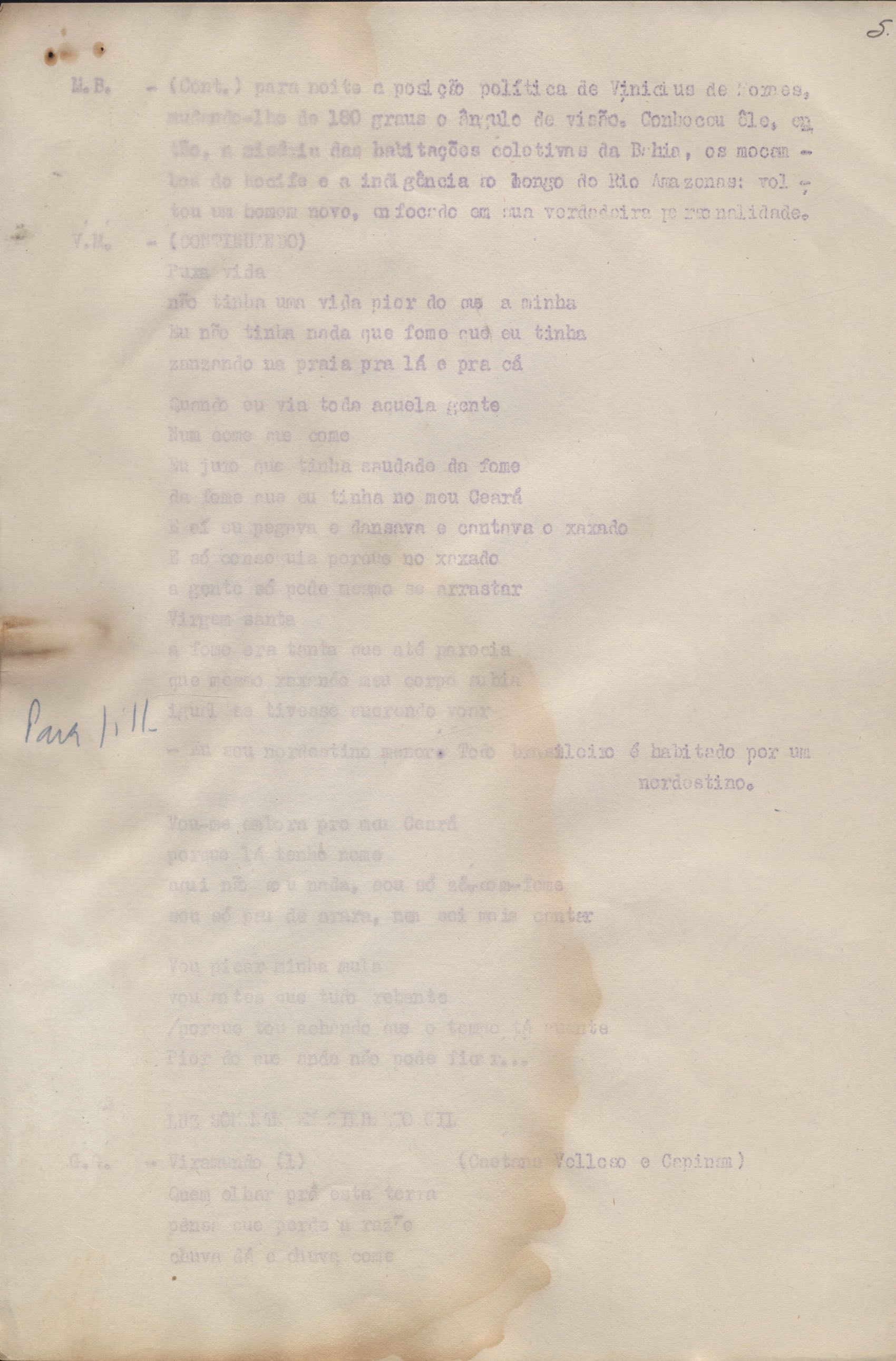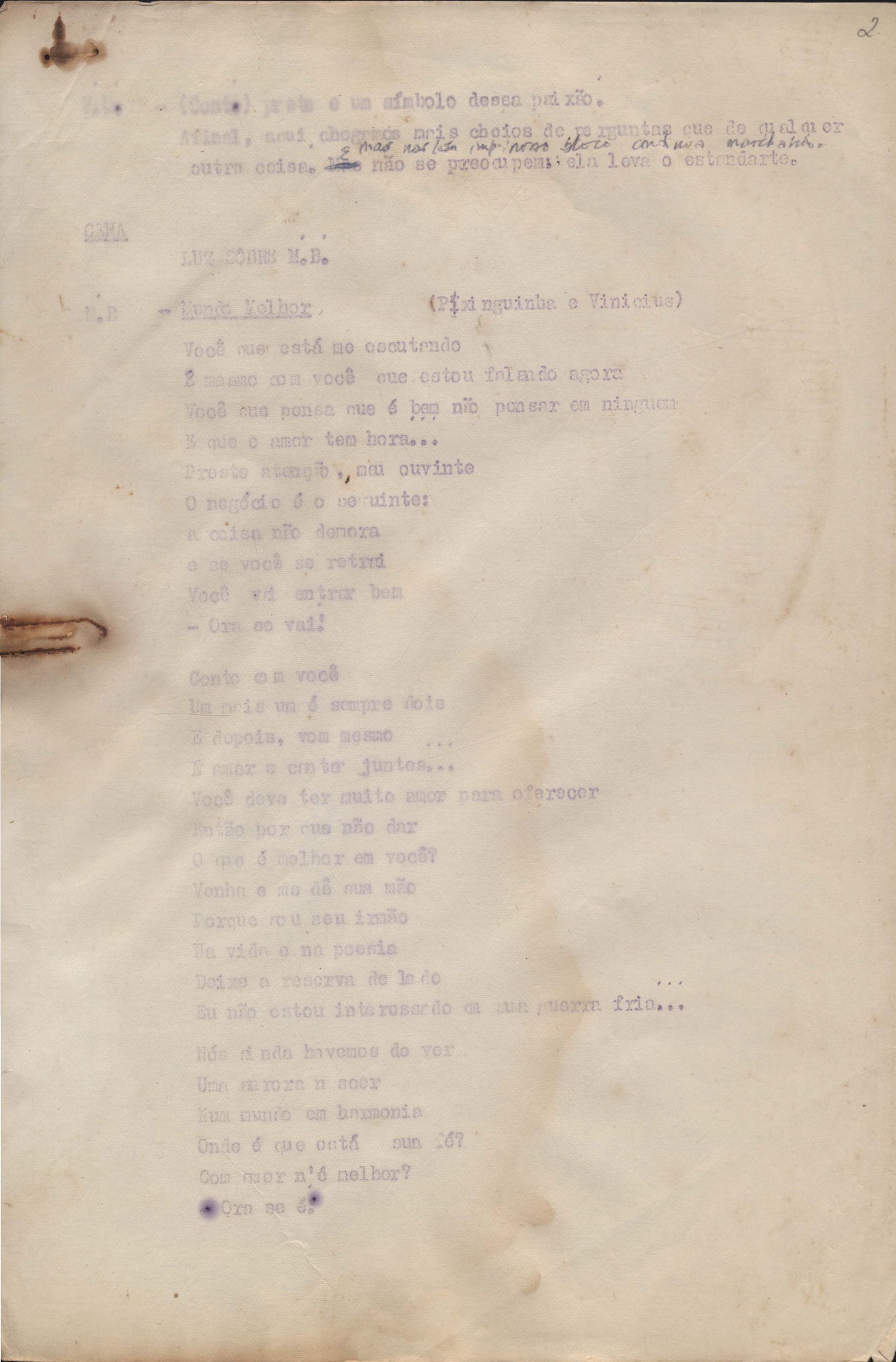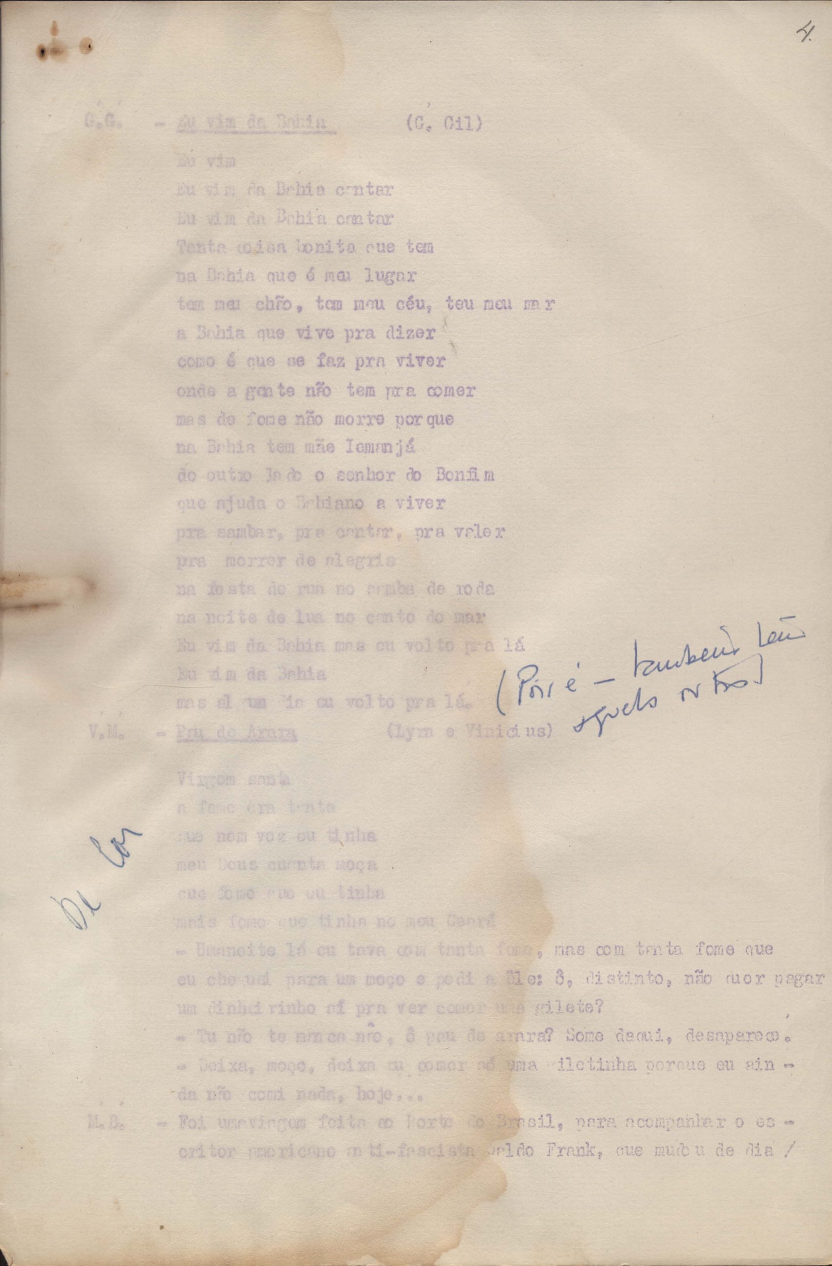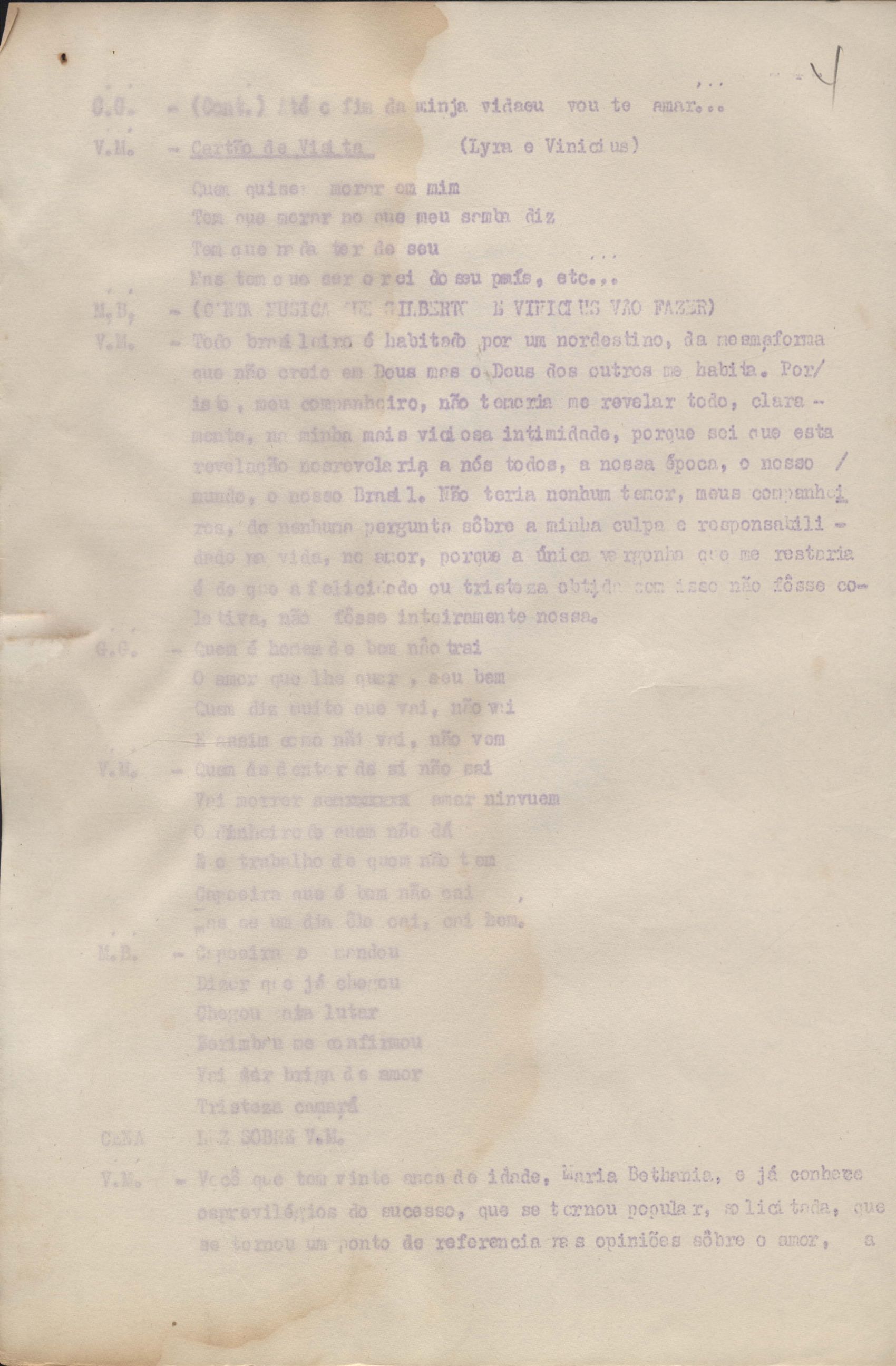Roteiro para o show Pois é, realizado no Teatro Opinião no Rio de Janeiro, de VM ao lado de Maria Bethânia e Gilberto Gil, direção de Francis Hime. Cópia carbonada.
