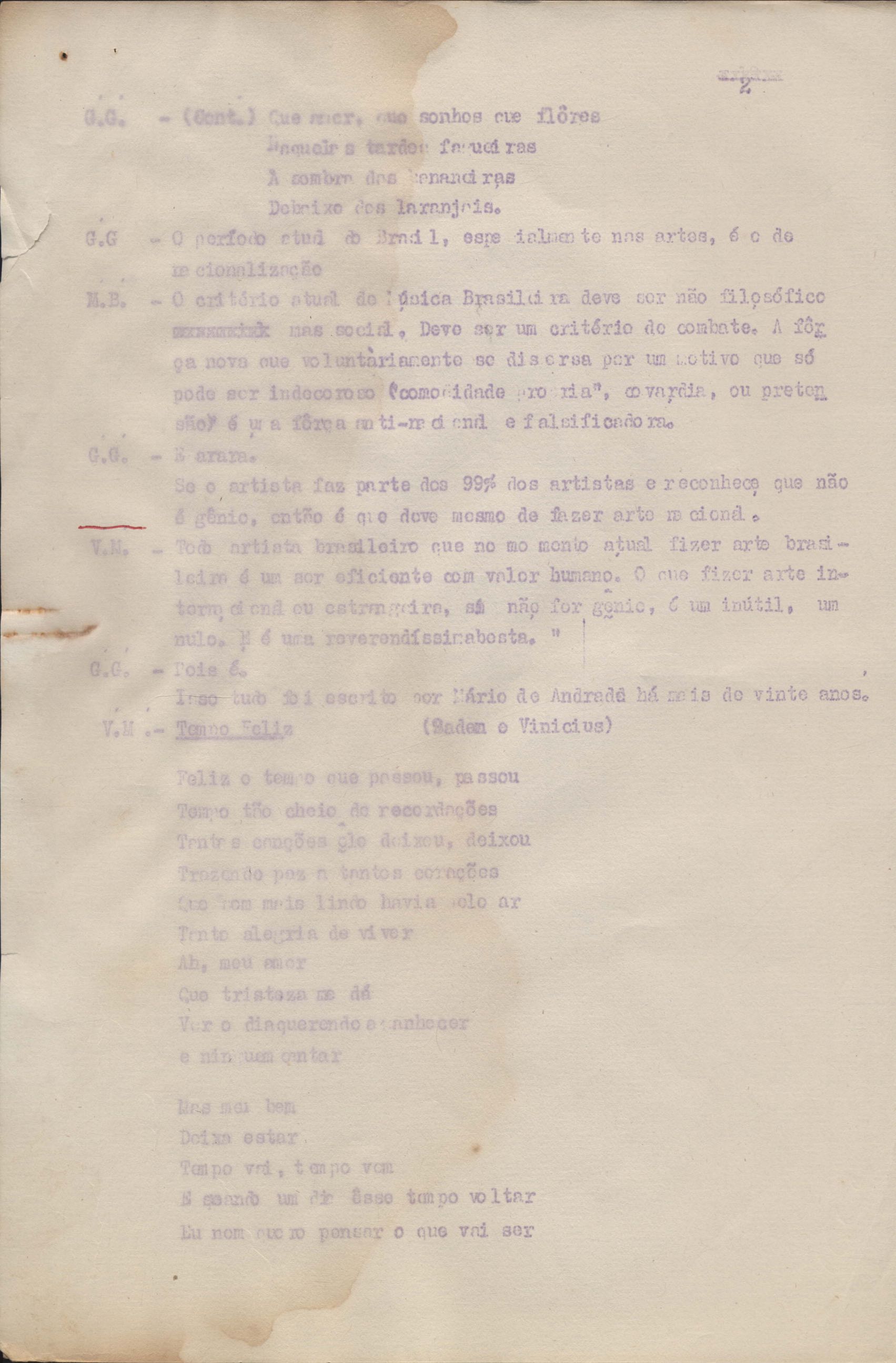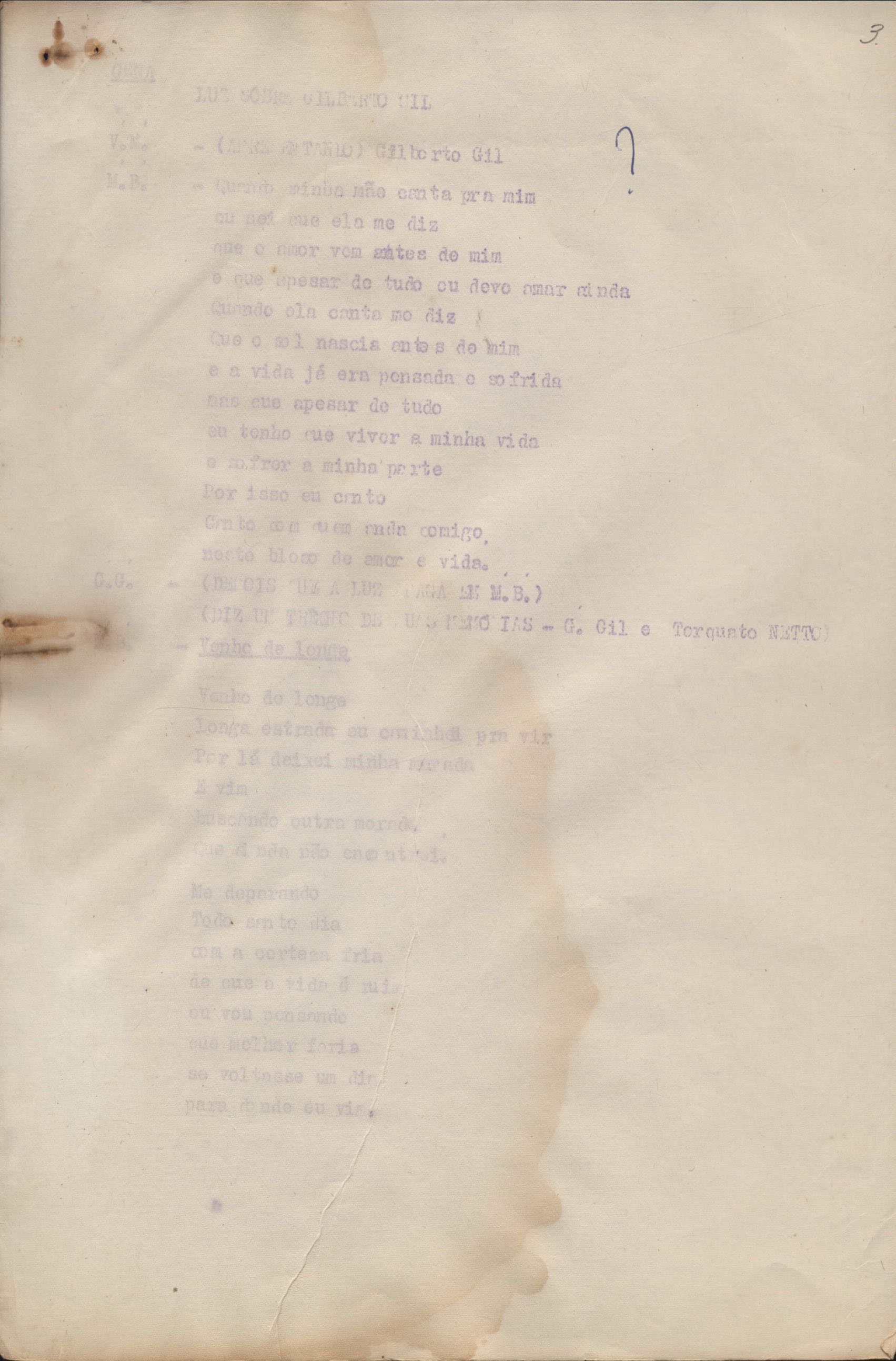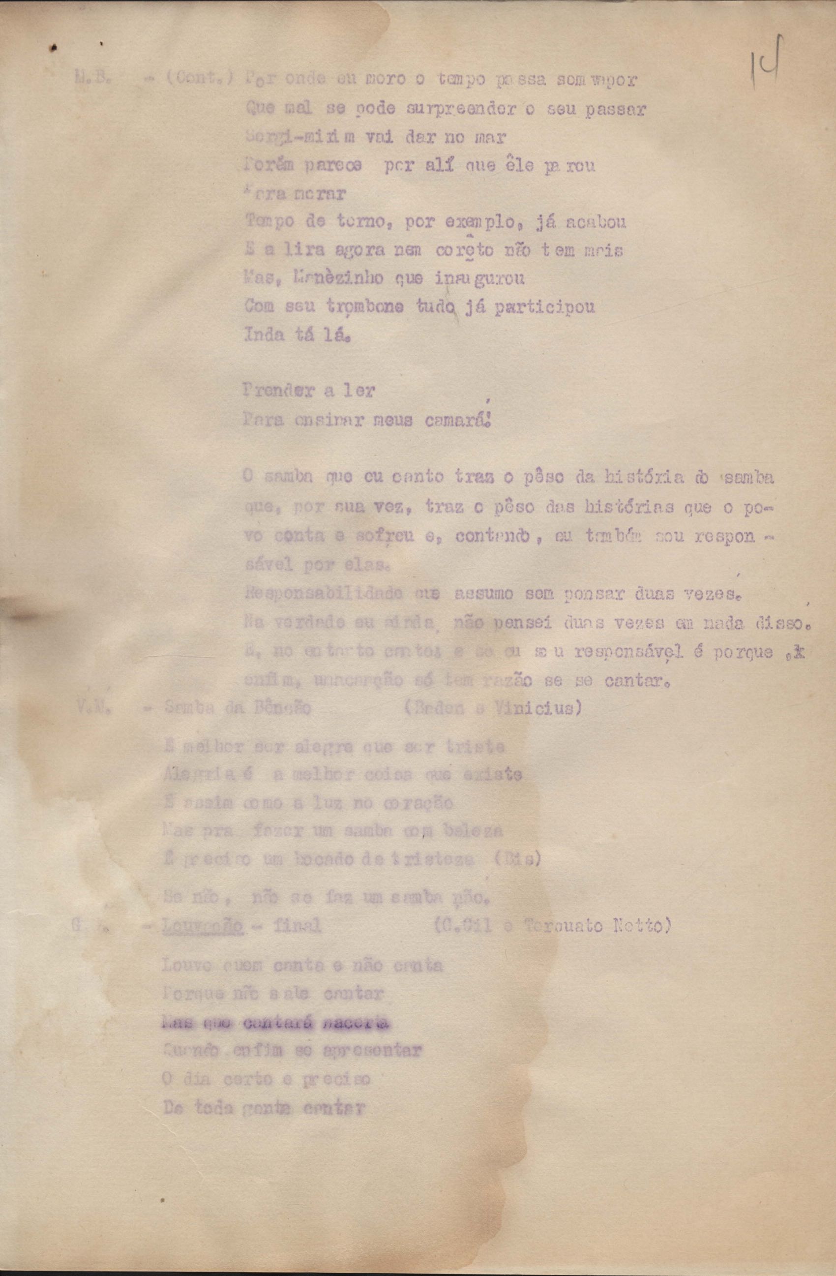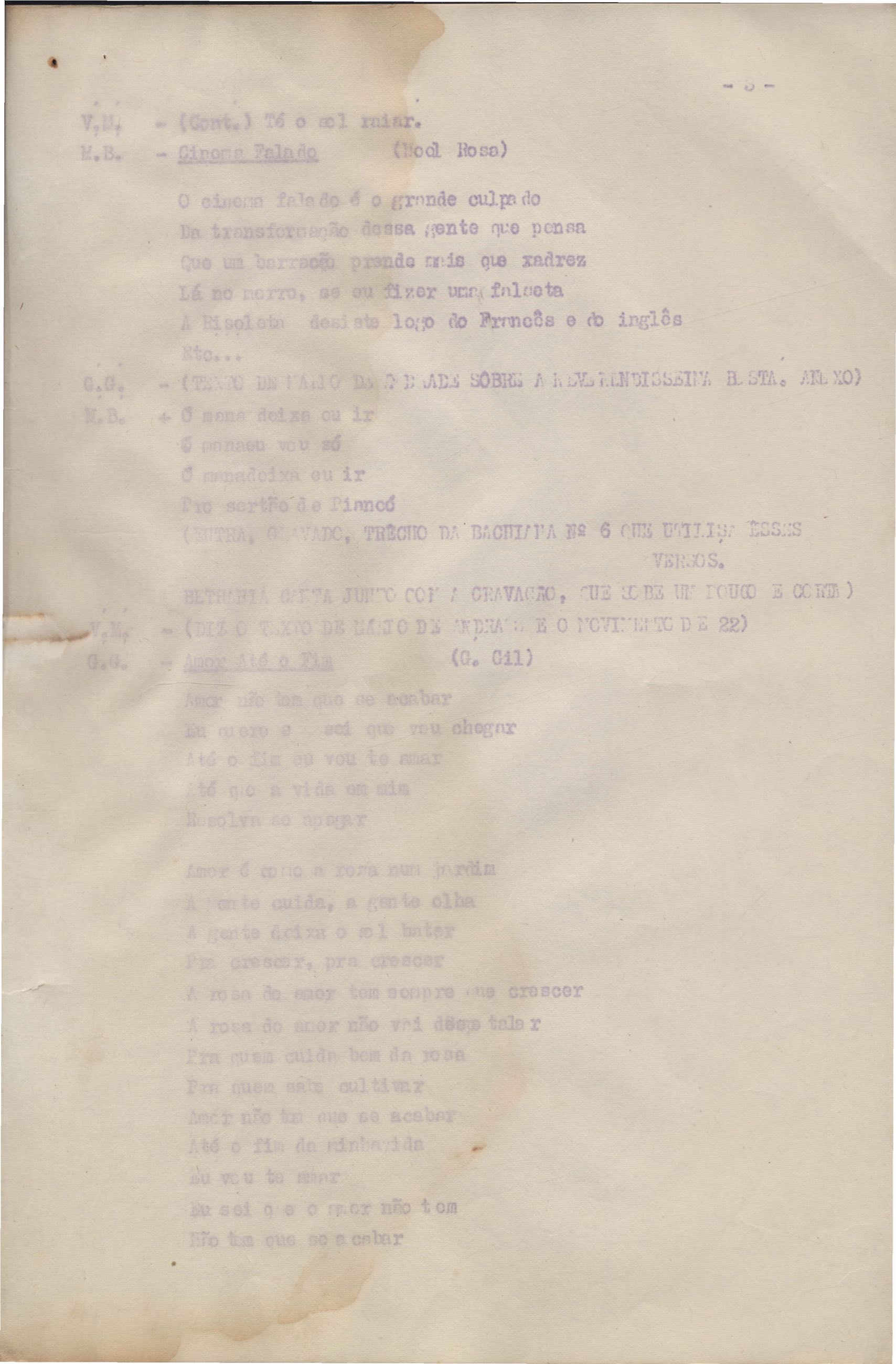 Roteiro para o show Pois é, realizado no Teatro Opinião no Rio de Janeiro, de VM ao lado de Maria Bethânia e Gilberto Gil, direção de Francis Hime. Cópia carbonada.