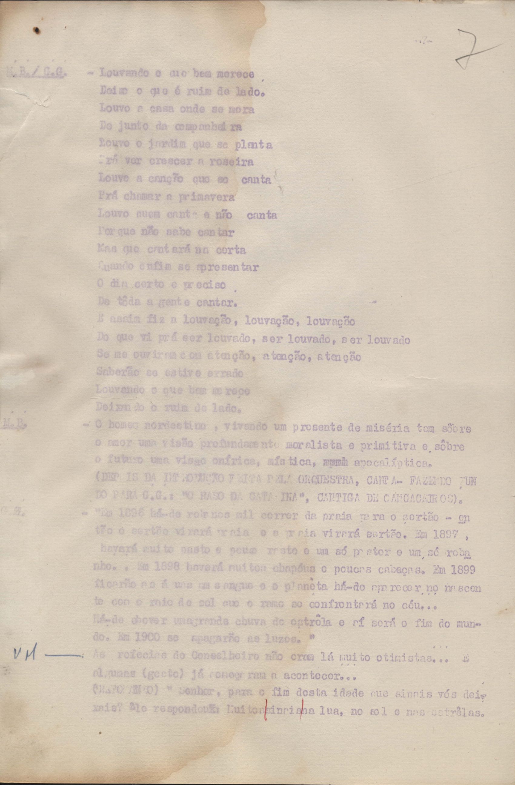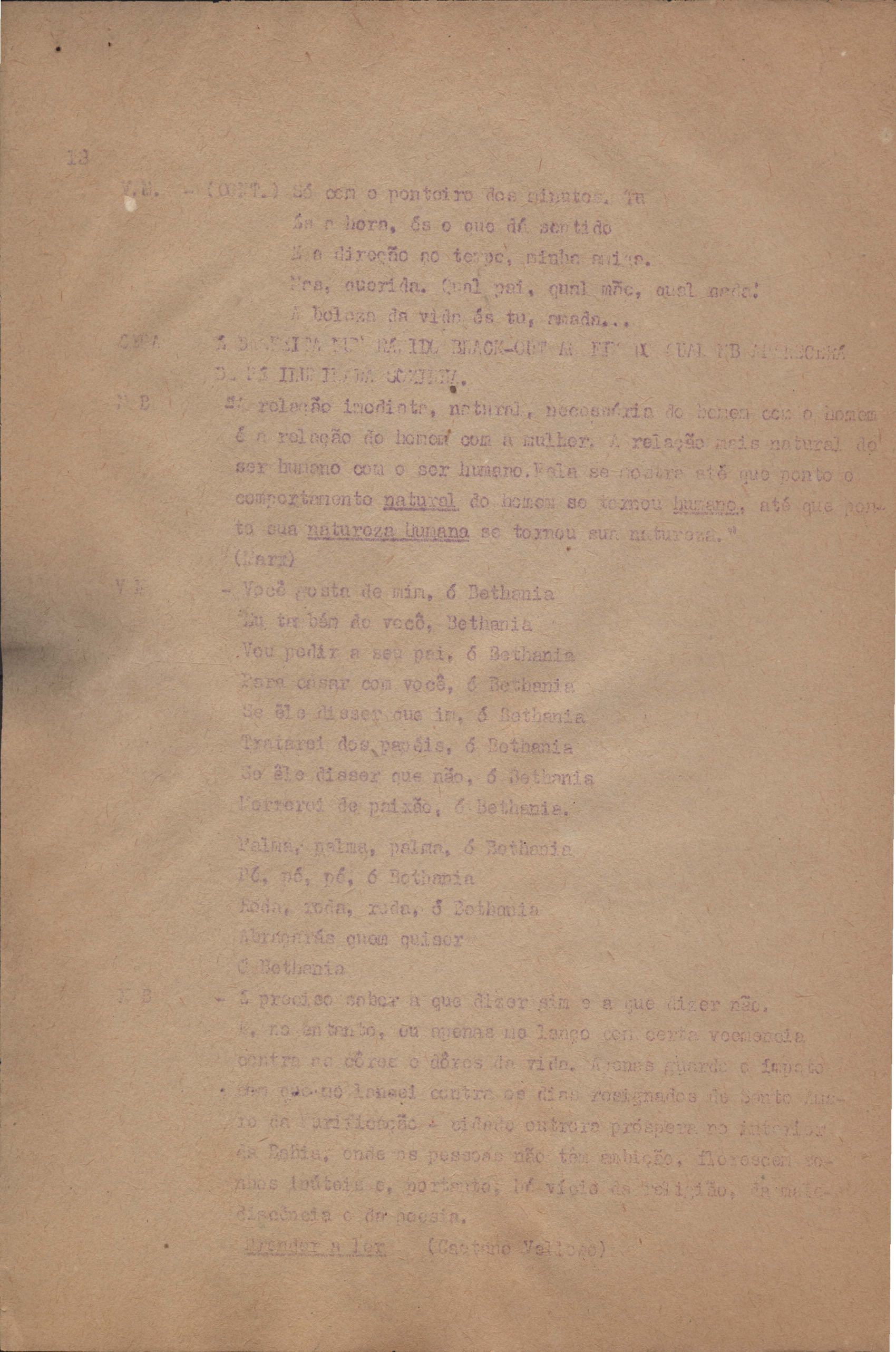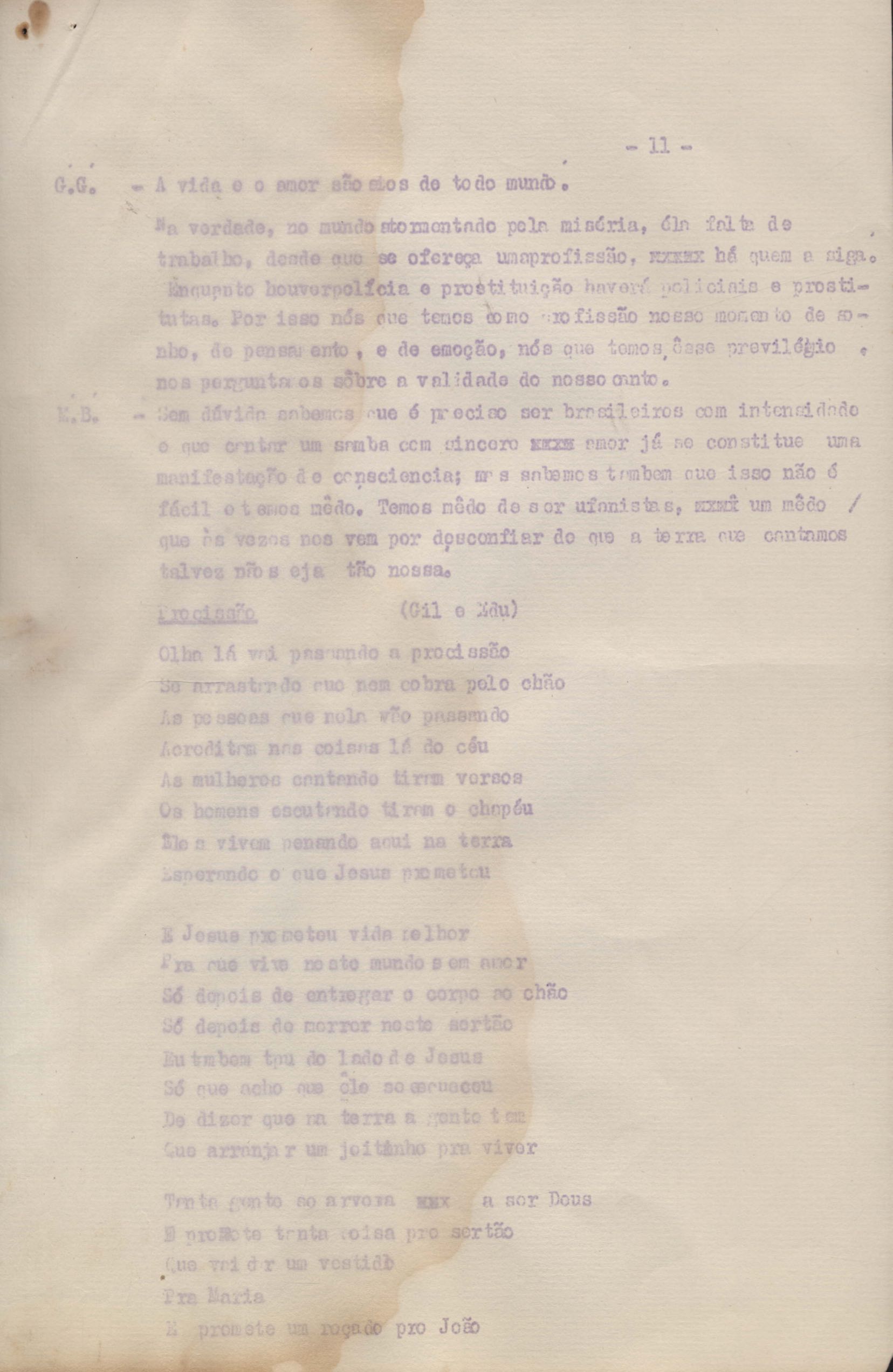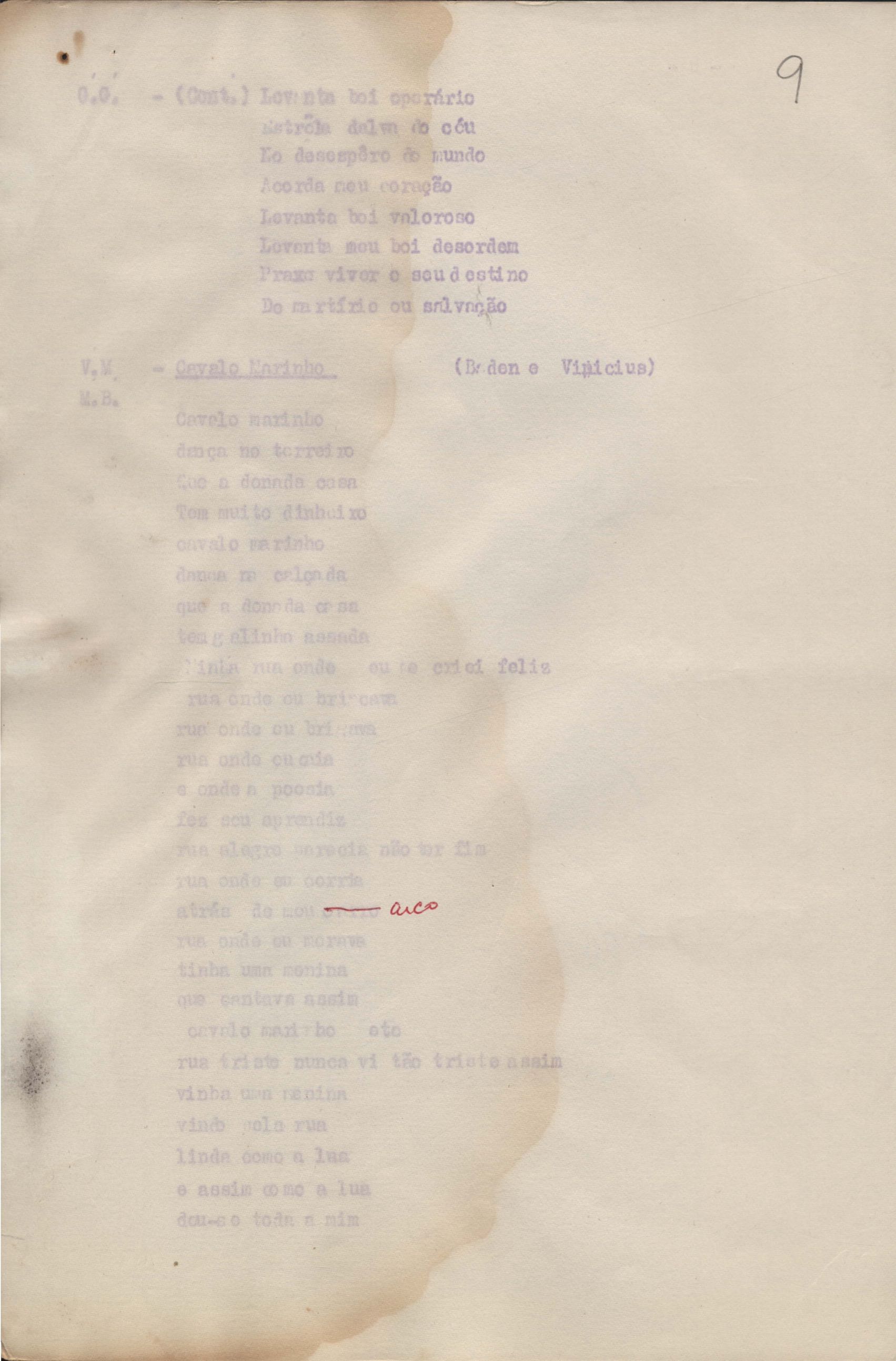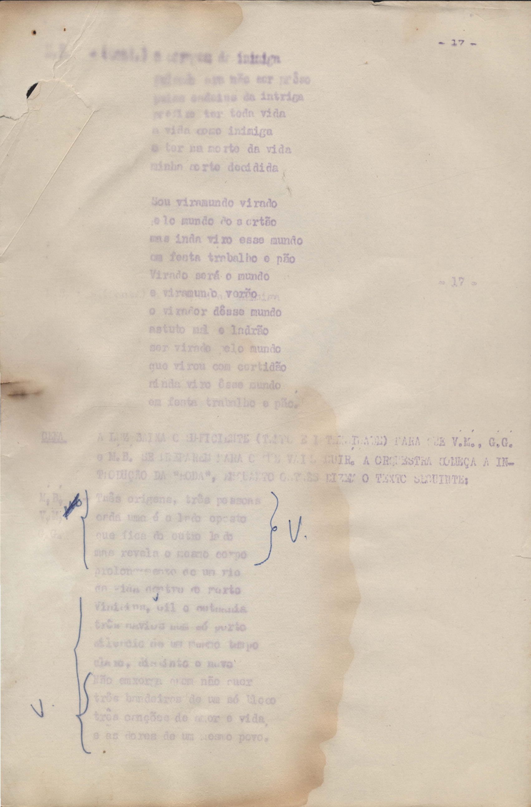 Roteiro para o show Pois é, realizado no Teatro Opinião no Rio de Janeiro, de VM ao lado de Maria Bethânia e Gilberto Gil, direção de Francis Hime. Cópia carbonada.