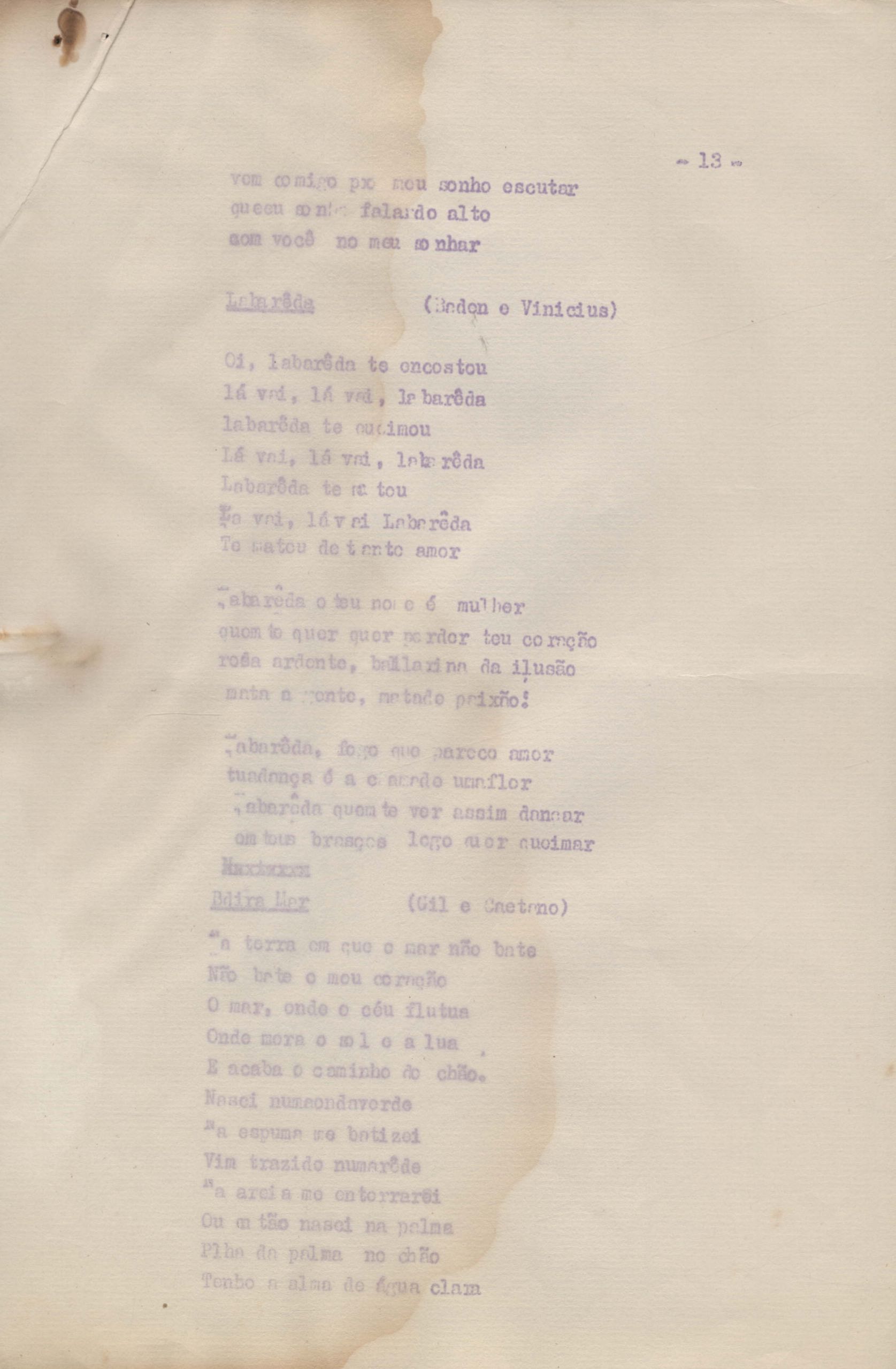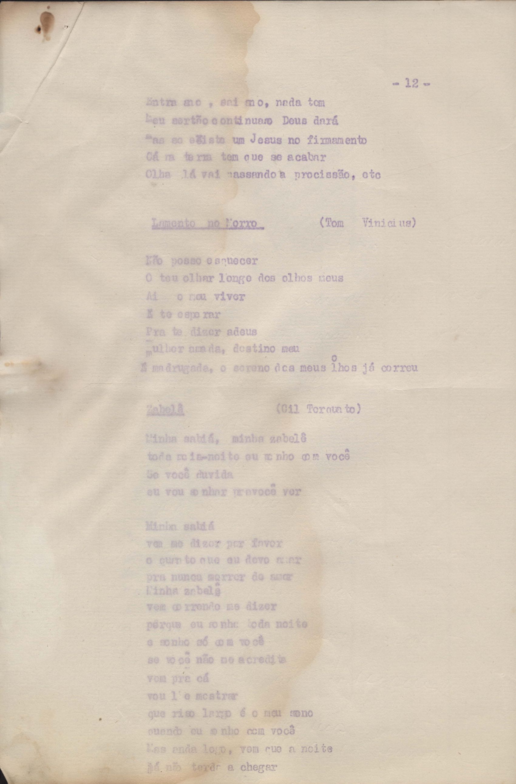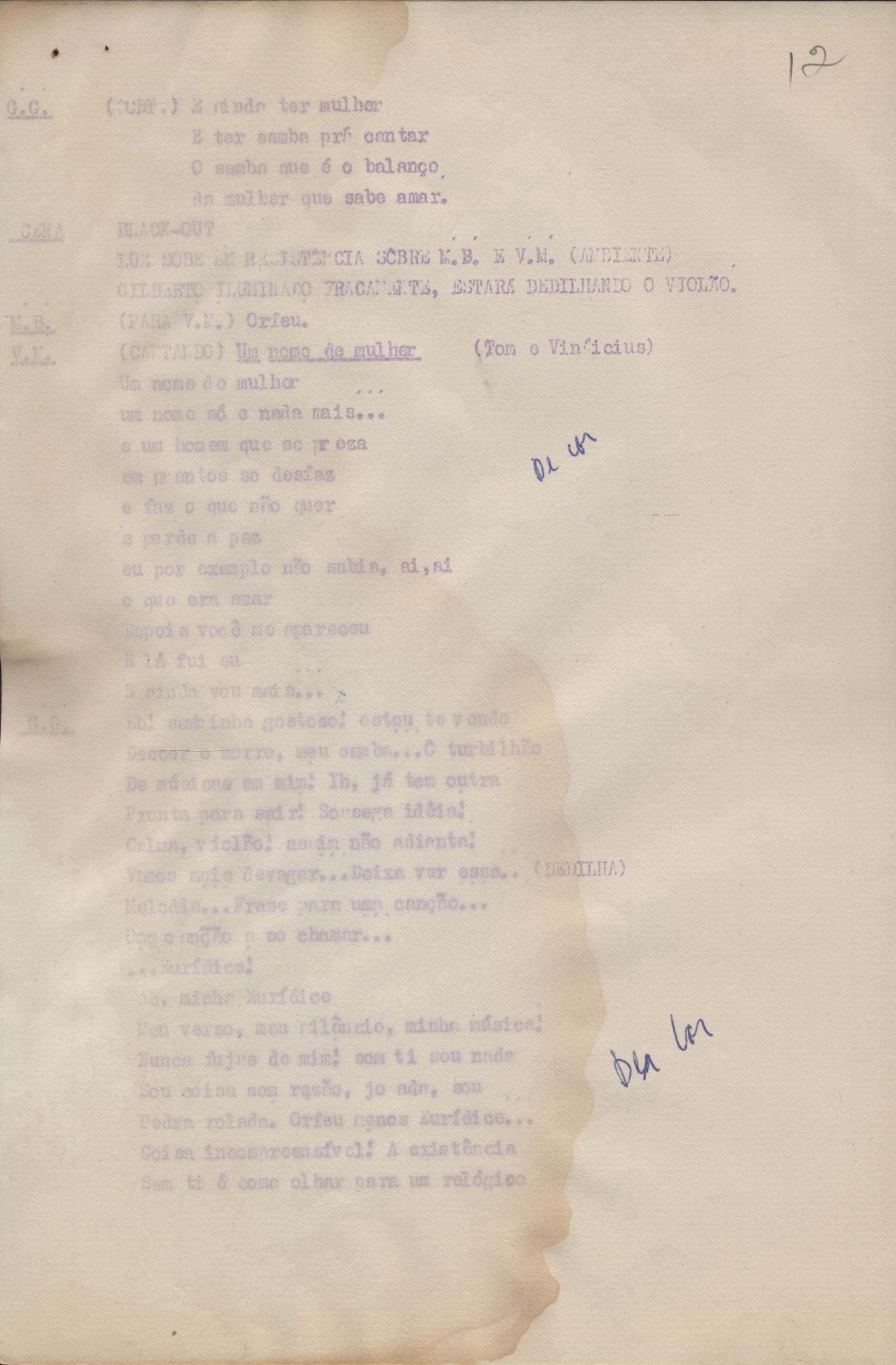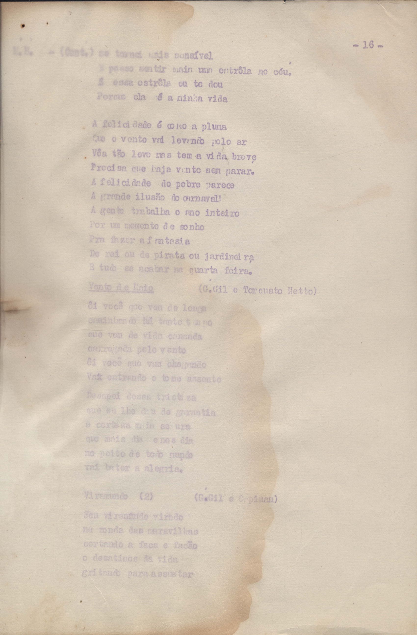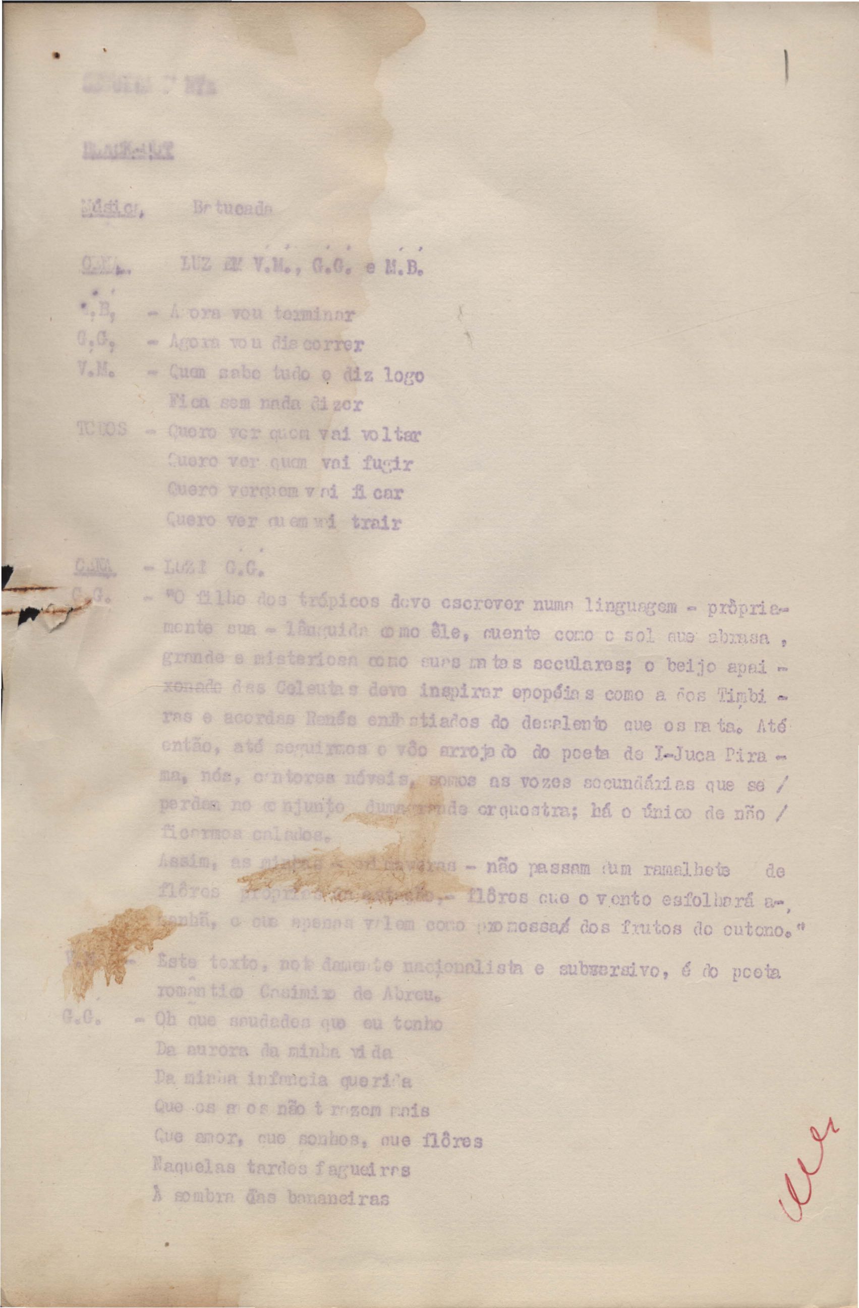 Roteiro para o show Pois é, realizado no Teatro Opinião no Rio de Janeiro, de VM ao lado de Maria Bethânia e Gilberto Gil, direção de Francis Hime. Cópia carbonada.