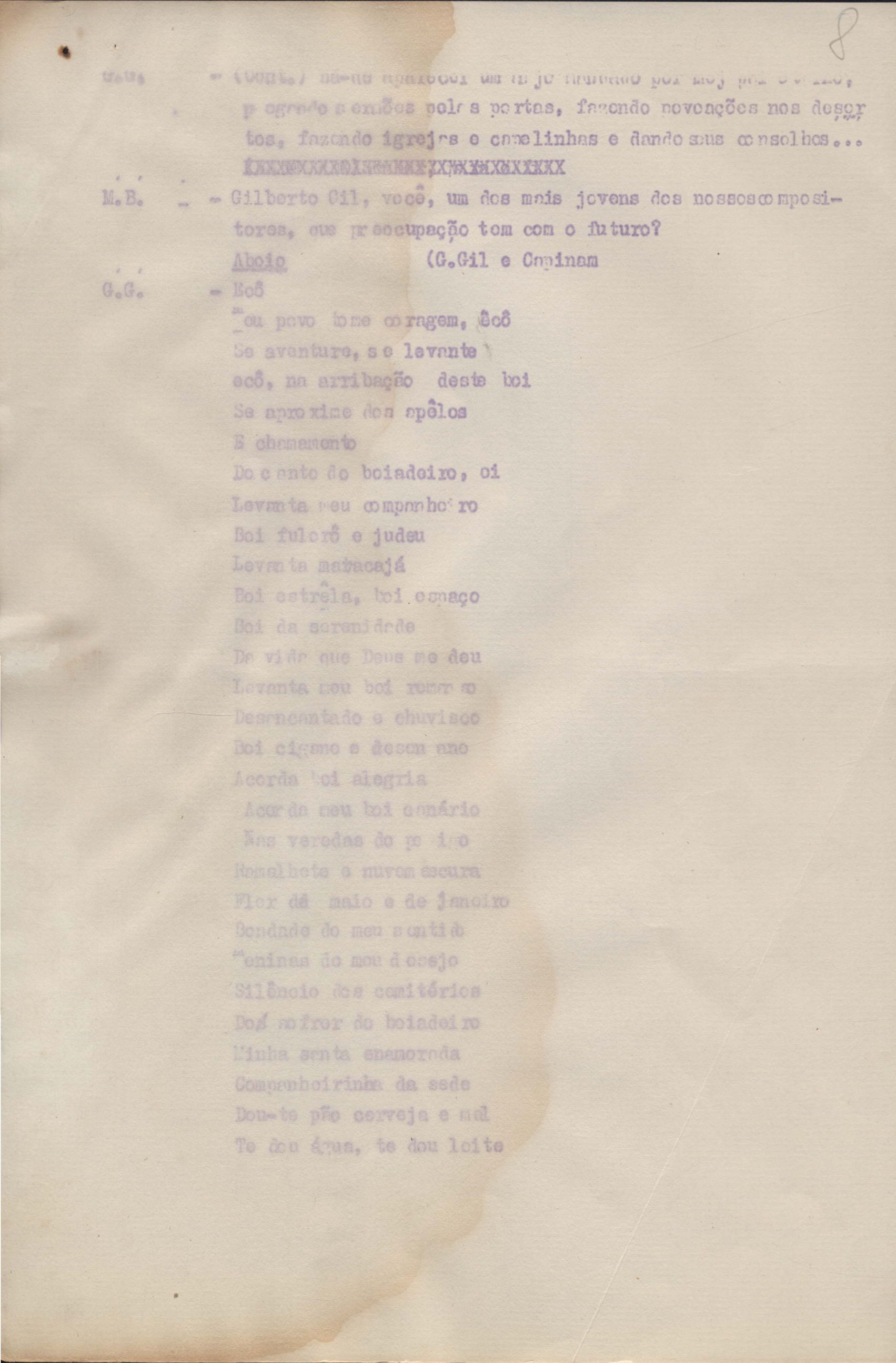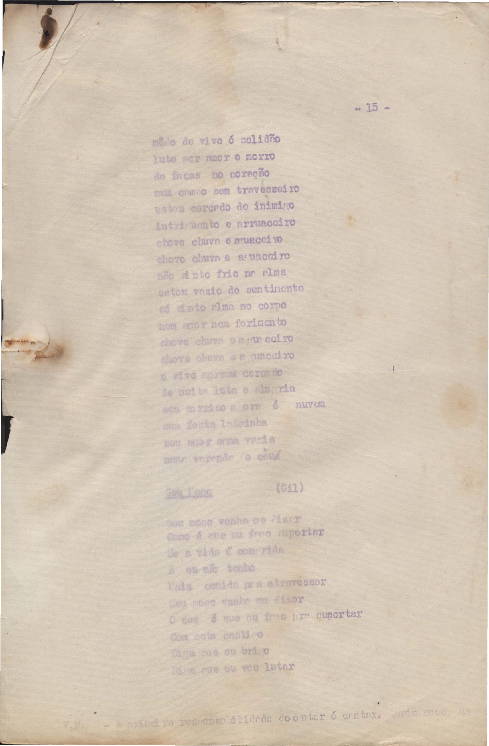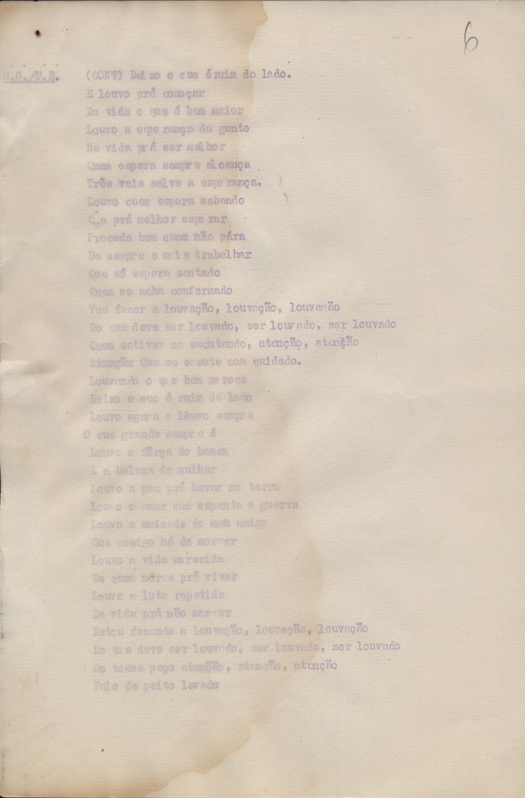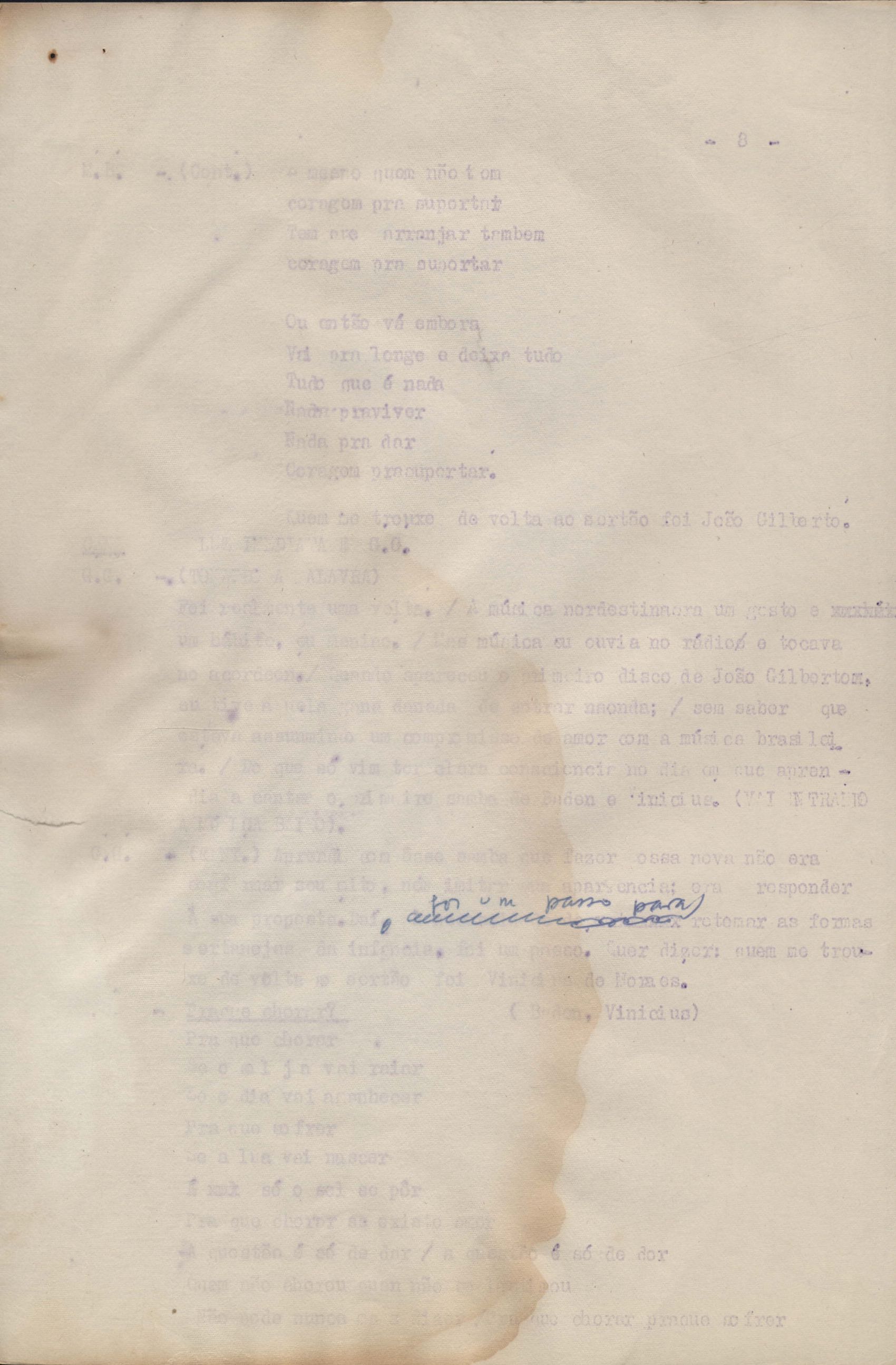 Roteiro para o show Pois é, realizado no Teatro Opinião no Rio de Janeiro, de VM ao lado de Maria Bethânia e Gilberto Gil, direção de Francis Hime. Cópia carbonada.