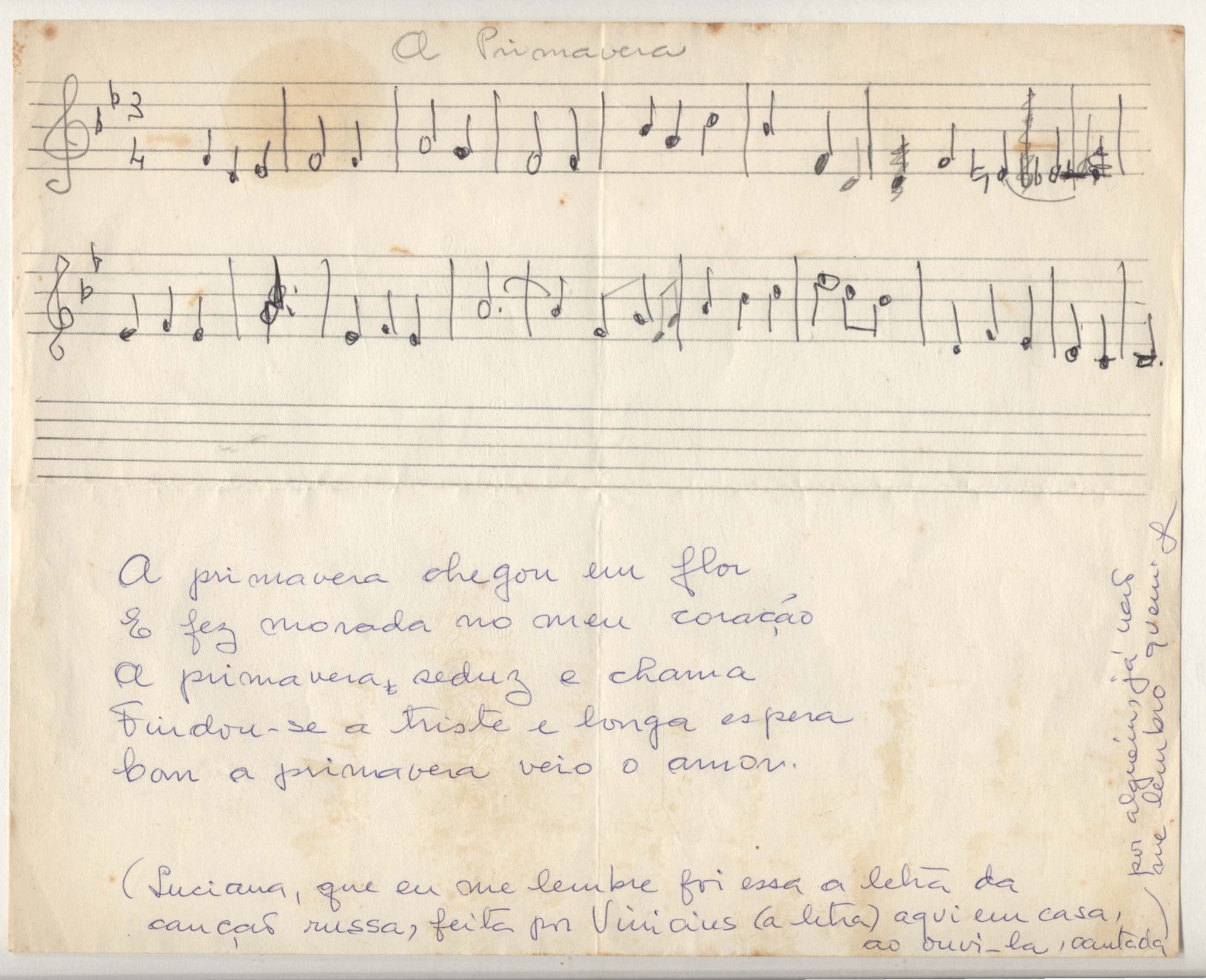 Letra de música. Há rascunhos. Há uma nota na música para Luciana de Moraes.