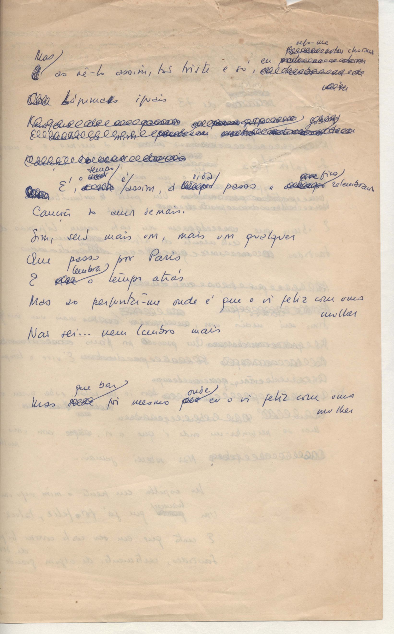 Letra de música. Música em parceria com Toquinho. Há rascunho.
