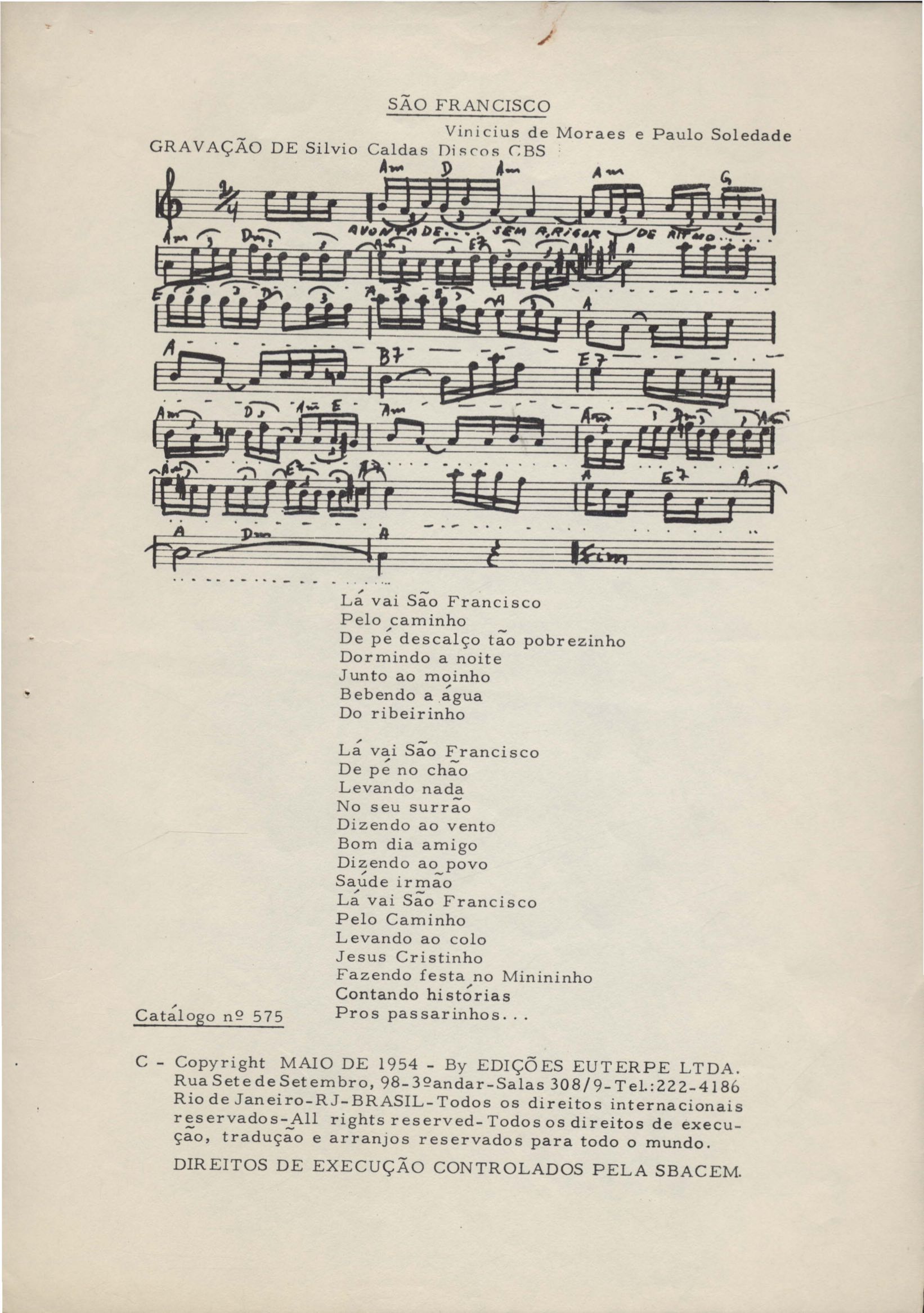 Letra de música. Música em parceria com Paulo Soledade.