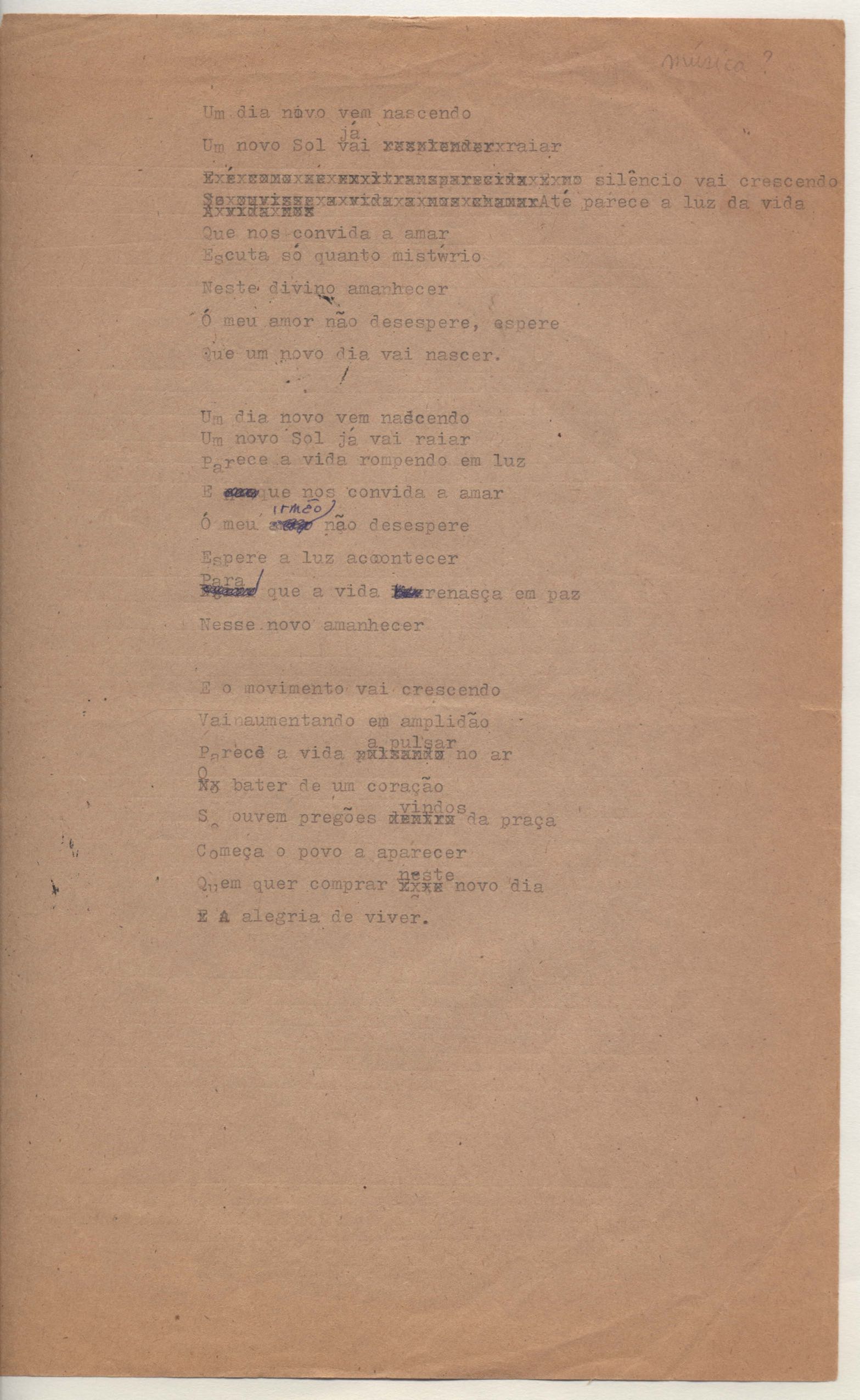 Letra de música. Música em parceria com Edu Lobo. Rascunho.