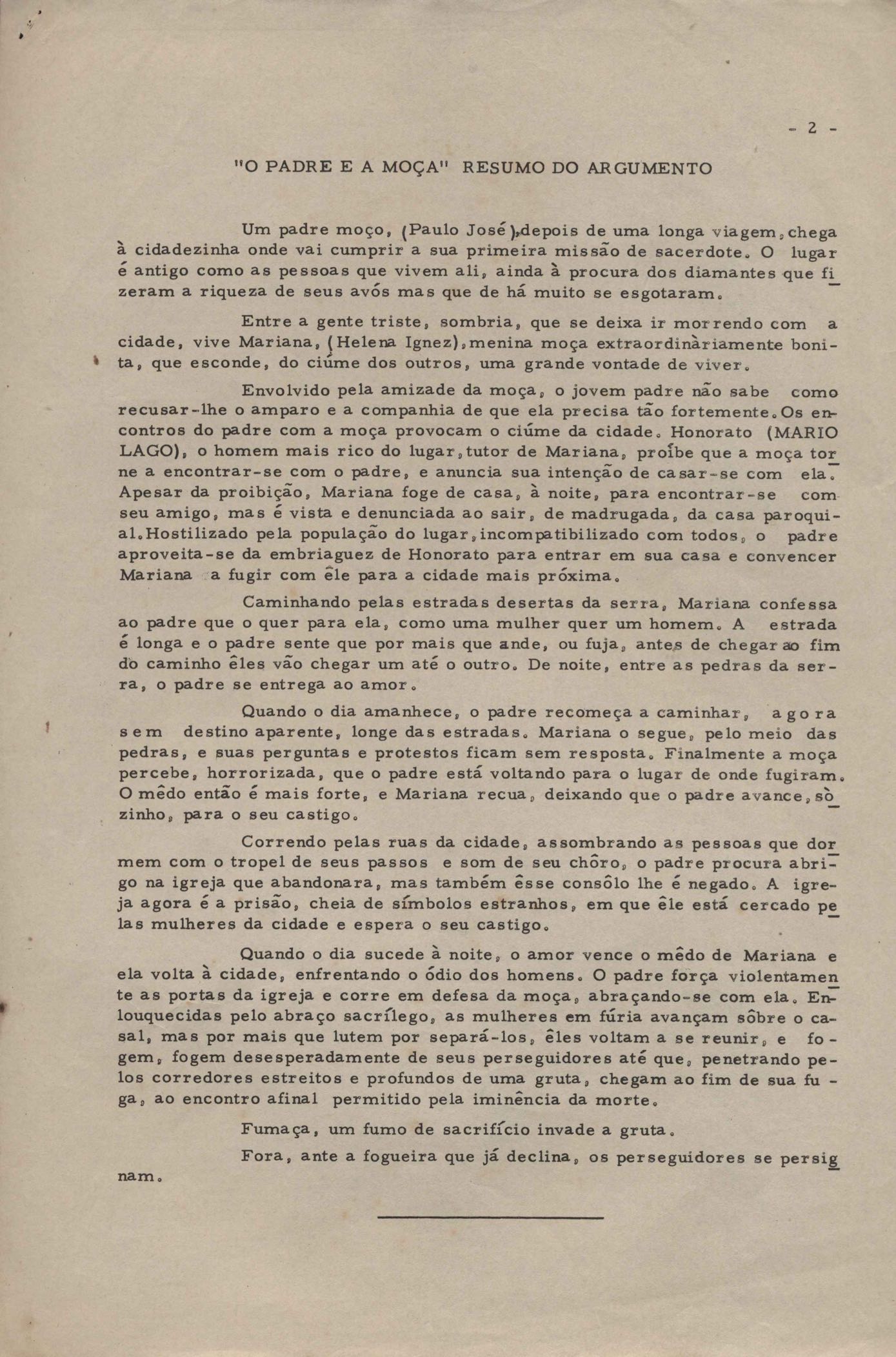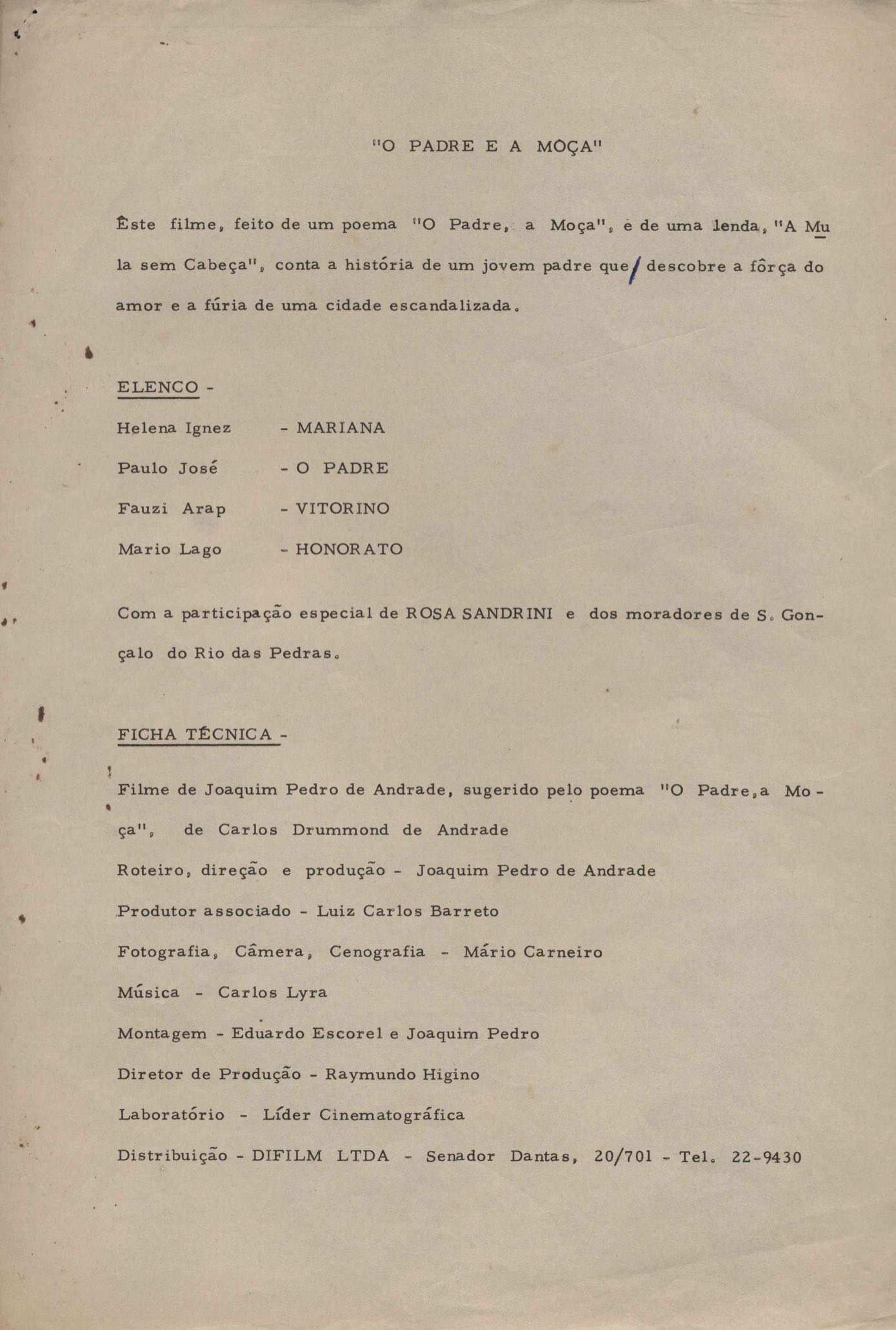 Roteiro de filme baseado no poema "O padre e a moça", de Carlos Drummond de Andrade, e na lenda A mula sem cabeça. Há também um resumo do argumento.