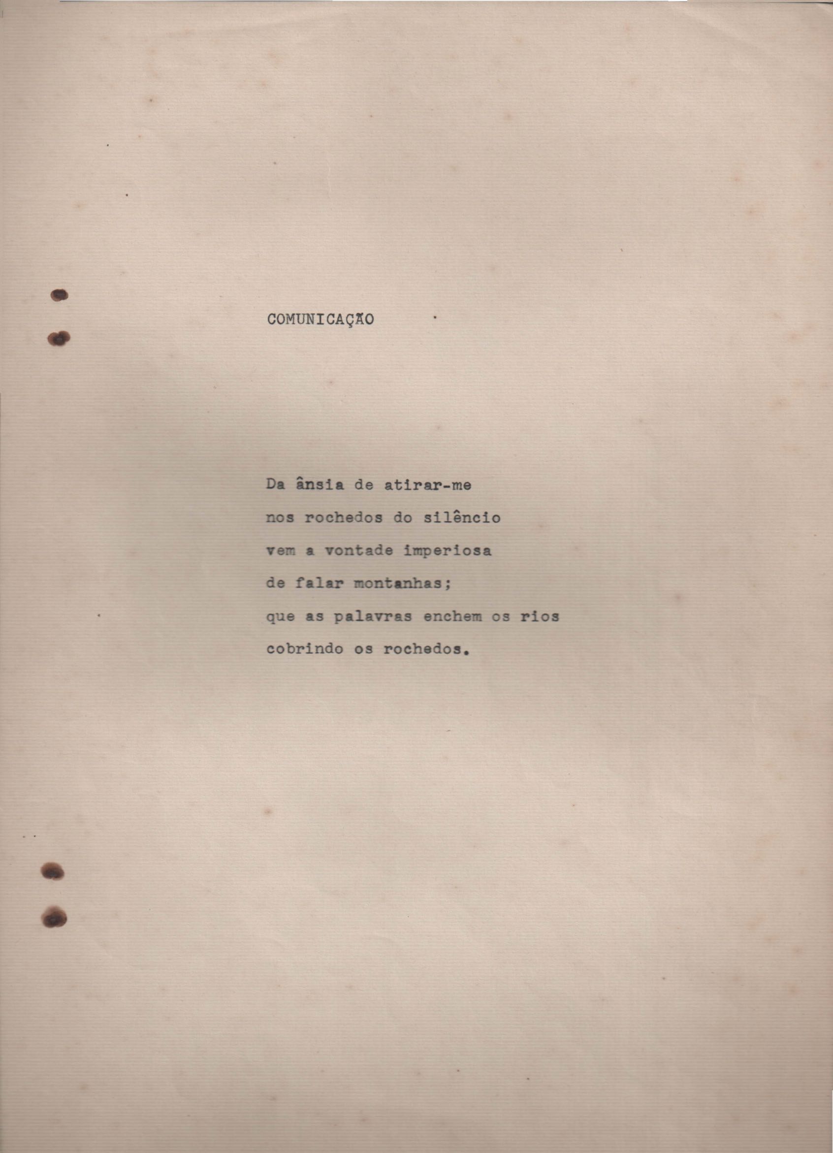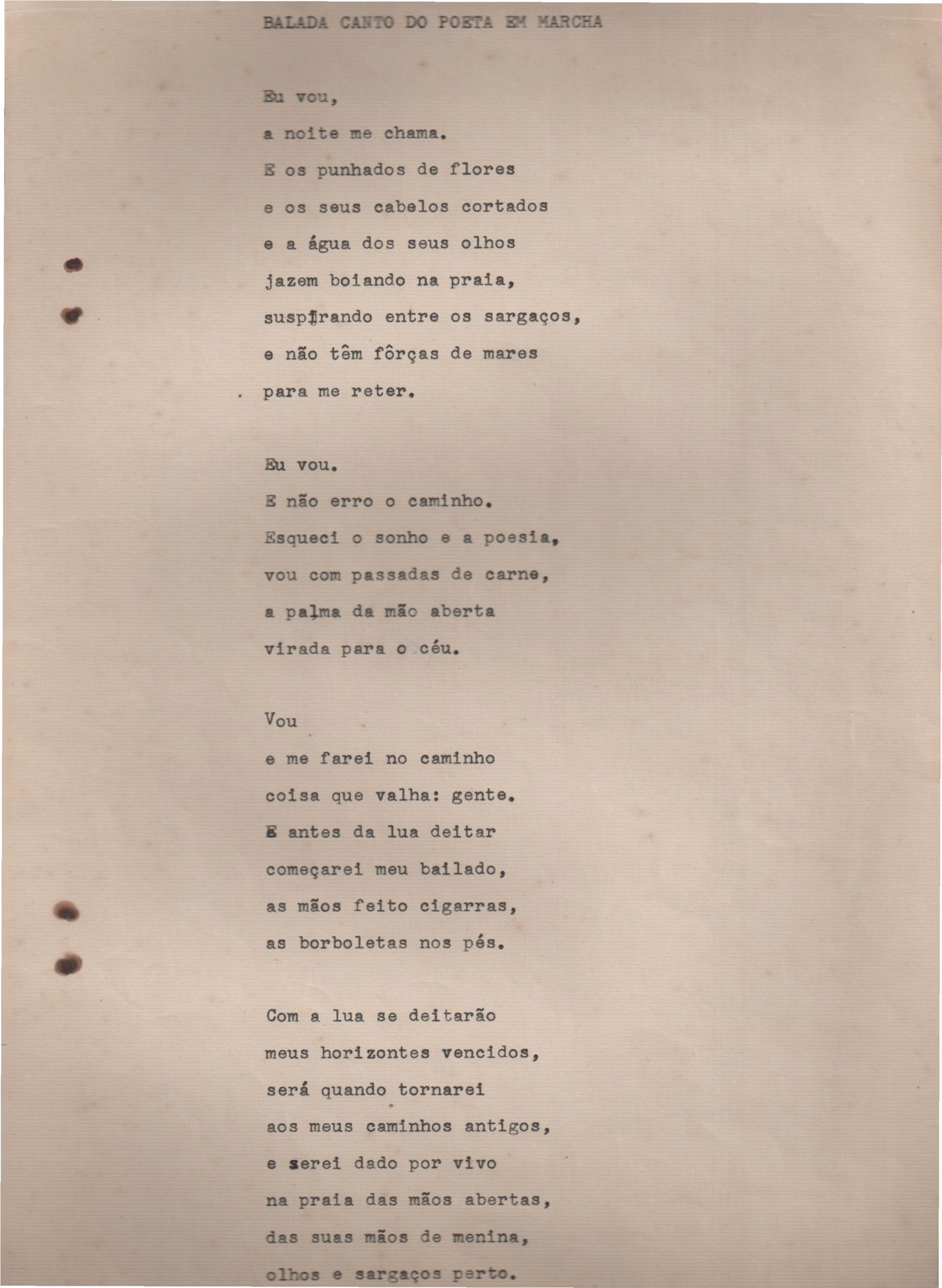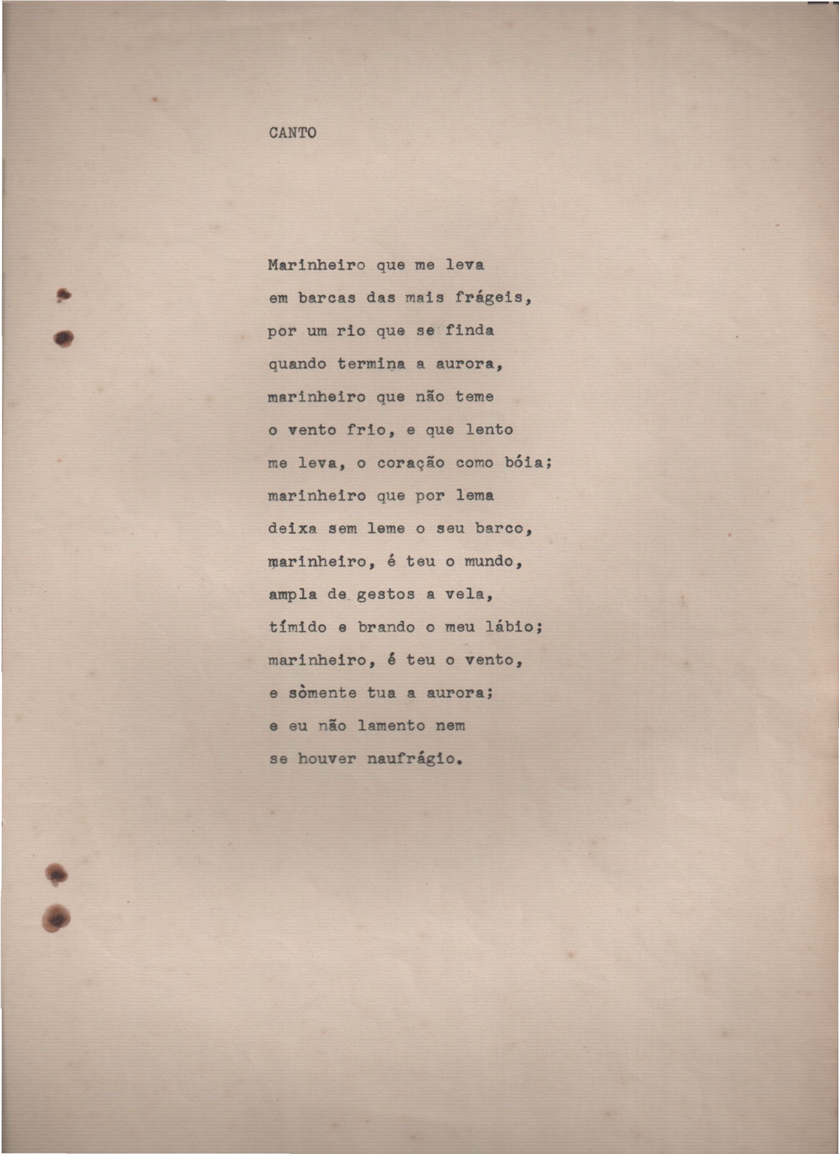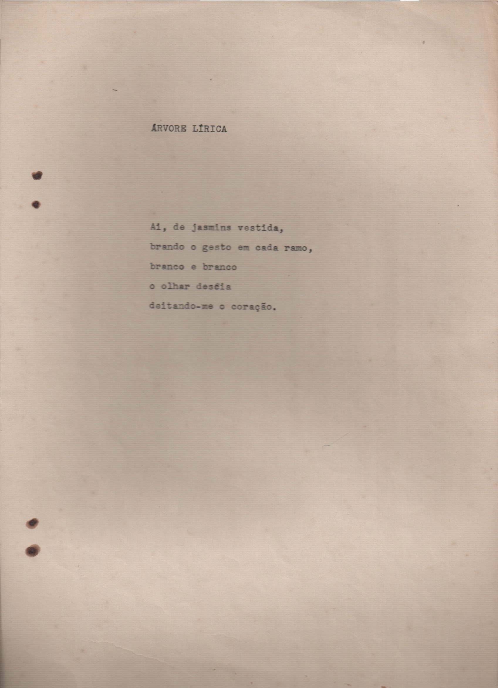 Título atribuído. Poemas: "Árvore lírica", "Salada", "Balada canto do poeta em marcha", "Cafard", "Canto", "Comunicação", "Da criação", "Do amor", "Matinal", "Milenar", "Motivo", "Oferta", "Porto" e "Salmo novo".