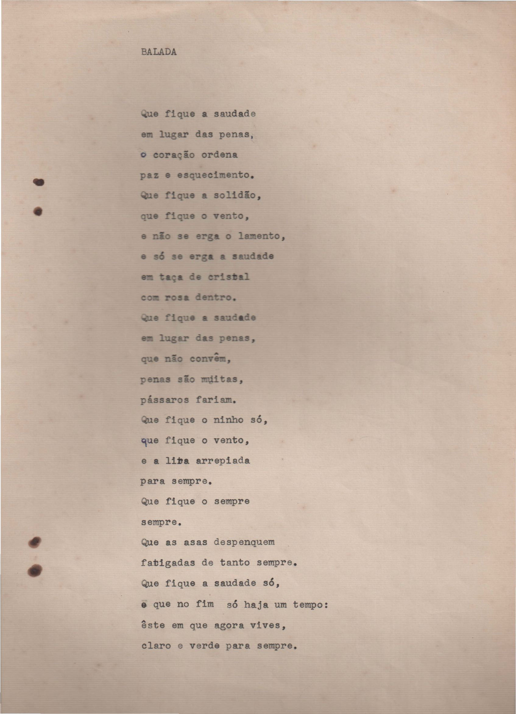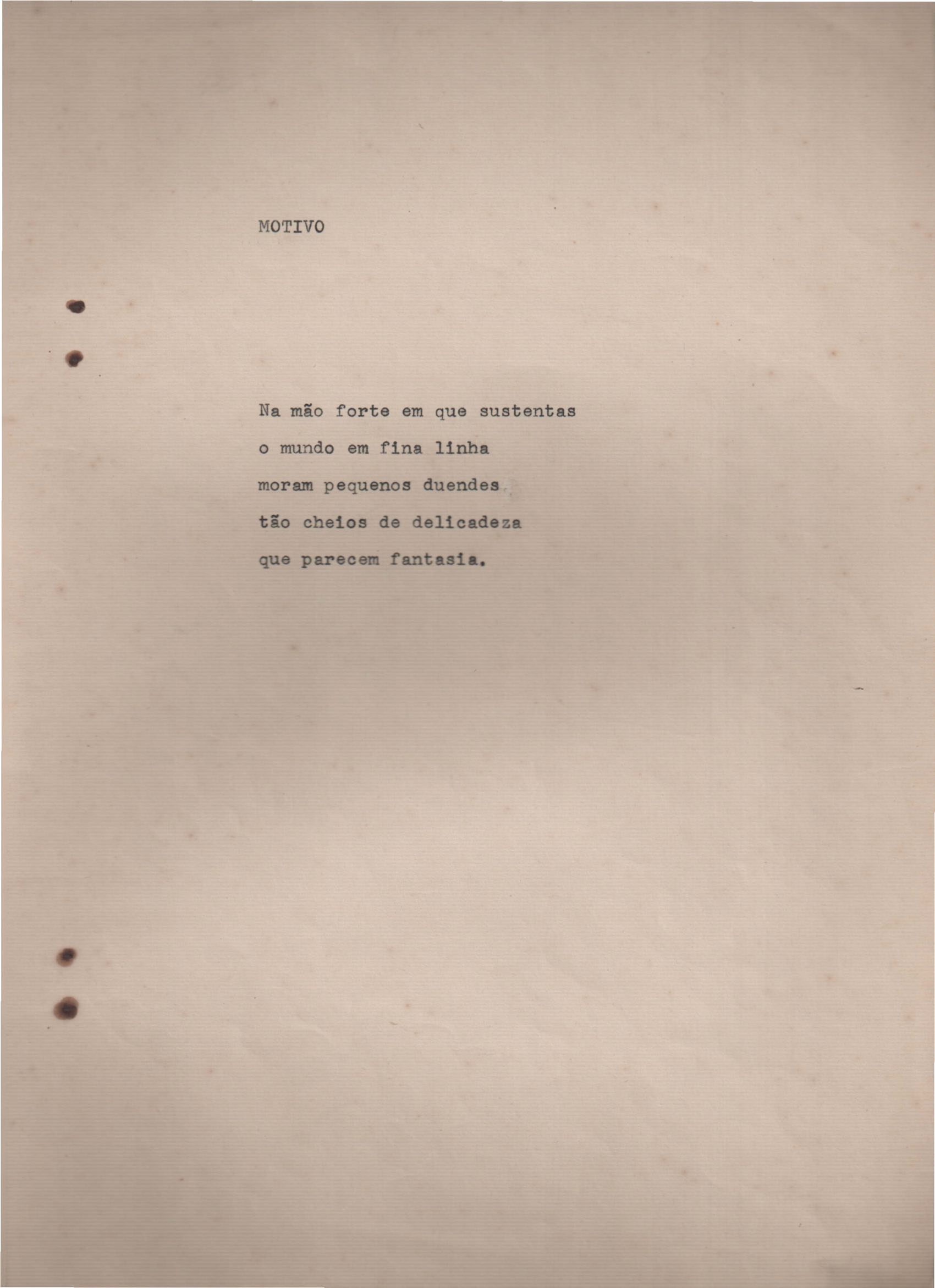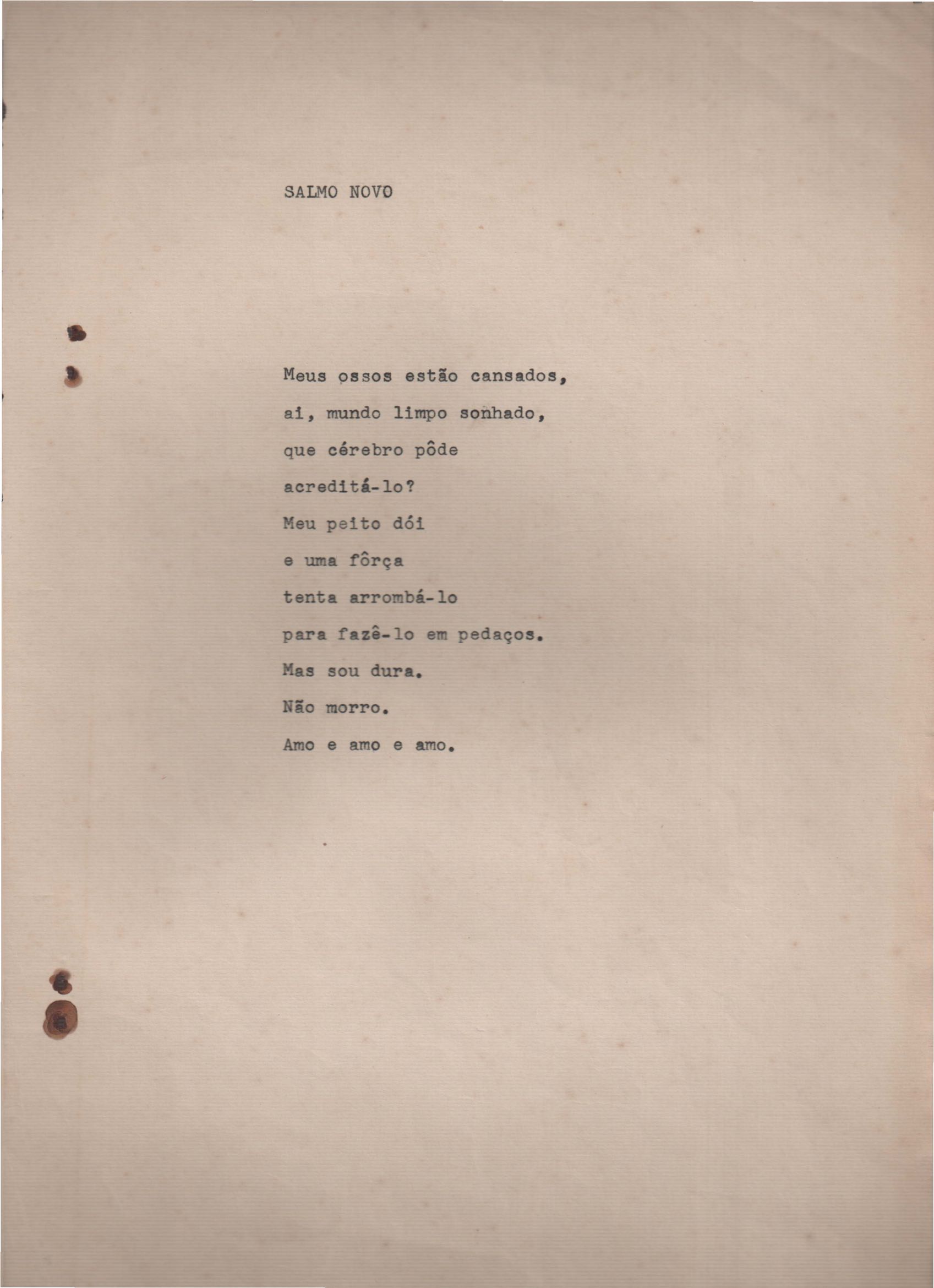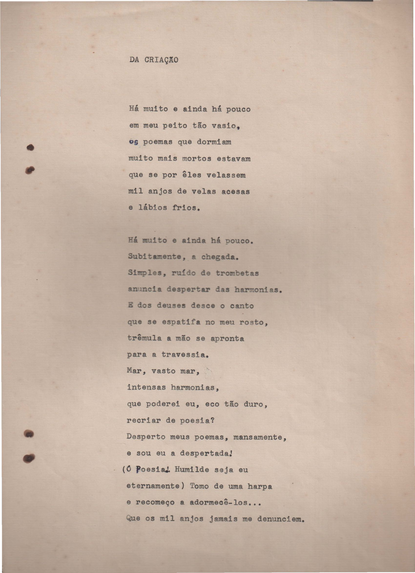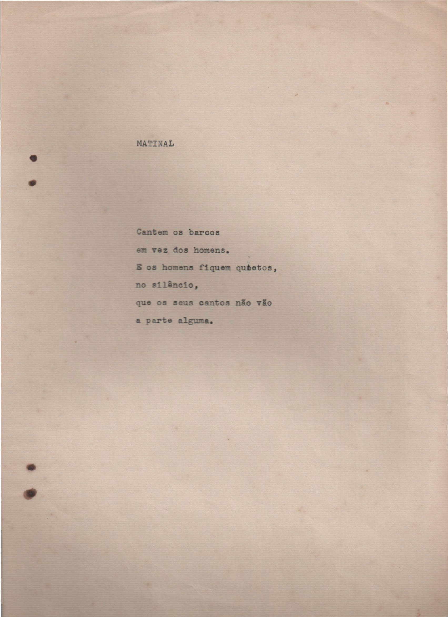 Título atribuído. Poemas: "Árvore lírica", "Salada", "Balada canto do poeta em marcha", "Cafard", "Canto", "Comunicação", "Da criação", "Do amor", "Matinal", "Milenar", "Motivo", "Oferta", "Porto" e "Salmo novo".