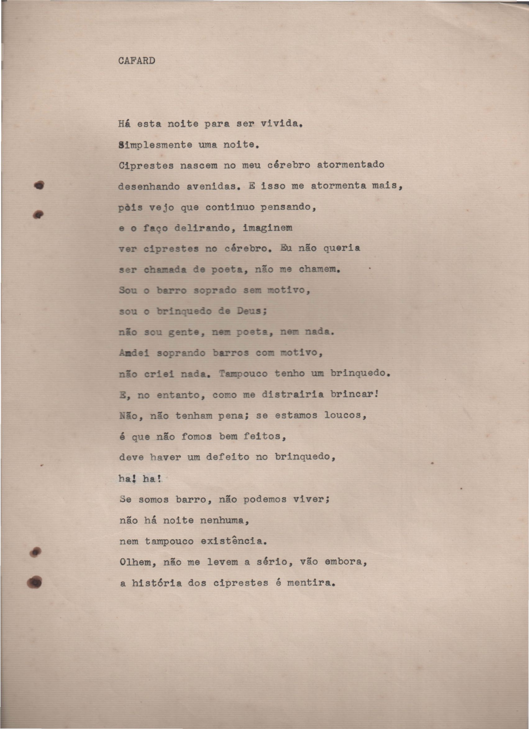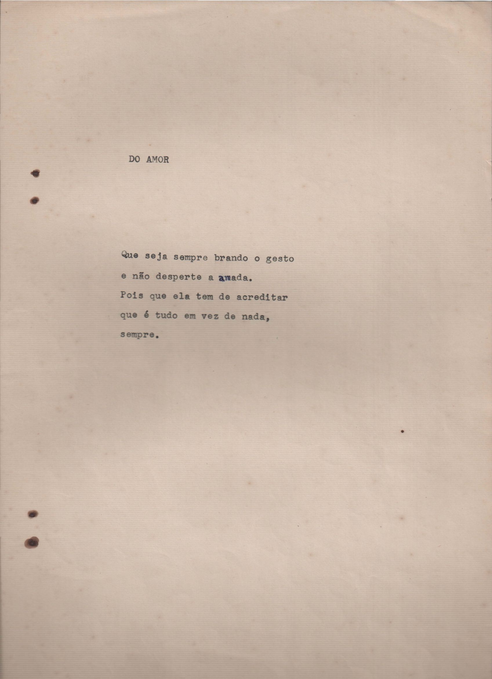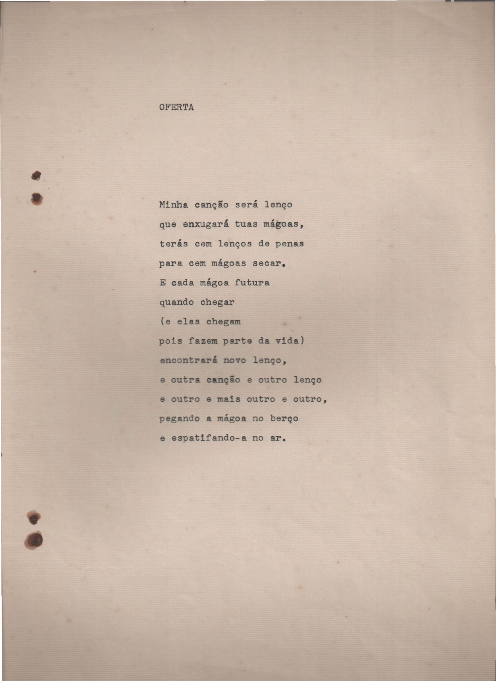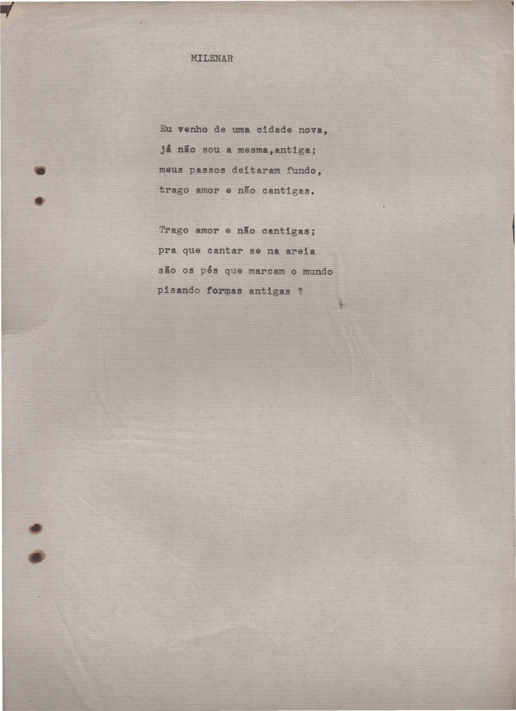 Título atribuído. Poemas: "Árvore lírica", "Salada", "Balada canto do poeta em marcha", "Cafard", "Canto", "Comunicação", "Da criação", "Do amor", "Matinal", "Milenar", "Motivo", "Oferta", "Porto" e "Salmo novo".