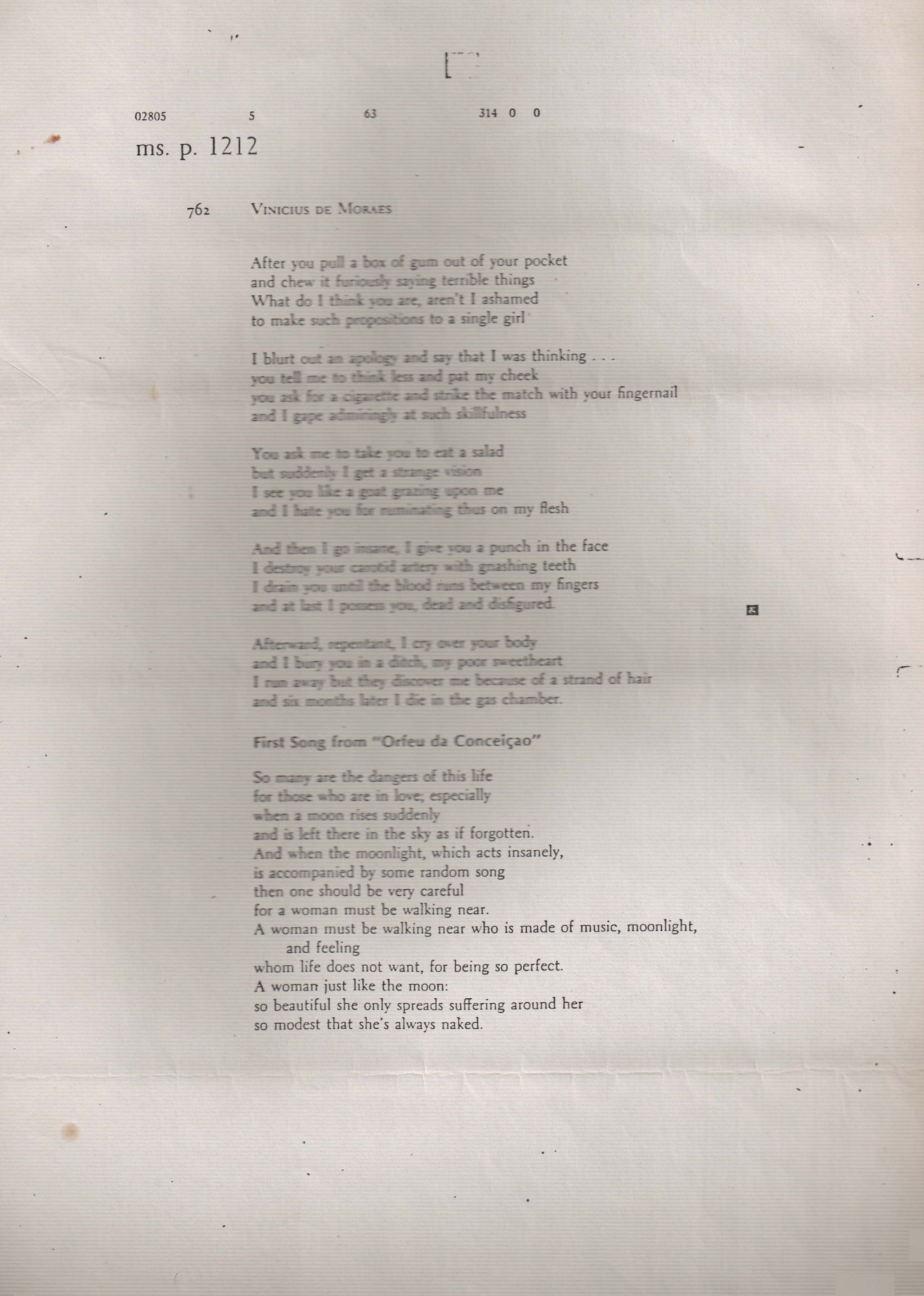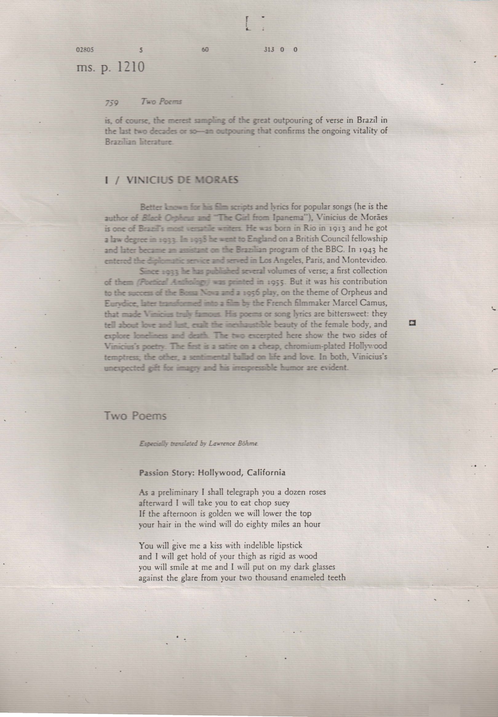 Fotocópia do documento. Quatro páginas do livro The borzoi anthology of latin american literature. New York: Knopf, 1977. Há tradução de alguns poemas de VM por Lawrence Böhme.