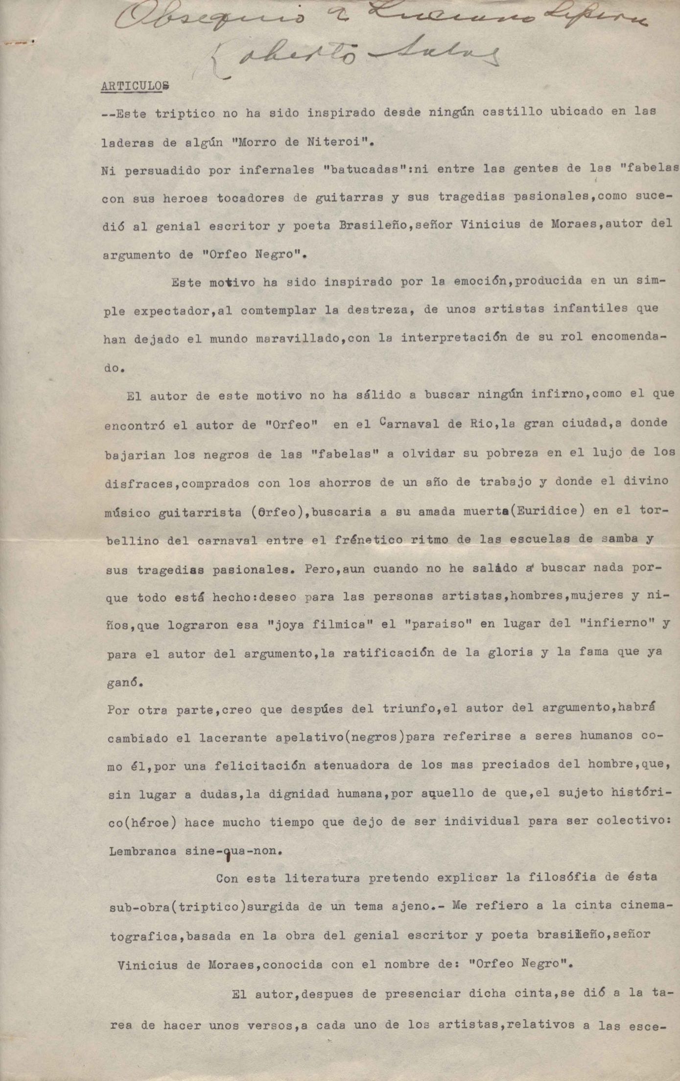 Artigo. Crítica sobre Orfeu negro, de VM.
