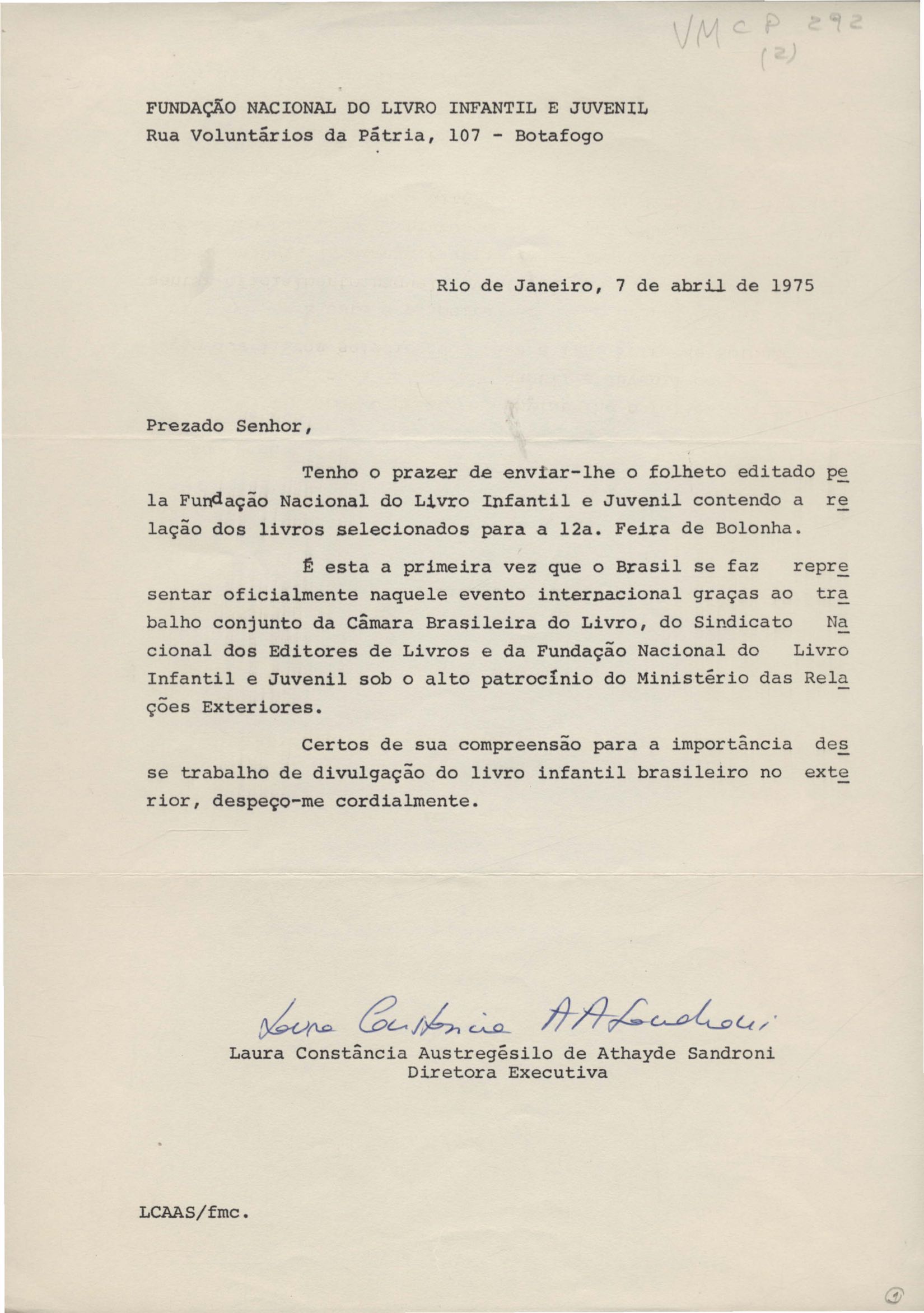Remessa de folheto contendo a relação dos livros selecionados para a 12ª Feira de Bolonha. Informação de que o livro A arca de Noé foi incluído na Feira de Frankfurt.