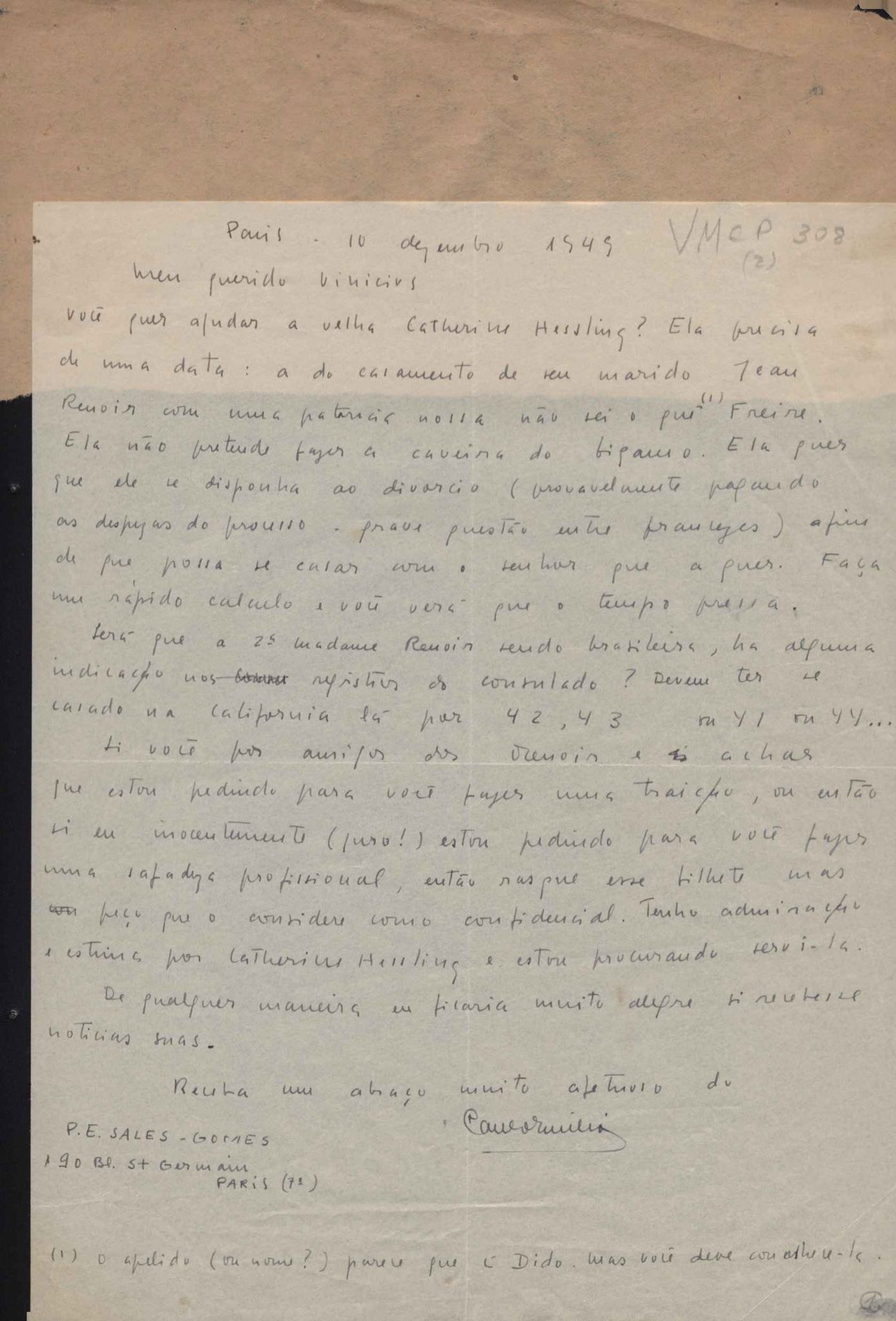 Pedido de ajuda de VM para localizar registro de casamento de Jean Renoir. Referências a Madame Souquet-Basiège, diretora do Hotel des Grands Hommes, que pretende transformar seu hotel em casa de estudantes, intelectuais e professores brasileiros.