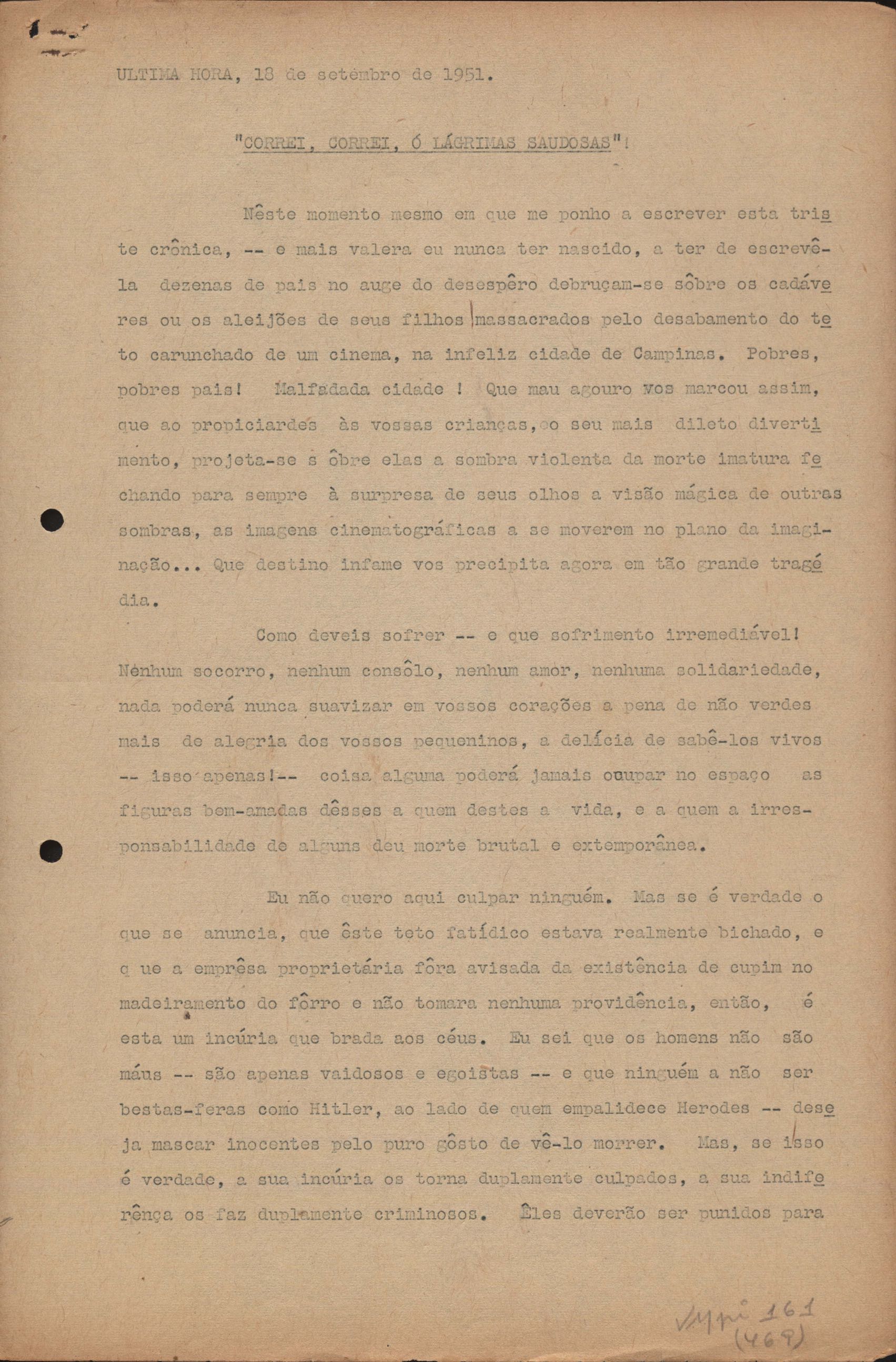 Este registro faz parte do dossiê VMPI161, que contempla artigos escritos e/ou publicados entre 7 jan. 1951 e 21 dez. 1952 para o periódico Última Hora.