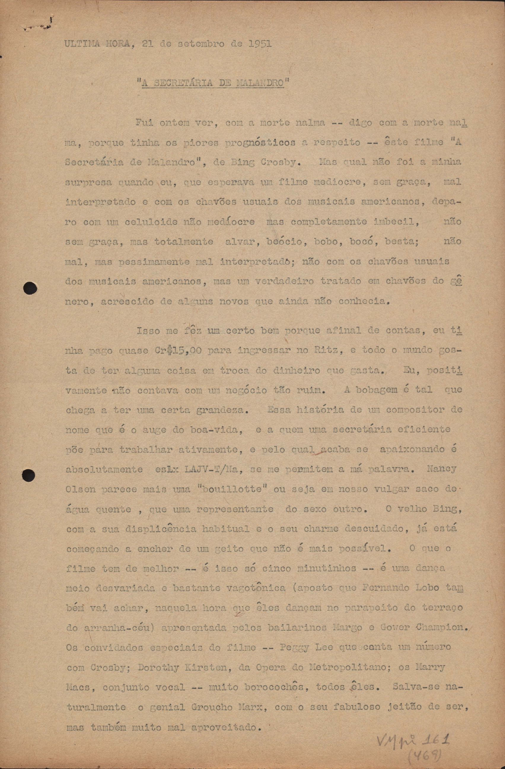 Este registro faz parte do dossiê VMPI161, que contempla artigos escritos e/ou publicados entre 7 jan. 1951 e 21 dez. 1952 para o periódico Última Hora.