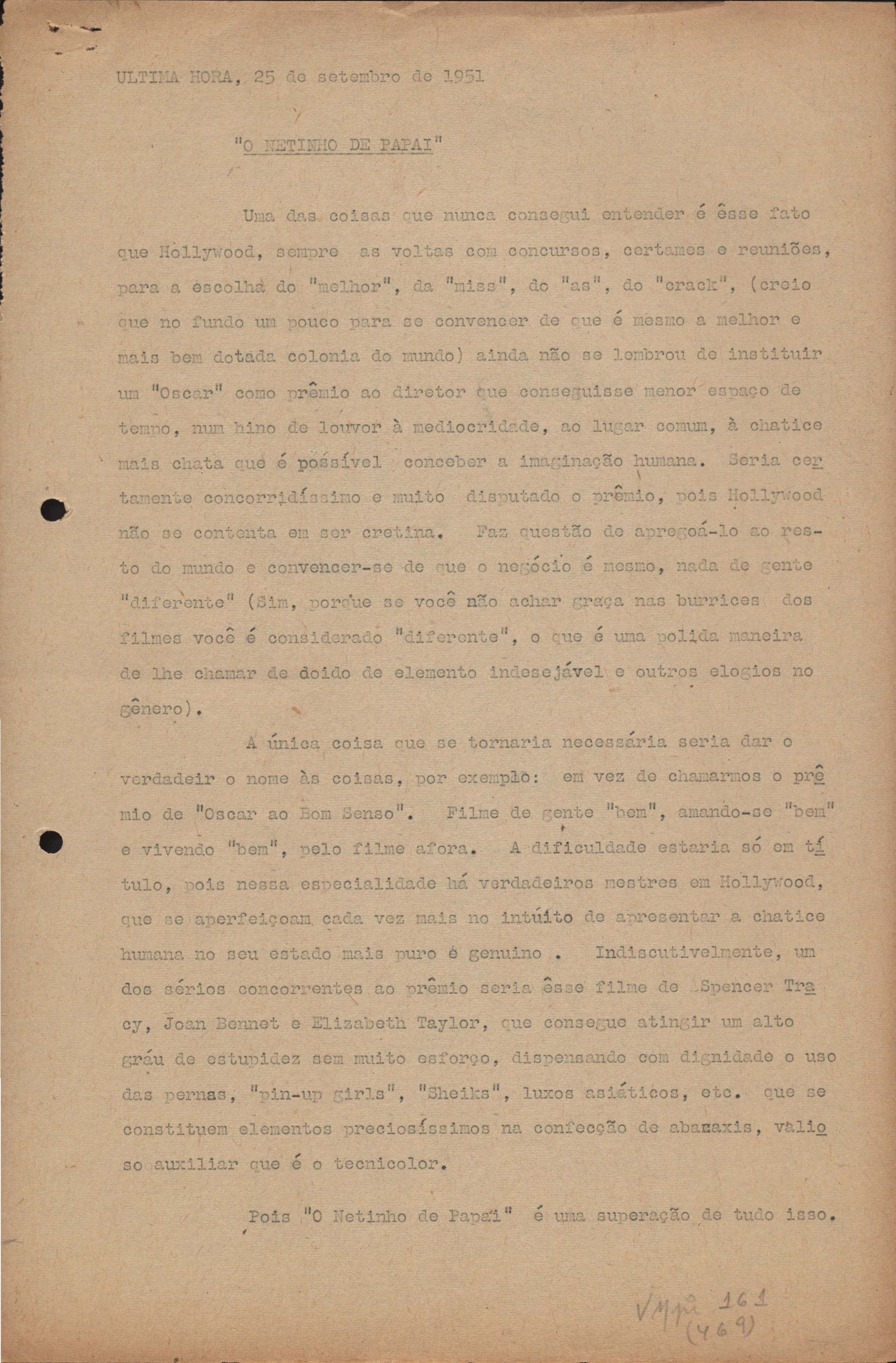 Este registro faz parte do dossiê VMPI161, que contempla artigos escritos e/ou publicados entre 7 jan. 1951 e 21 dez. 1952 para o periódico Última Hora.