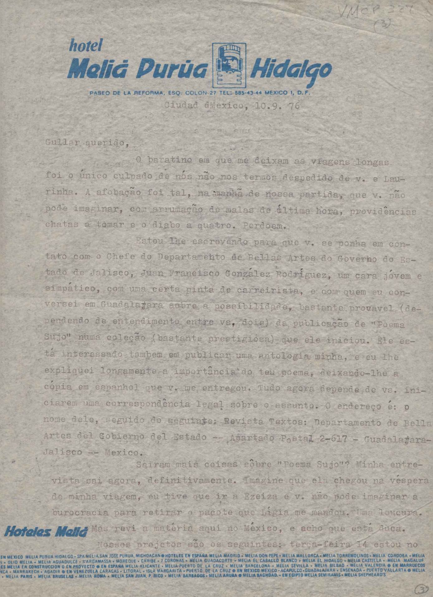 Publicação de poema de VM pela Ediciones de la Flor. Sugestão para que Ferreira Gullar entre em contato com Juan Francisco González Rodríguez, a fim de tentar a publicação de Poema sujo em espanhol.