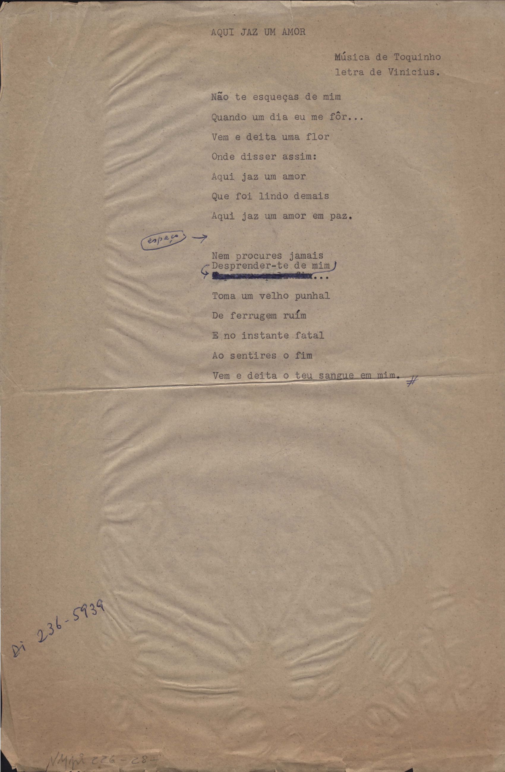 Este documento faz parte do dossiê VMPI226, que contempla um extenso conjunto de letras de música – algumas datadas entre 12 mar. 1966 e 31 maio 1976 –, além de 131 imagens de esboços/rascunhos sem títulos atribuídos (cf. registro VM0PI226_1_195). O dossiê se depara com um problema: a impossibilidade de identificação ou dedução de grande parte das datas. Mesmo que as letras não tenham sido musicalizadas ou publicadas como poemas, ressalva-se que estes originais não podem ser tomados como obra inédita. Ideias, tentativas, escritos inacabados, abandonados ou aproveitados posteriormente com outra forma compõem o dossiê.