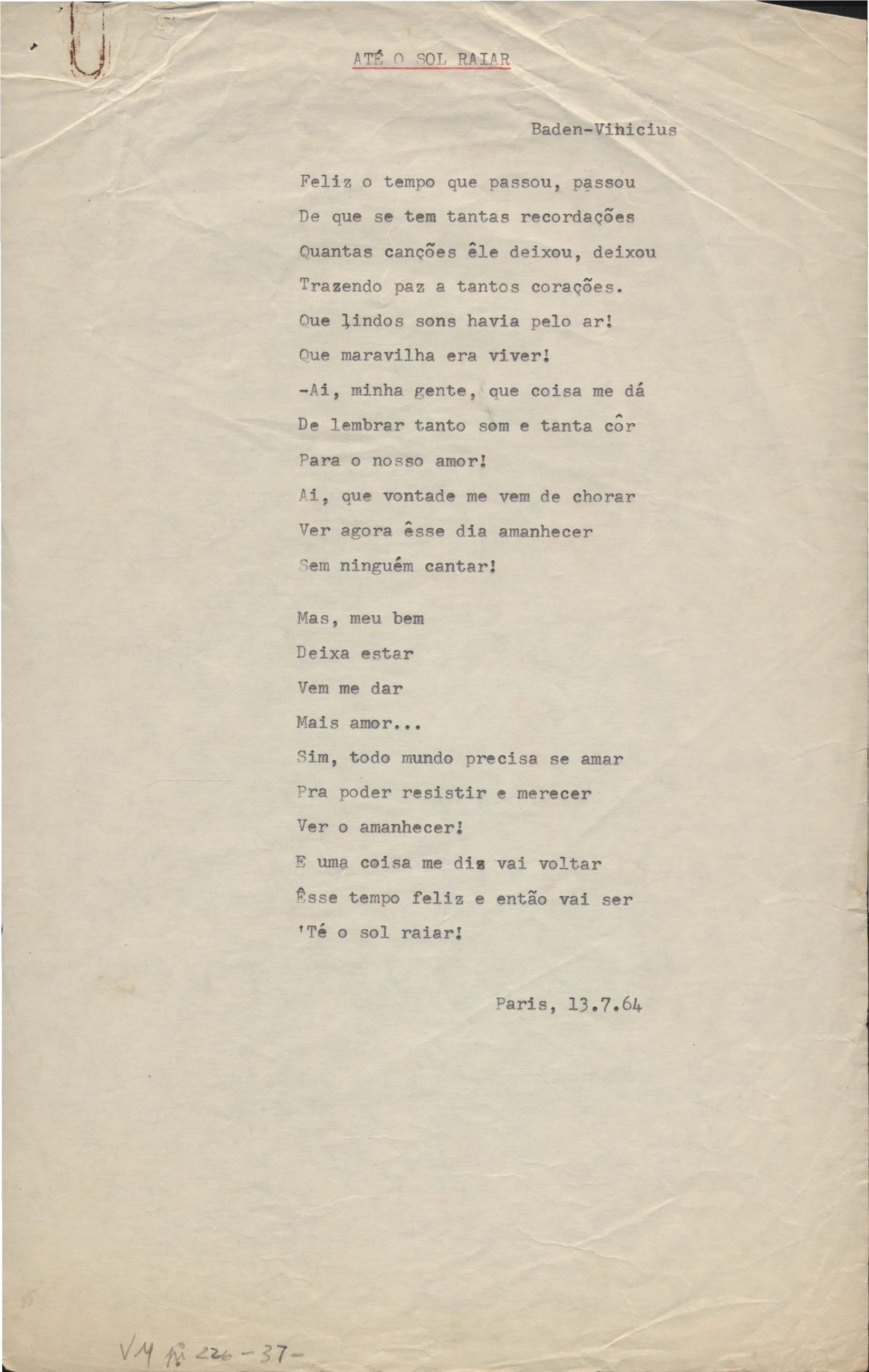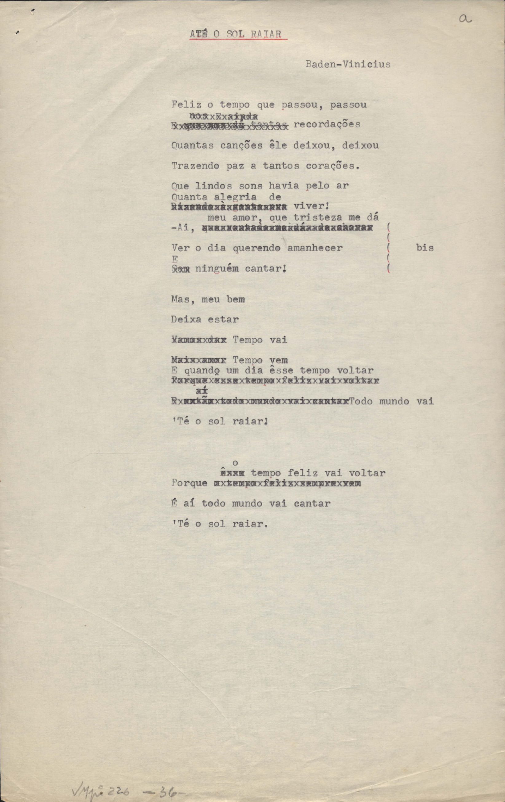 Este documento faz parte do dossiê VMPI226, que contempla um extenso conjunto de letras de música – algumas datadas entre 12 mar. 1966 e 31 maio 1976 –, além de 131 imagens de esboços/rascunhos sem títulos atribuídos (cf. registro VM0PI226_1_195). O dossiê se depara com um problema: a impossibilidade de identificação ou dedução de grande parte das datas. Mesmo que as letras não tenham sido musicalizadas ou publicadas como poemas, ressalva-se que estes originais não podem ser tomados como obra inédita. Ideias, tentativas, escritos inacabados, abandonados ou aproveitados posteriormente com outra forma compõem o dossiê.