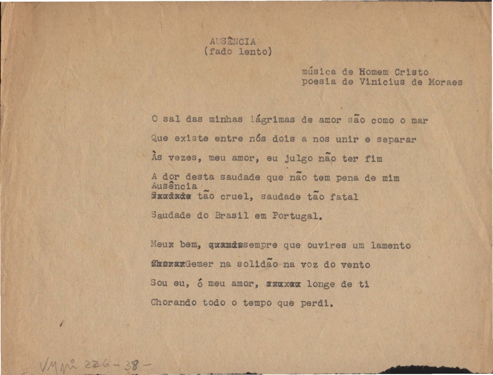 Este documento faz parte do dossiê VMPI226, que contempla um extenso conjunto de letras de música – algumas datadas entre 12 mar. 1966 e 31 maio 1976 –, além de 131 imagens de esboços/rascunhos sem títulos atribuídos (cf. registro VM0PI226_1_195). O dossiê se depara com um problema: a impossibilidade de identificação ou dedução de grande parte das datas. Mesmo que as letras não tenham sido musicalizadas ou publicadas como poemas, ressalva-se que estes originais não podem ser tomados como obra inédita. Ideias, tentativas, escritos inacabados, abandonados ou aproveitados posteriormente com outra forma compõem o dossiê.