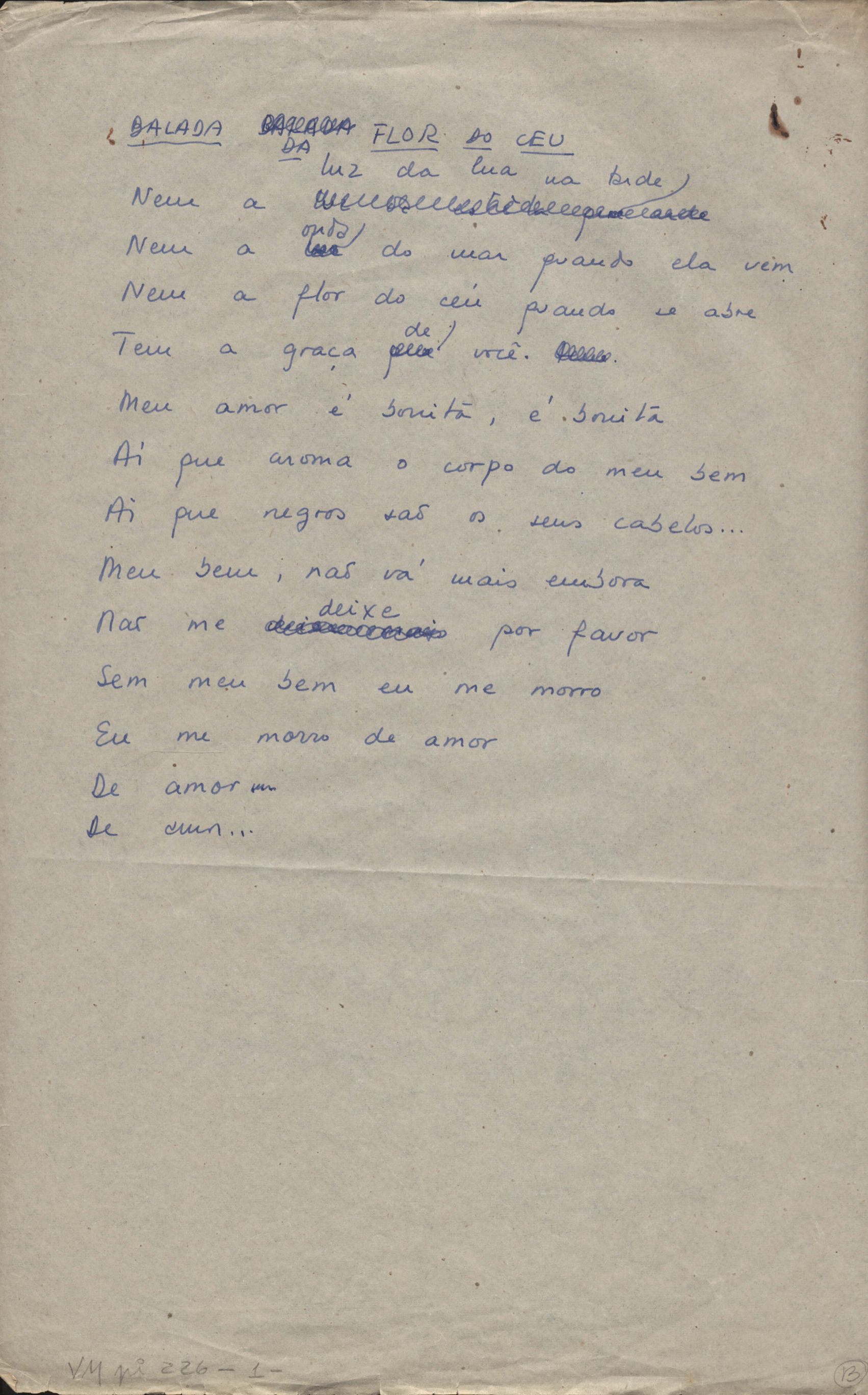 Este documento faz parte do dossiê VMPI226, que contempla um extenso conjunto de letras de música – algumas datadas entre 12 mar. 1966 e 31 maio 1976 –, além de 131 imagens de esboços/rascunhos sem títulos atribuídos (cf. registro VM0PI226_1_195). O dossiê se depara com um problema: a impossibilidade de identificação ou dedução de grande parte das datas. Mesmo que as letras não tenham sido musicalizadas ou publicadas como poemas, ressalva-se que estes originais não podem ser tomados como obra inédita. Ideias, tentativas, escritos inacabados, abandonados ou aproveitados posteriormente com outra forma compõem o dossiê.