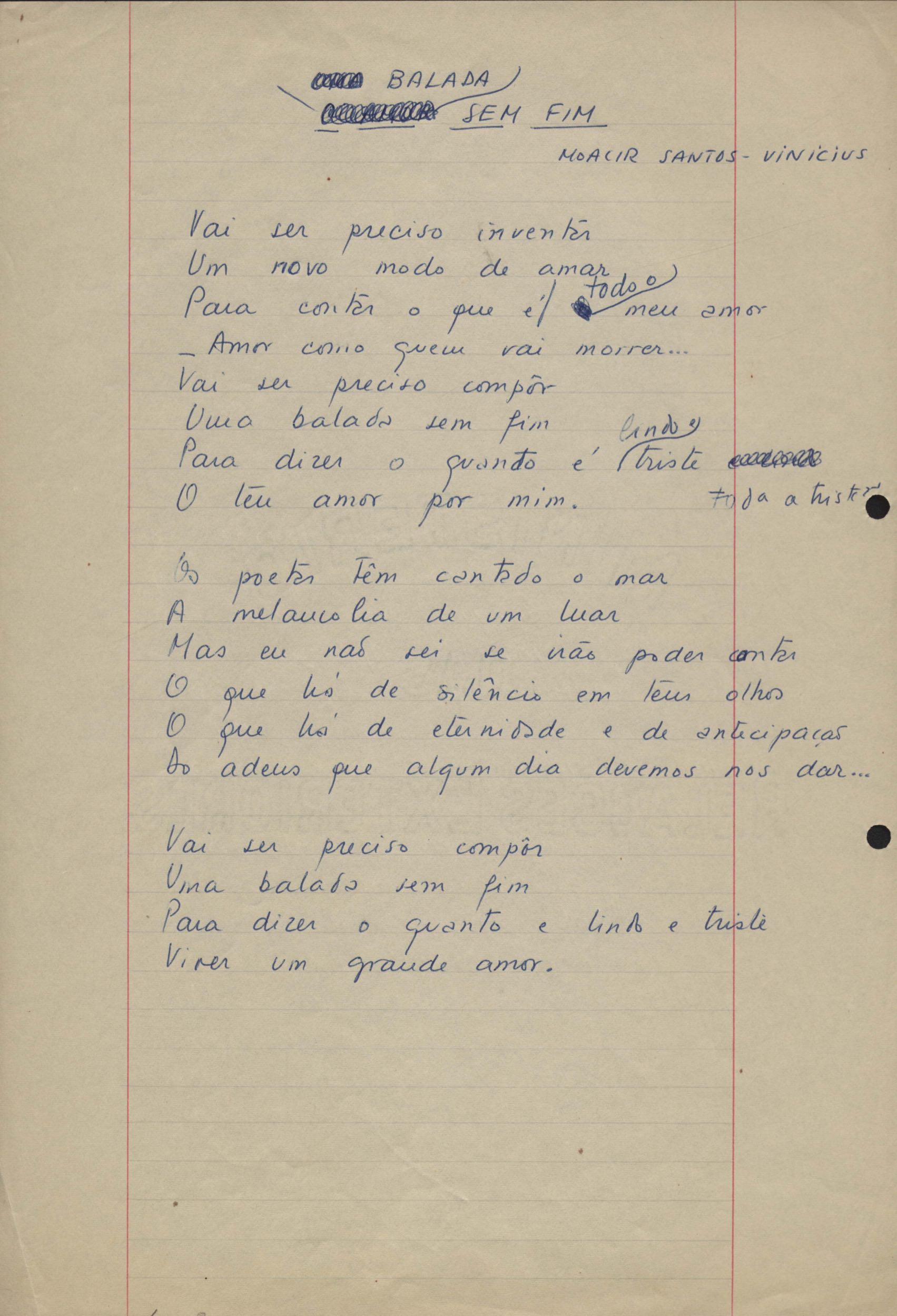 Este documento faz parte do dossiê VMPI226, que contempla um extenso conjunto de letras de música – algumas datadas entre 12 mar. 1966 e 31 maio 1976 –, além de 131 imagens de esboços/rascunhos sem títulos atribuídos (cf. registro VM0PI226_1_195). O dossiê se depara com um problema: a impossibilidade de identificação ou dedução de grande parte das datas. Mesmo que as letras não tenham sido musicalizadas ou publicadas como poemas, ressalva-se que estes originais não podem ser tomados como obra inédita. Ideias, tentativas, escritos inacabados, abandonados ou aproveitados posteriormente com outra forma compõem o dossiê.