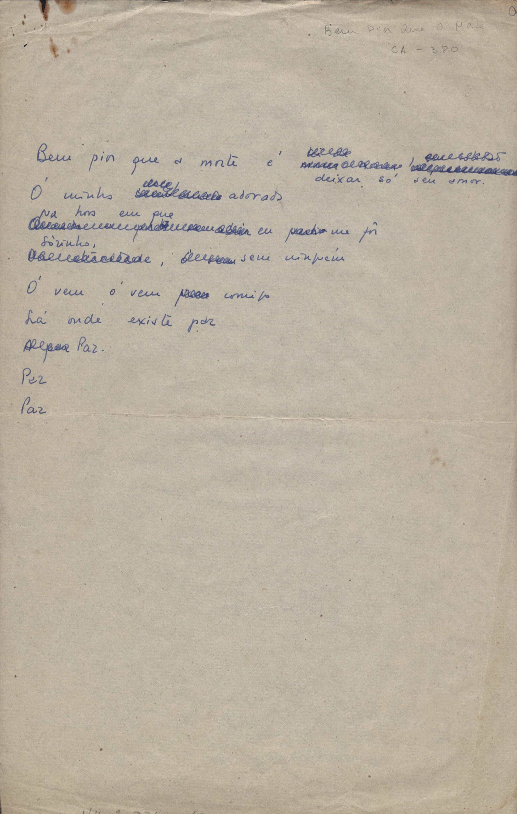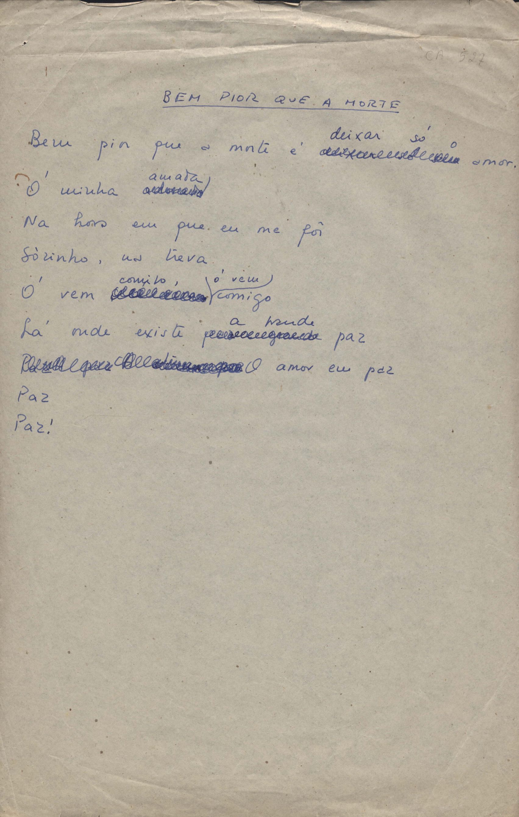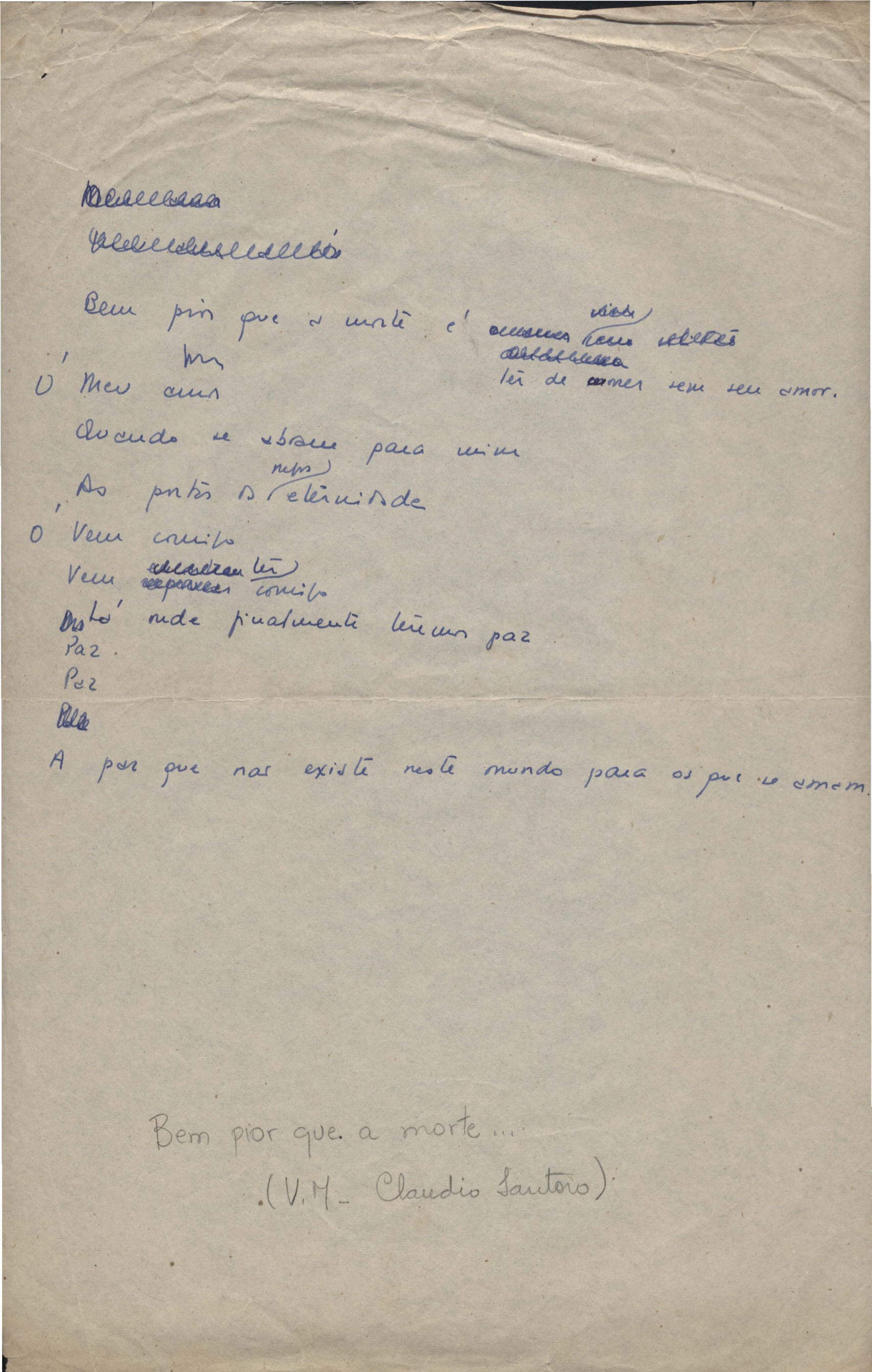 Este documento faz parte do dossiê VMPI226, que contempla um extenso conjunto de letras de música – algumas datadas entre 12 mar. 1966 e 31 maio 1976 –, além de 131 imagens de esboços/rascunhos sem títulos atribuídos (cf. registro VM0PI226_1_195). O dossiê se depara com um problema: a impossibilidade de identificação ou dedução de grande parte das datas. Mesmo que as letras não tenham sido musicalizadas ou publicadas como poemas, ressalva-se que estes originais não podem ser tomados como obra inédita. Ideias, tentativas, escritos inacabados, abandonados ou aproveitados posteriormente com outra forma compõem o dossiê.