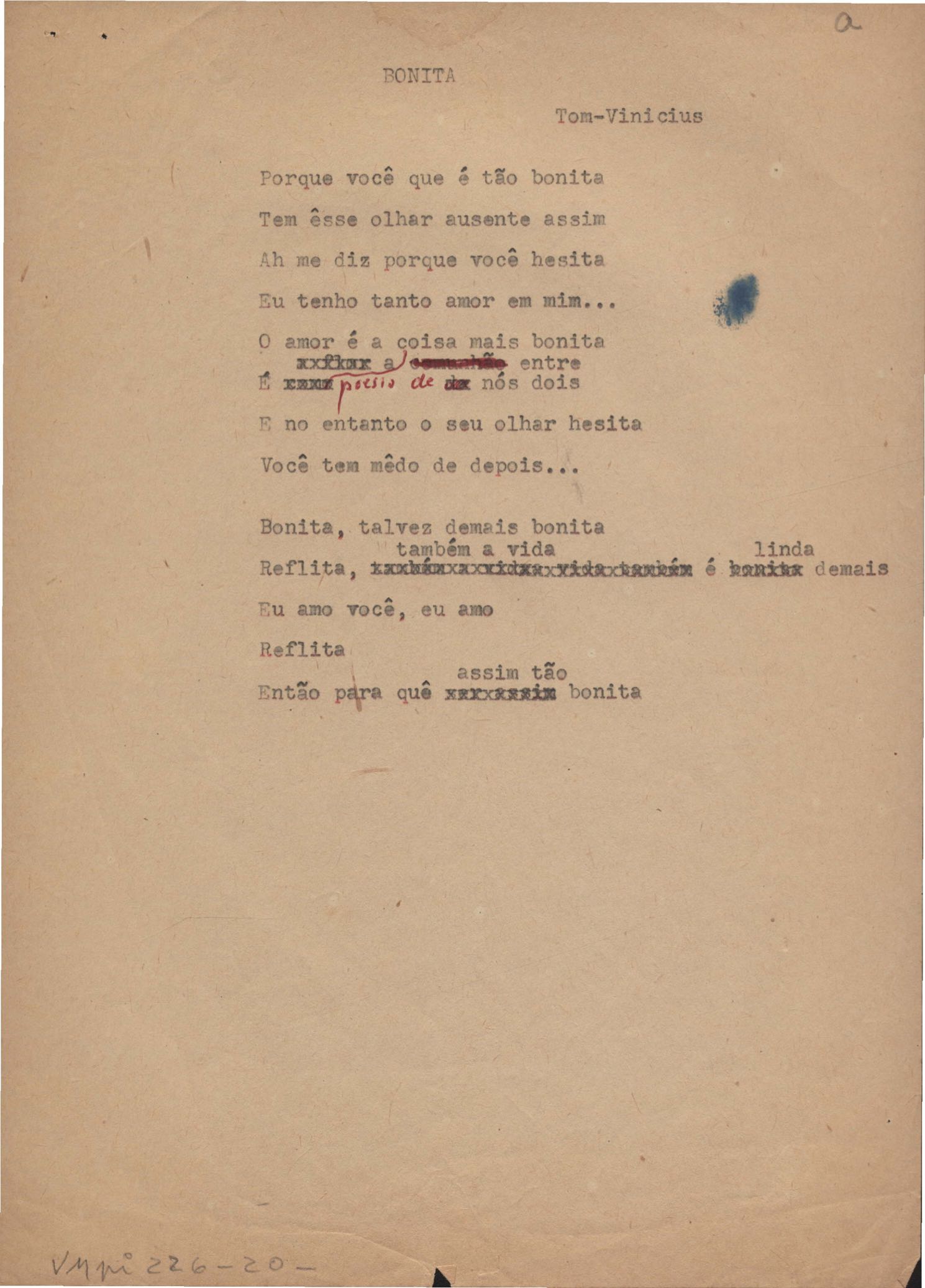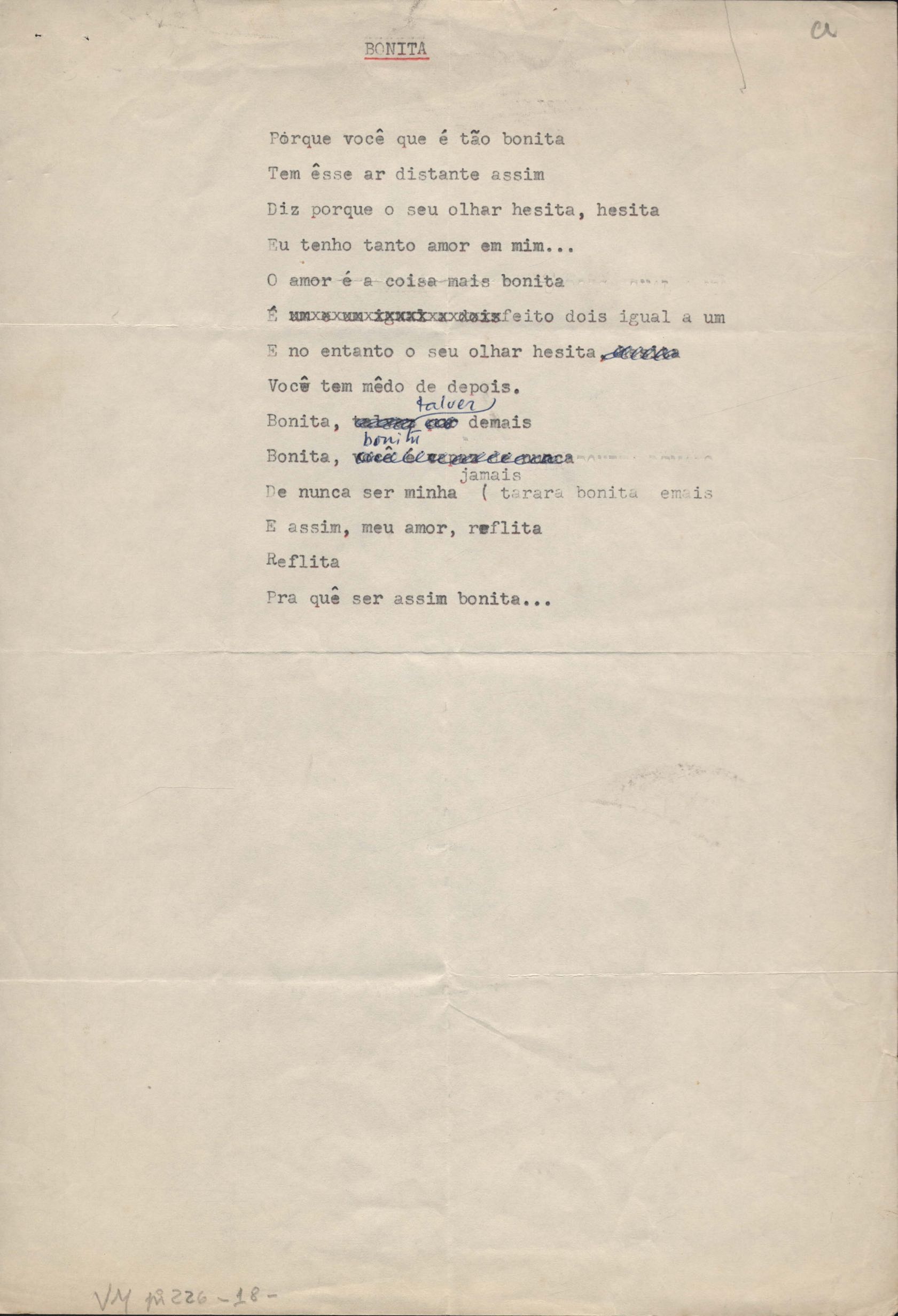 Este documento faz parte do dossiê VMPI226, que contempla um extenso conjunto de letras de música – algumas datadas entre 12 mar. 1966 e 31 maio 1976 –, além de 131 imagens de esboços/rascunhos sem títulos atribuídos (cf. registro VM0PI226_1_195). O dossiê se depara com um problema: a impossibilidade de identificação ou dedução de grande parte das datas. Mesmo que as letras não tenham sido musicalizadas ou publicadas como poemas, ressalva-se que estes originais não podem ser tomados como obra inédita. Ideias, tentativas, escritos inacabados, abandonados ou aproveitados posteriormente com outra forma compõem o dossiê.