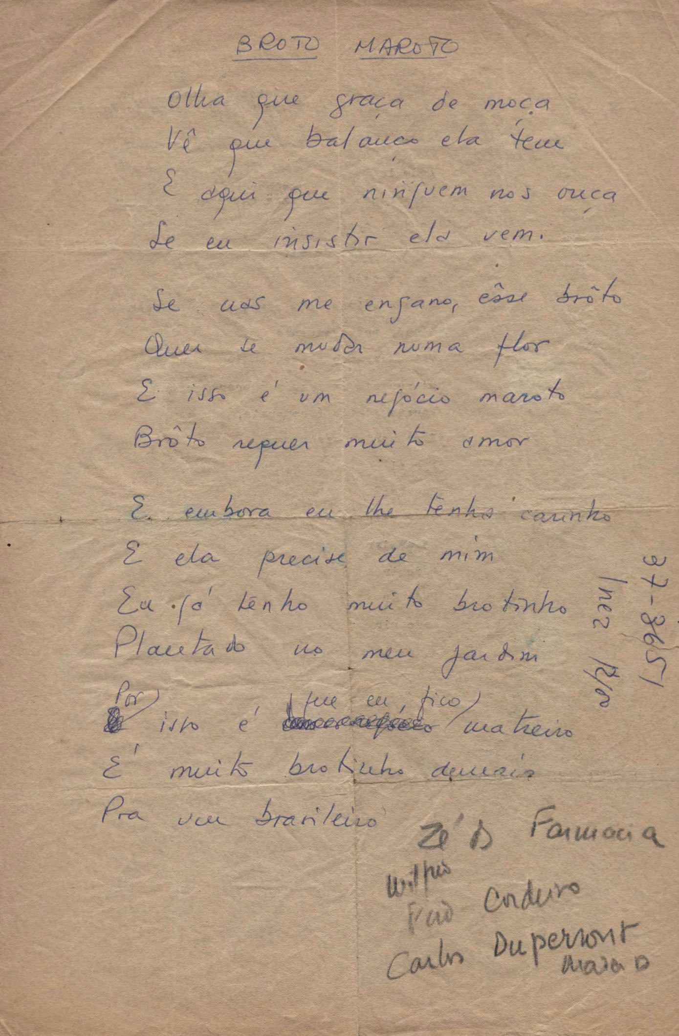 Este documento faz parte do dossiê VMPI226, que contempla um extenso conjunto de letras de música – algumas datadas entre 12 mar. 1966 e 31 maio 1976 –, além de 131 imagens de esboços/rascunhos sem títulos atribuídos (cf. registro VM0PI226_1_195). O dossiê se depara com um problema: a impossibilidade de identificação ou dedução de grande parte das datas. Mesmo que as letras não tenham sido musicalizadas ou publicadas como poemas, ressalva-se que estes originais não podem ser tomados como obra inédita. Ideias, tentativas, escritos inacabados, abandonados ou aproveitados posteriormente com outra forma compõem o dossiê.